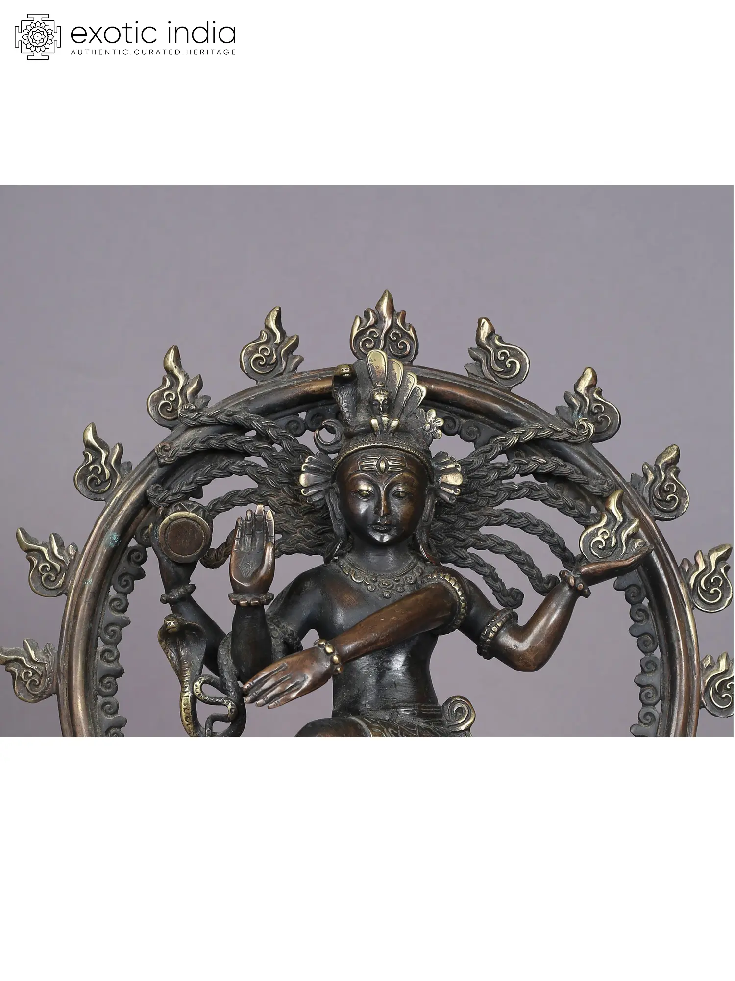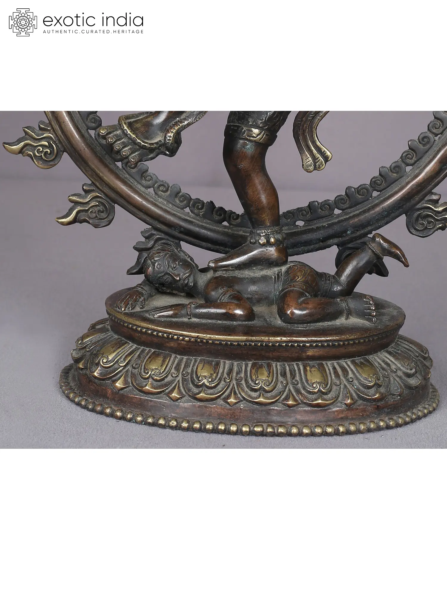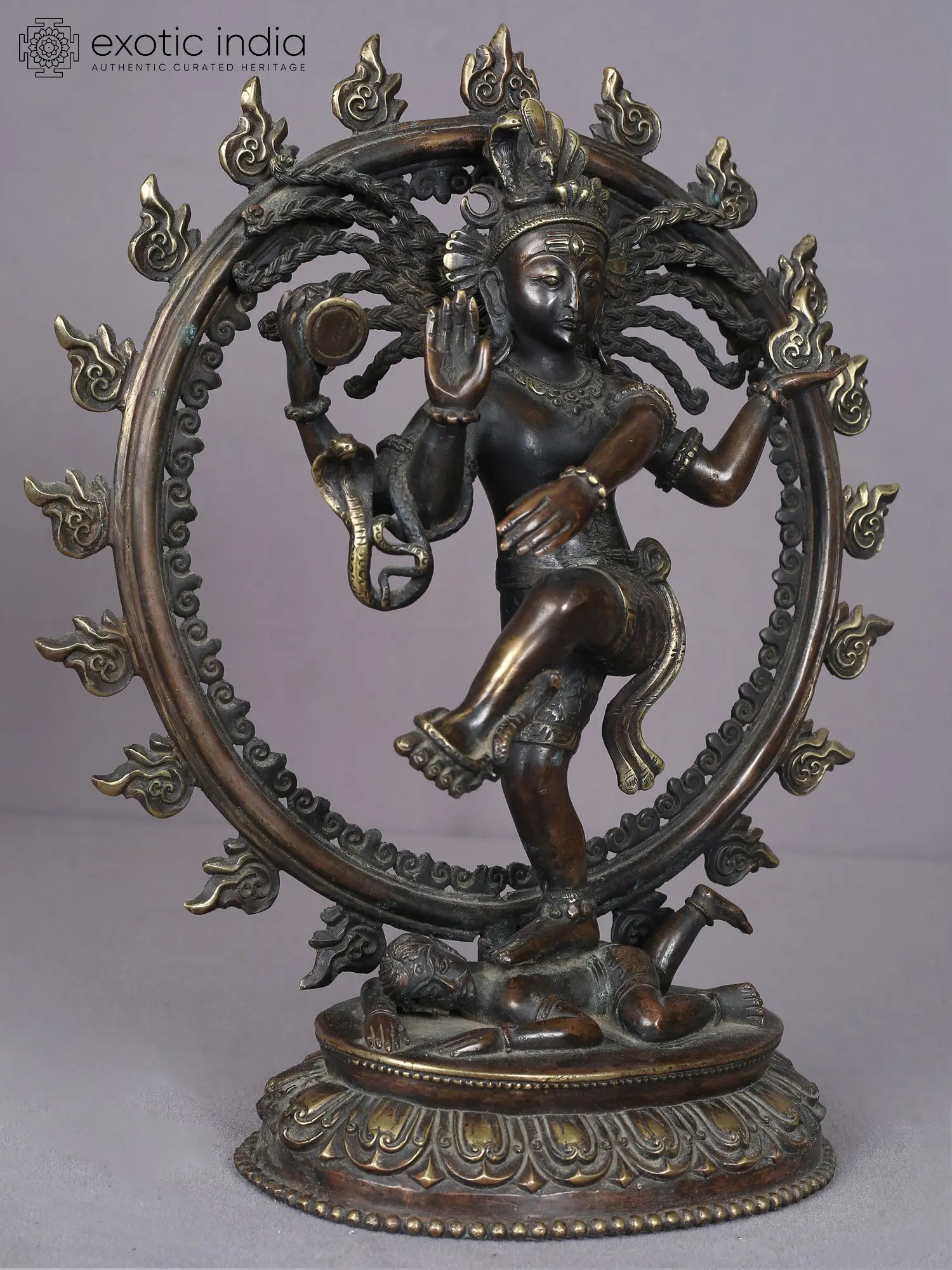 A typical Nepalese lotus pedestal has been offered to Nataraja who balances his dynamic form marvelously on Apasmara, who from a plump demon of bronzes has been transformed into a mature male figure in the brass statue. Nataraja on the other hand appears younger than the bronze dancing Shiva idols, with a boyishness on his face, balanced by the Tripunda and third-eye which bring a profound maturity. The headgear of Nataraja is an elaborate element, embellished by the crescent moon, Ganga, serpent, and flower, followed by braided tresses (Jata) which flow majestically on each side of the statue.