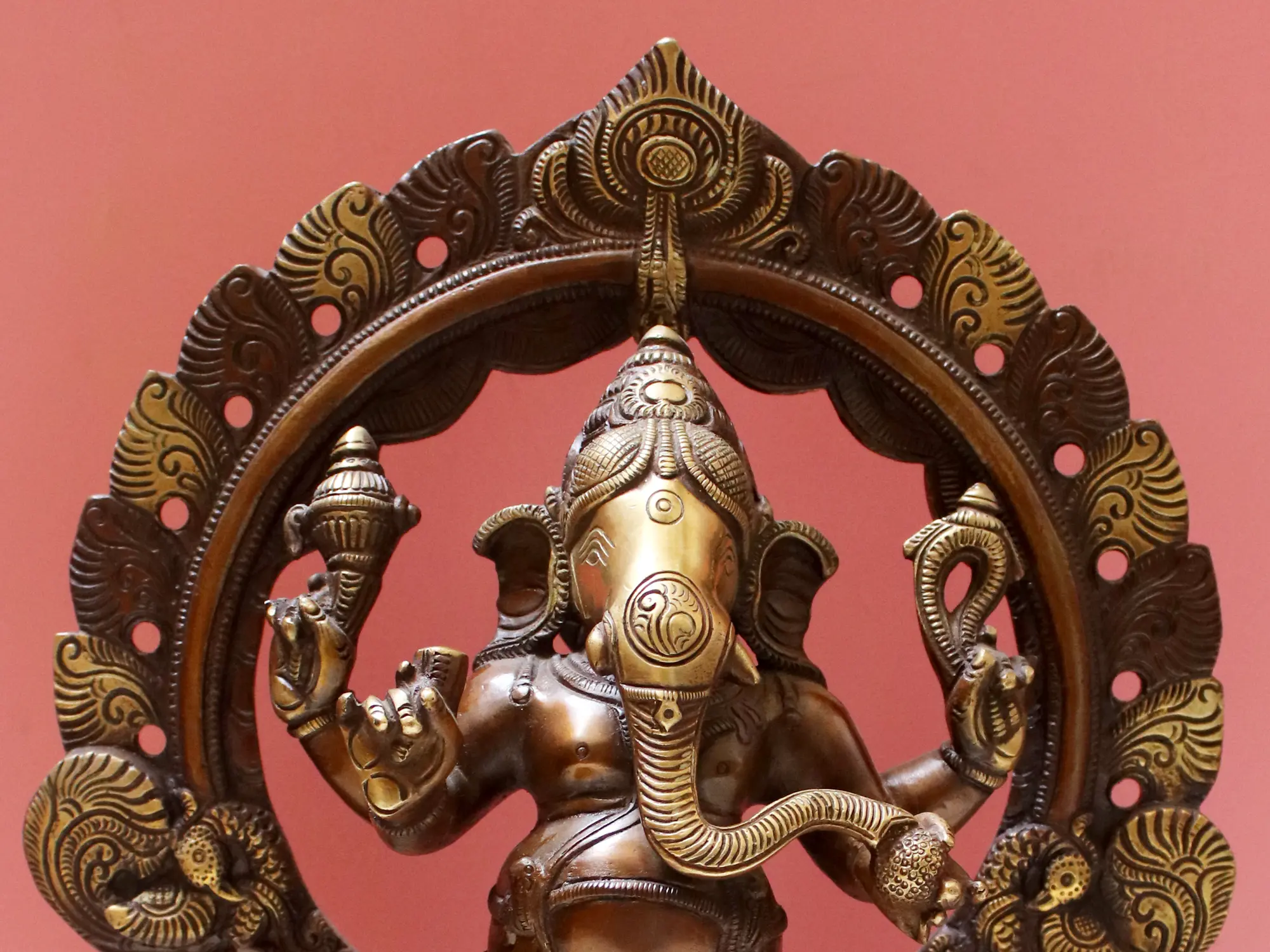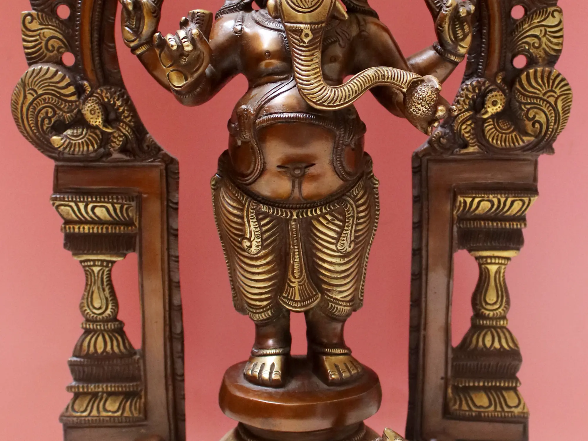 The grandeur of this Ganesha statue is further enhanced by the ornate arch that frames him. This decorative element, reminiscent of temple gateways and sacred mandalas, adds an aura of sacredness and completeness to the artwork. The careful sculpting of the floral motifs and architectural details on the arch and pedestal showcase the skill and dedication of the artisans. The rich, dark patina of the brass lends an antique feel, suggesting a lineage of tradition and devotion passed down through generations. Placing this sculpture in your environment is believed to invite positive energy, prosperity, and spiritual well-being. It serves as a constant reminder to approach challenges with wisdom and perseverance, knowing that the Remover of Obstacles is always present. Whether you are seeking to usher in a new venture, overcome personal hurdles, or simply wish to infuse your surroundings with divine grace, this four-armed standing Ganesha in brass is a powerful and beautiful embodiment of these aspirations. It is a timeless treasure that will be cherished for years to come.