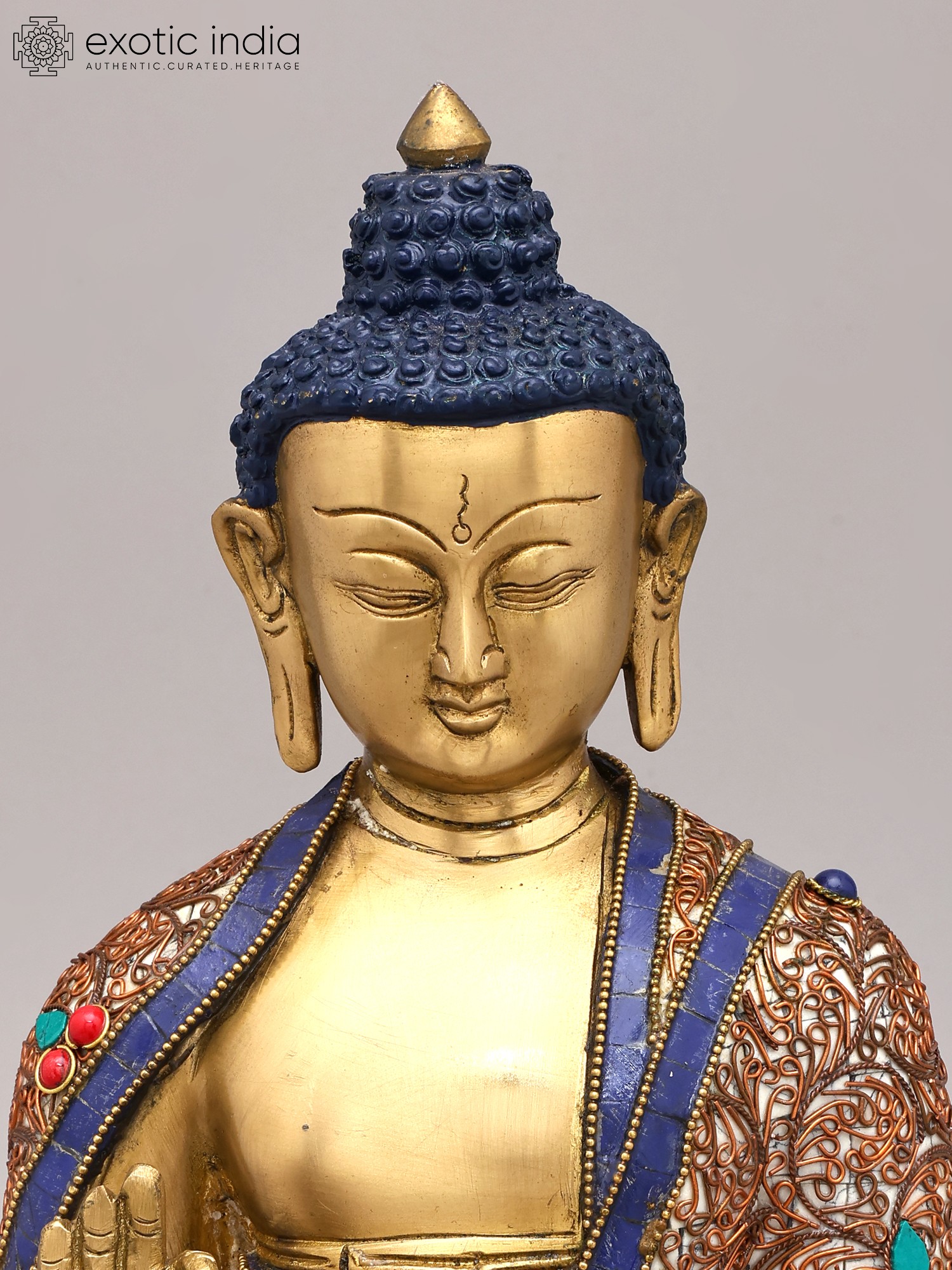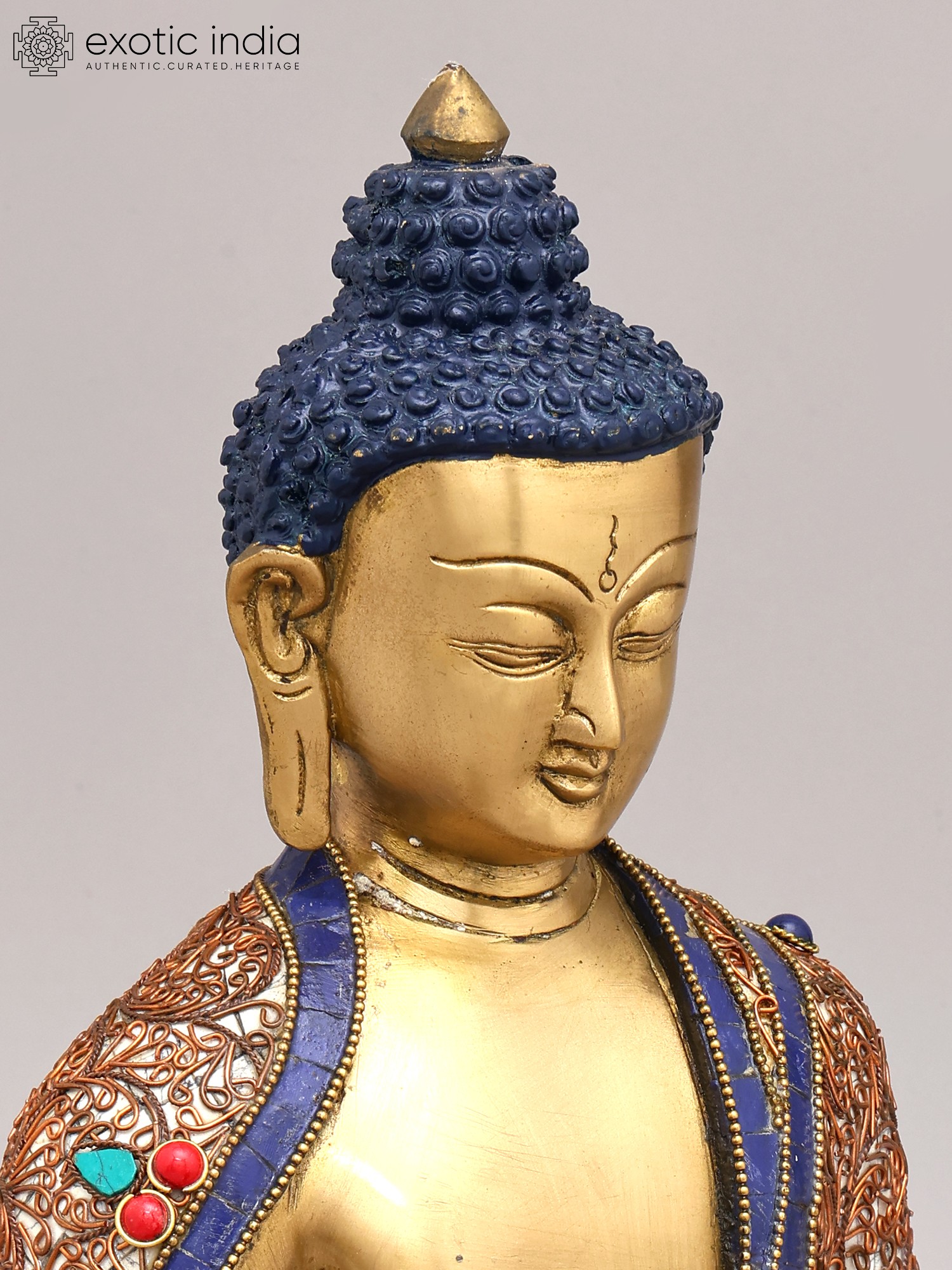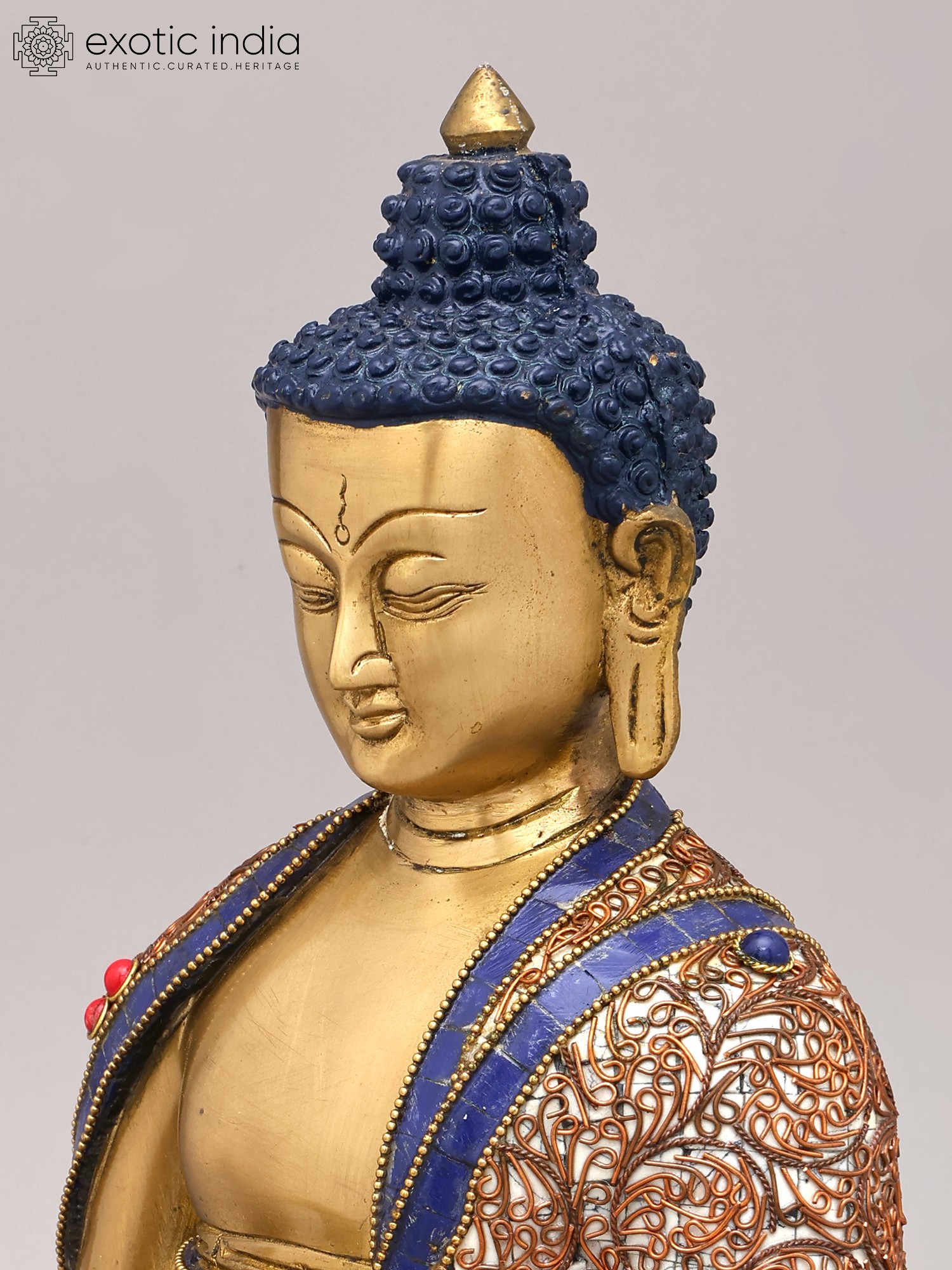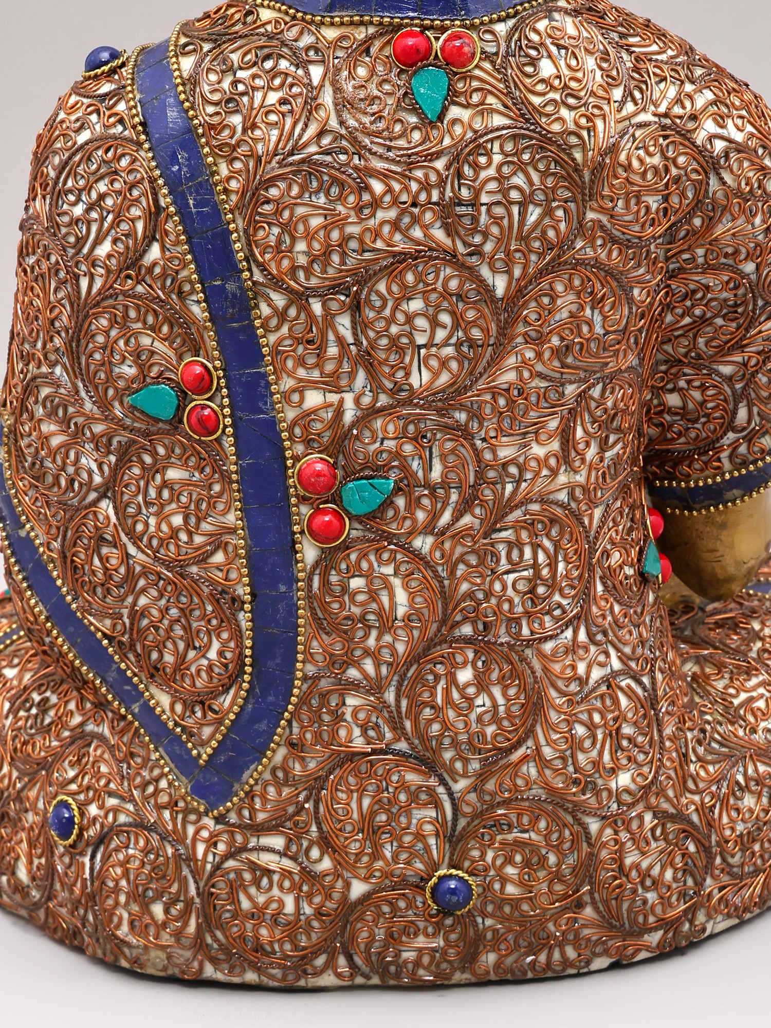 The artistry of this statue is further elevated by its stunning inlay work. Rich, vibrant gemstones are expertly set into the intricate patterns adorning the Buddha's robes. These carefully chosen stones, such as ruby red and turquoise green, not only add a visual splendor but also carry symbolic significance. Rubies have long been associated with vitality and protection, while turquoise is believed to promote healing and wisdom. The delicate scrollwork and geometric motifs intricately woven into the fabric of his garments speak to the complexity and beauty of the universe, a universe illuminated by the Buddha's teachings. The deep blue accents, reminiscent of lapis lazuli, evoke the vastness of the sky and the depth of spiritual understanding.