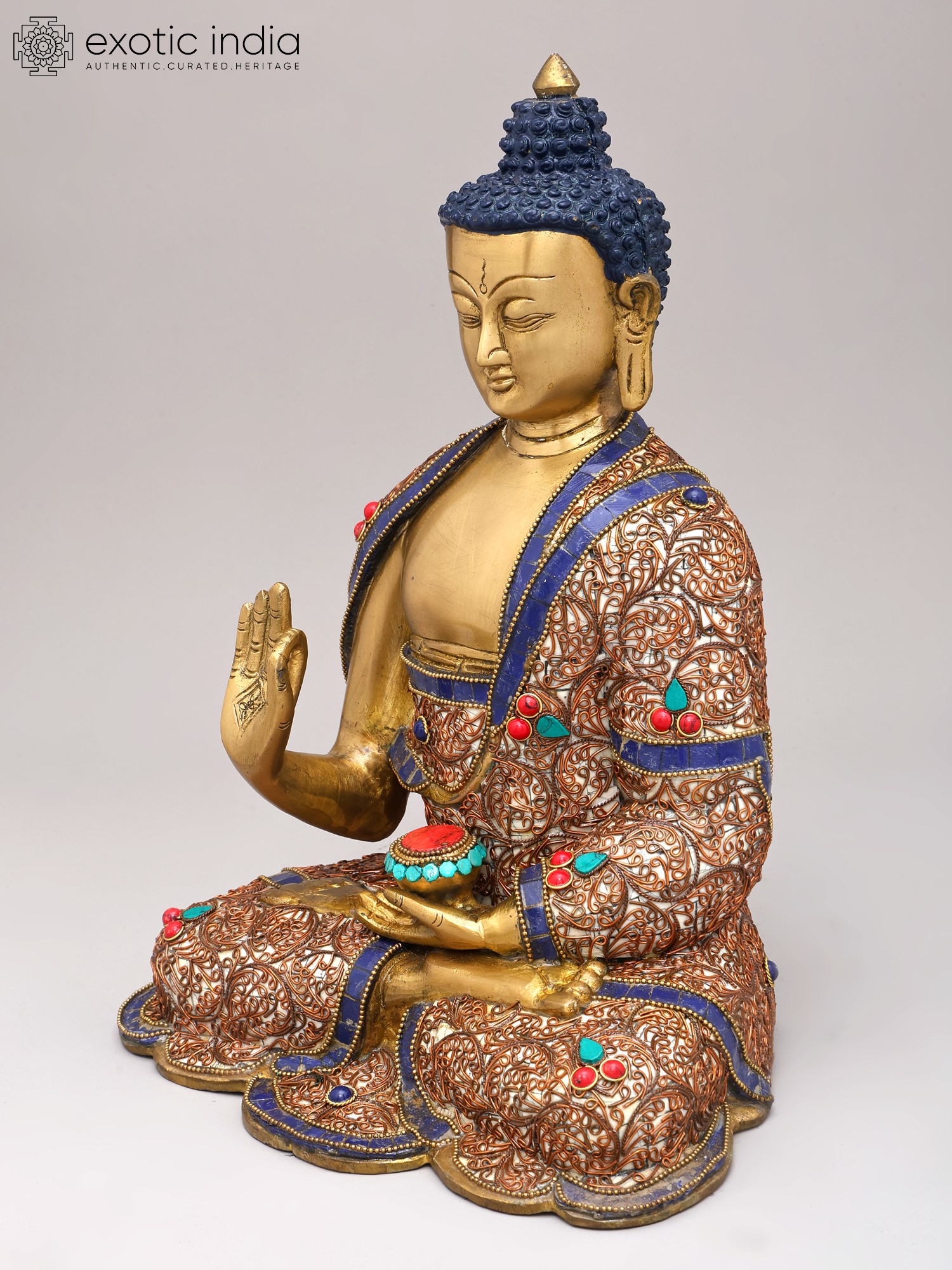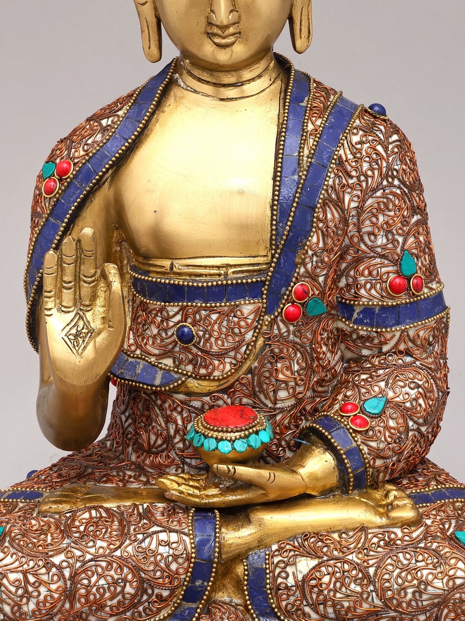 The gesture of the Buddha's right hand, raised with palm outward, is known as the Abhaya Mudra, symbolizing fearlessness and protection. It conveys a message of reassurance and dispels doubt and ignorance, much like the Dharma itself, which offers a path to liberation from suffering. In his left hand, he cradles a small bowl, often interpreted as representing the elixir of immortality or the receptacle for offerings, signifying abundance and the nourishing nature of his teachings. The serene expression, with downcast eyes and a gentle smile, embodies profound wisdom and infinite compassion, reflecting the qualities of a fully awakened being. This pose is a direct visual representation of the Buddha's commitment to guiding all sentient beings towards the cessation of suffering, a central tenet of Buddhist philosophy. The meticulous craftsmanship, passed down through generations of Indian artisans, imbues this sacred figure with a spiritual gravitas that resonates with the profound legacy of the Buddha's enlightenment.