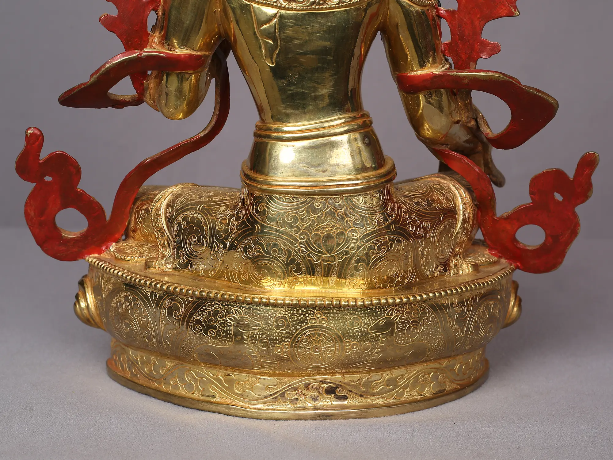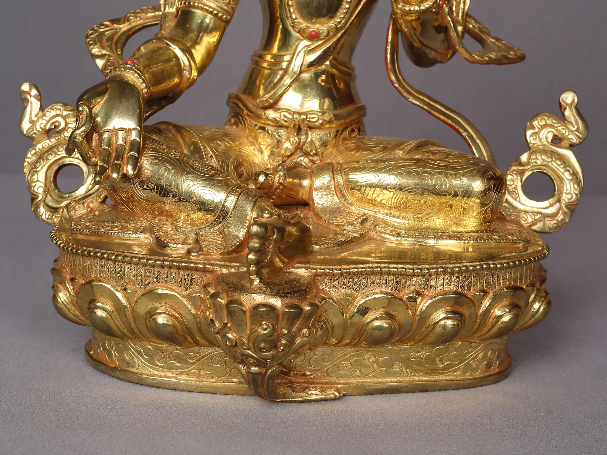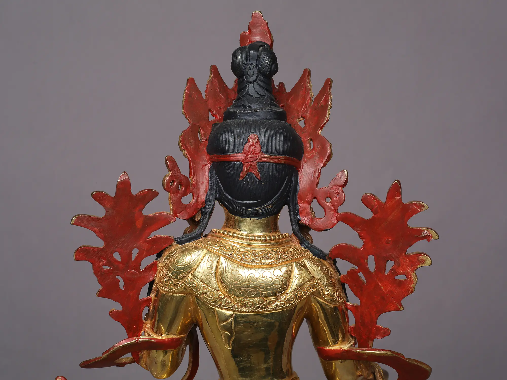 The perennially divine form of Green Tara is shown to us in this Nepalese statue. She is dressed in a fine dhoti and adorned with traditional Nepalese ornaments embellished with turquoise and coral that enhance her opulence. Her golden face, which is enhanced by an artistically carved crown and ornaments that draw attention to her lean physique, brims with innocence. The frills on her crown and her exquisite scarf flow mesmerizingly, giving Green Tara's apparently still composition in this magnificent statue a sensation of movement.