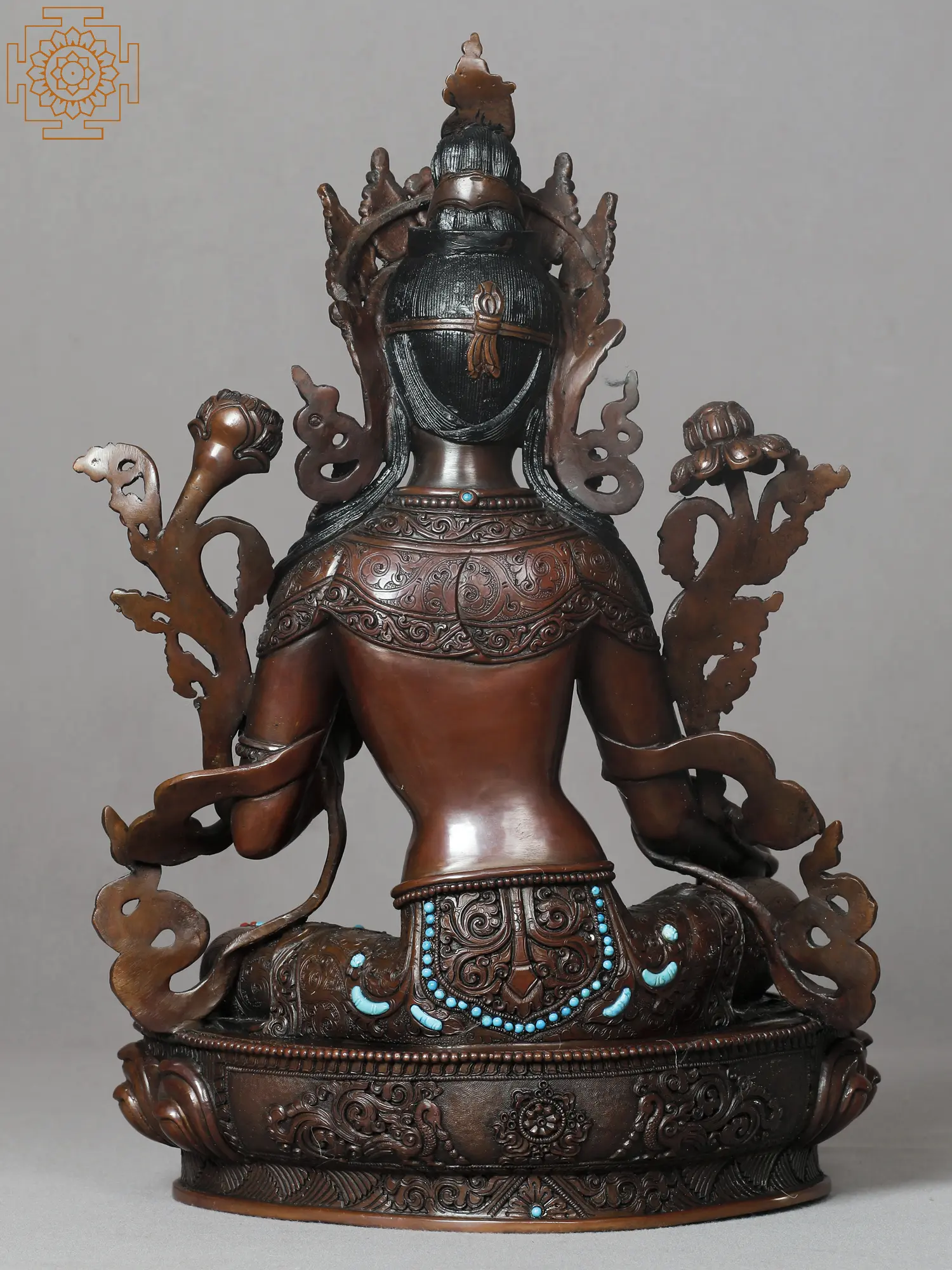 This statue depicts Green Tara sitting and ready to stand and assist those in need, with one leg extended in copper and the other in gold. Her left hand is holding the stem of a lotus flower, which supports an open blossom, while her right hand is making the wish-granting gesture known as the varada mudra. A small image of Amitabha can be found in the lotus bloom, which links Green Tara and the Buddha of Infinite Light.