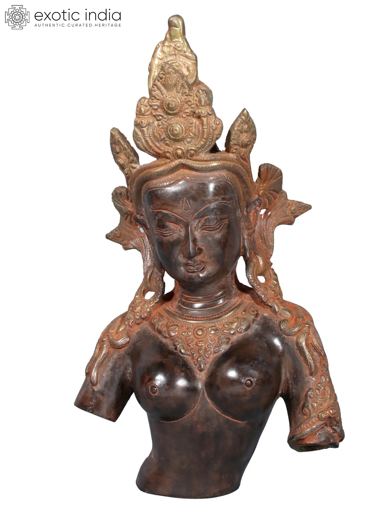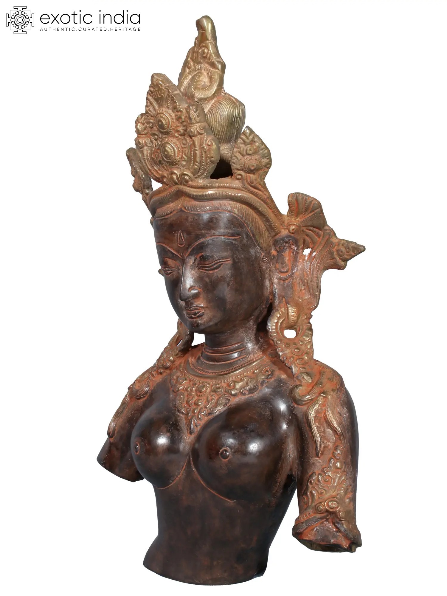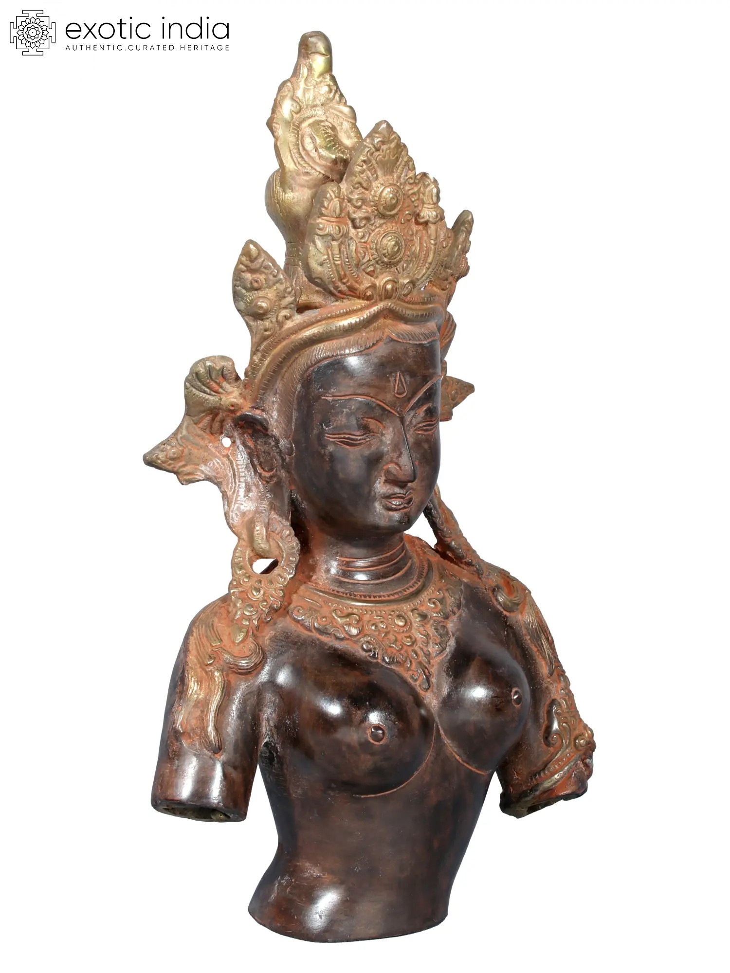 An extended bust of the divine beauty, Princess Tara. A Bodhisattva of the Buddhist heavens, Tara is unpralleled in both wisdom and beauty. The murti of Her that you see on this page is a flawless brass sculpture, each line and curve of Her form having been sculpted with the greatest skill and shraddha.