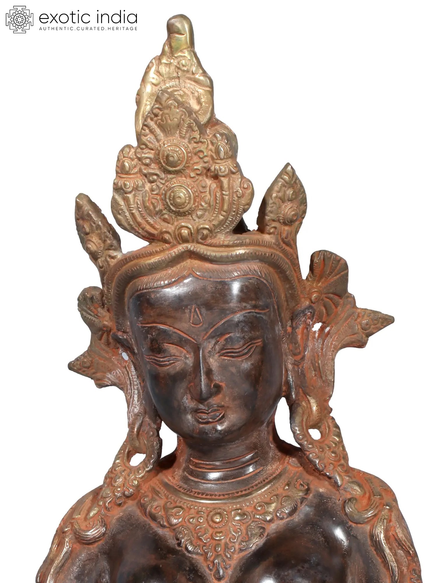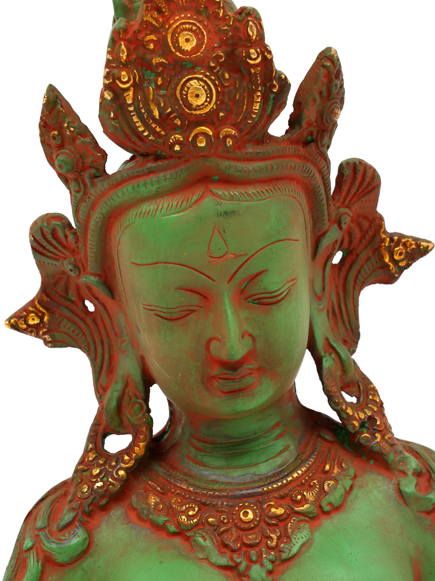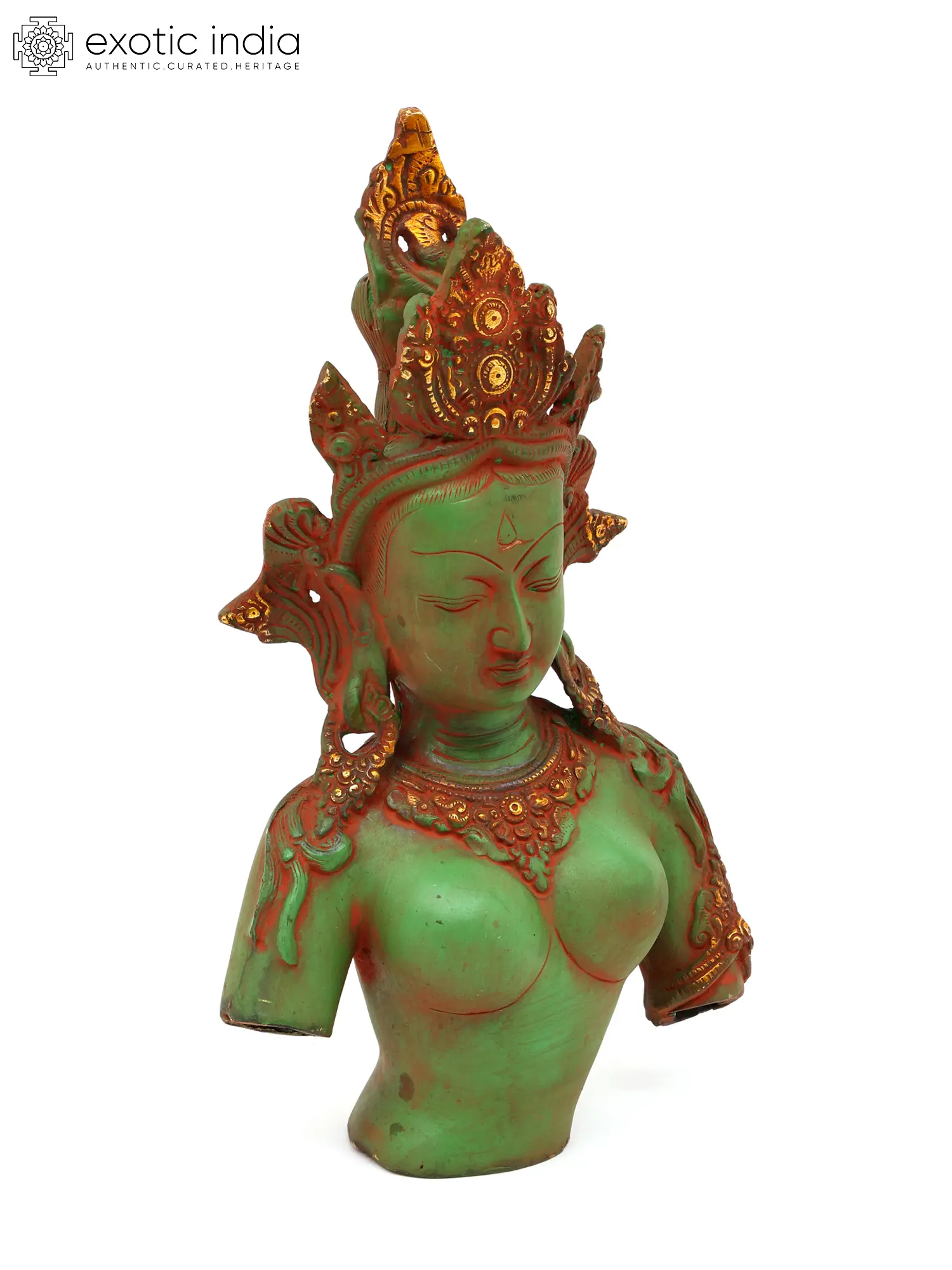 An extended bust of the divine beauty, Princess Tara. A Bodhisattva of the Buddhist heavens, Tara is unpralleled in both wisdom and beauty. The murti of Her that you see on this page is a flawless brass sculpture, each line and curve of Her form having been sculpted with the greatest skill and shraddha.