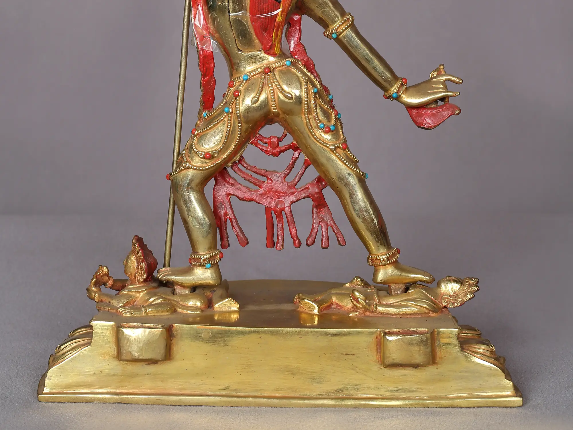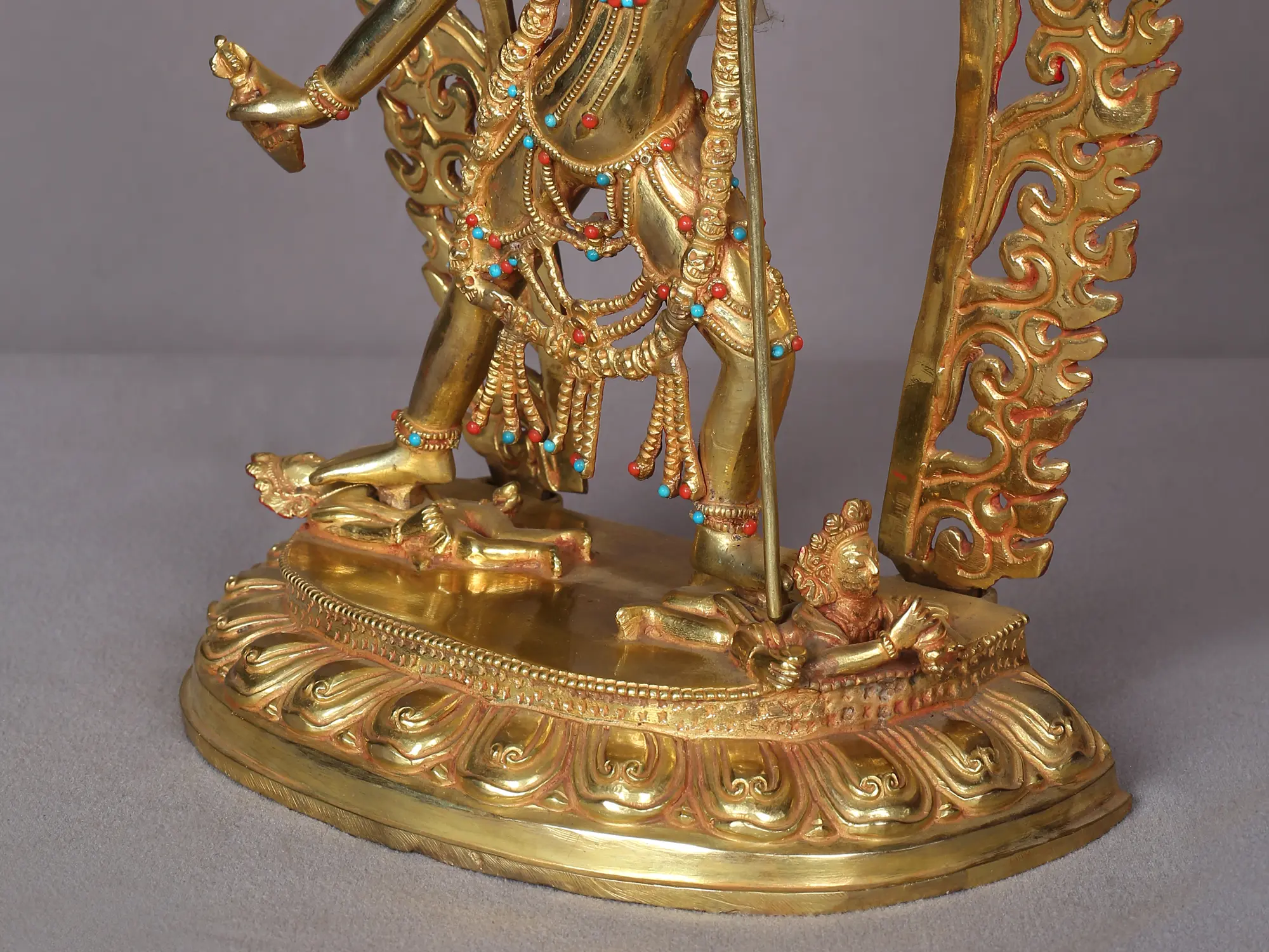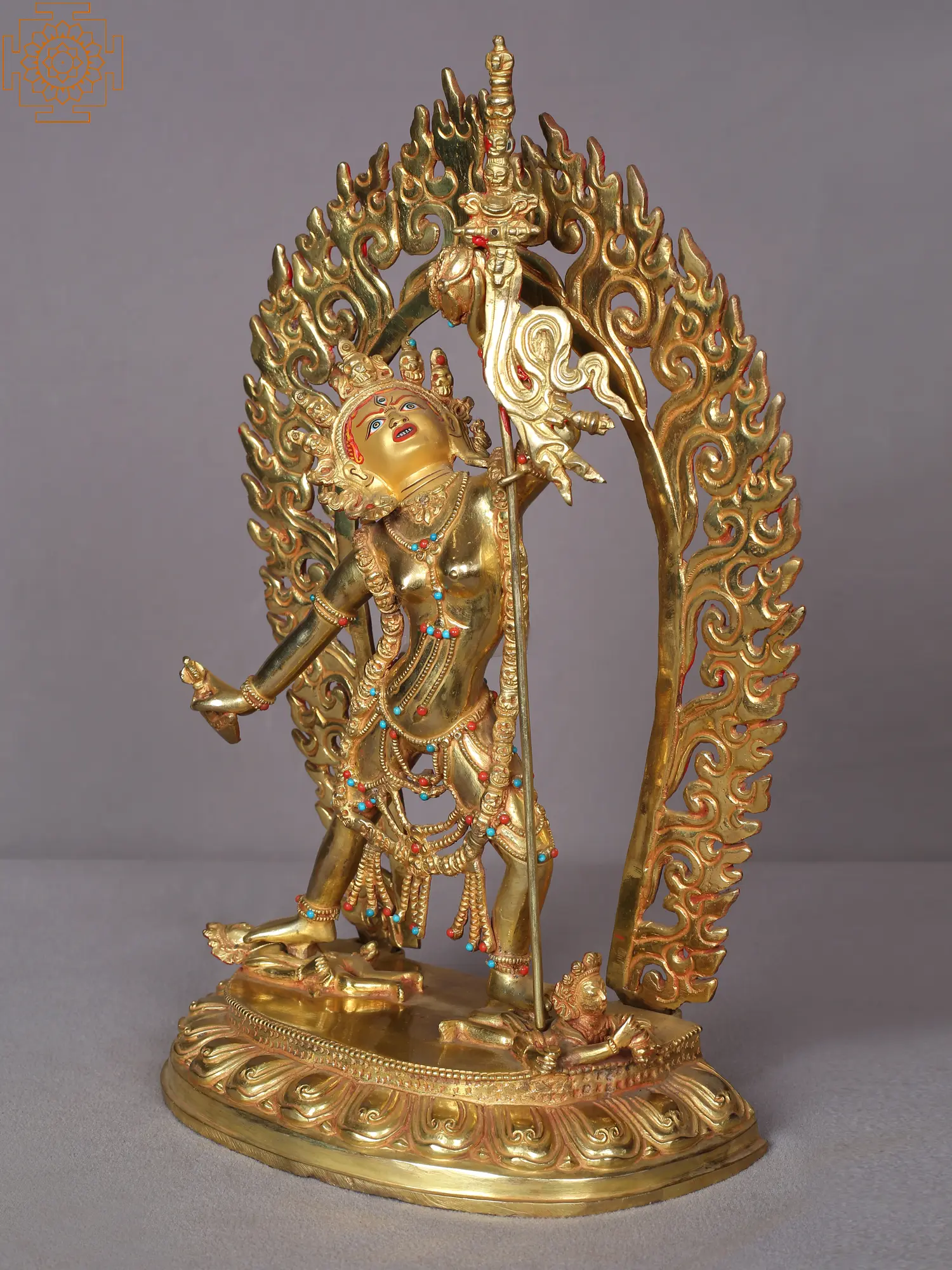 A Vajarayogini is a formidable deity in Vajarayana Buddhism who represents the fire of consciousness and the great forces of enlightenment. In this copper statue from Nepal, a Vajarayogini is portrayed standing in the Alidha stance in the middle of a burning halo, holding a driguk knife and a skullcup. Vajarayogini, who is commonly compared to the Hindu deity Kali, is adorned lavishly with coral and turquoise studded jewelry, a garland of skulls, and staff with severed heads which symbolize the various stages of life and its transient nature, which the Yogini highlights and transcends.