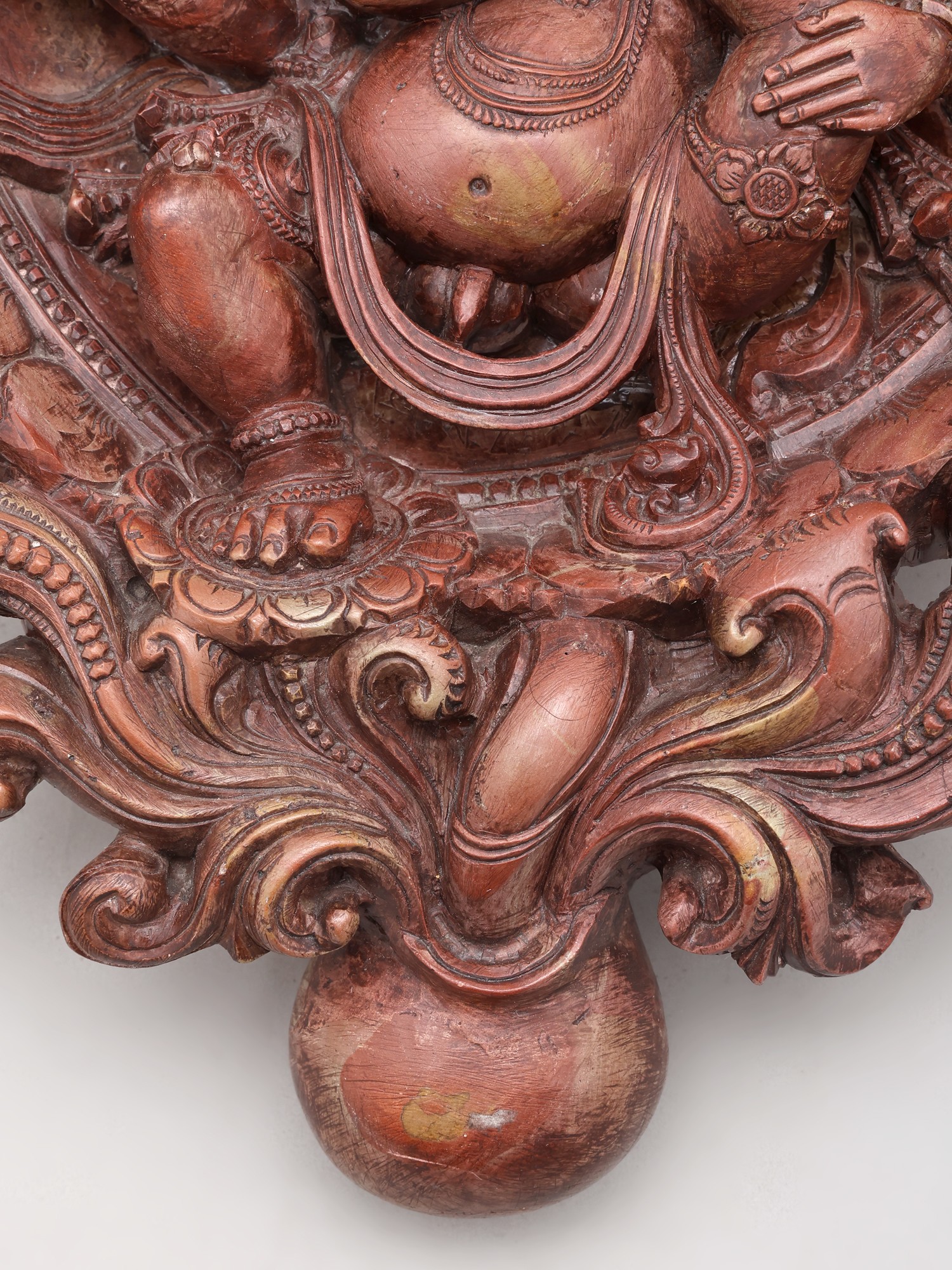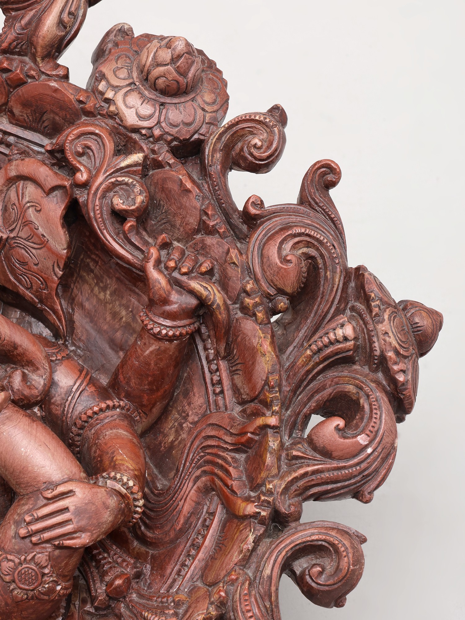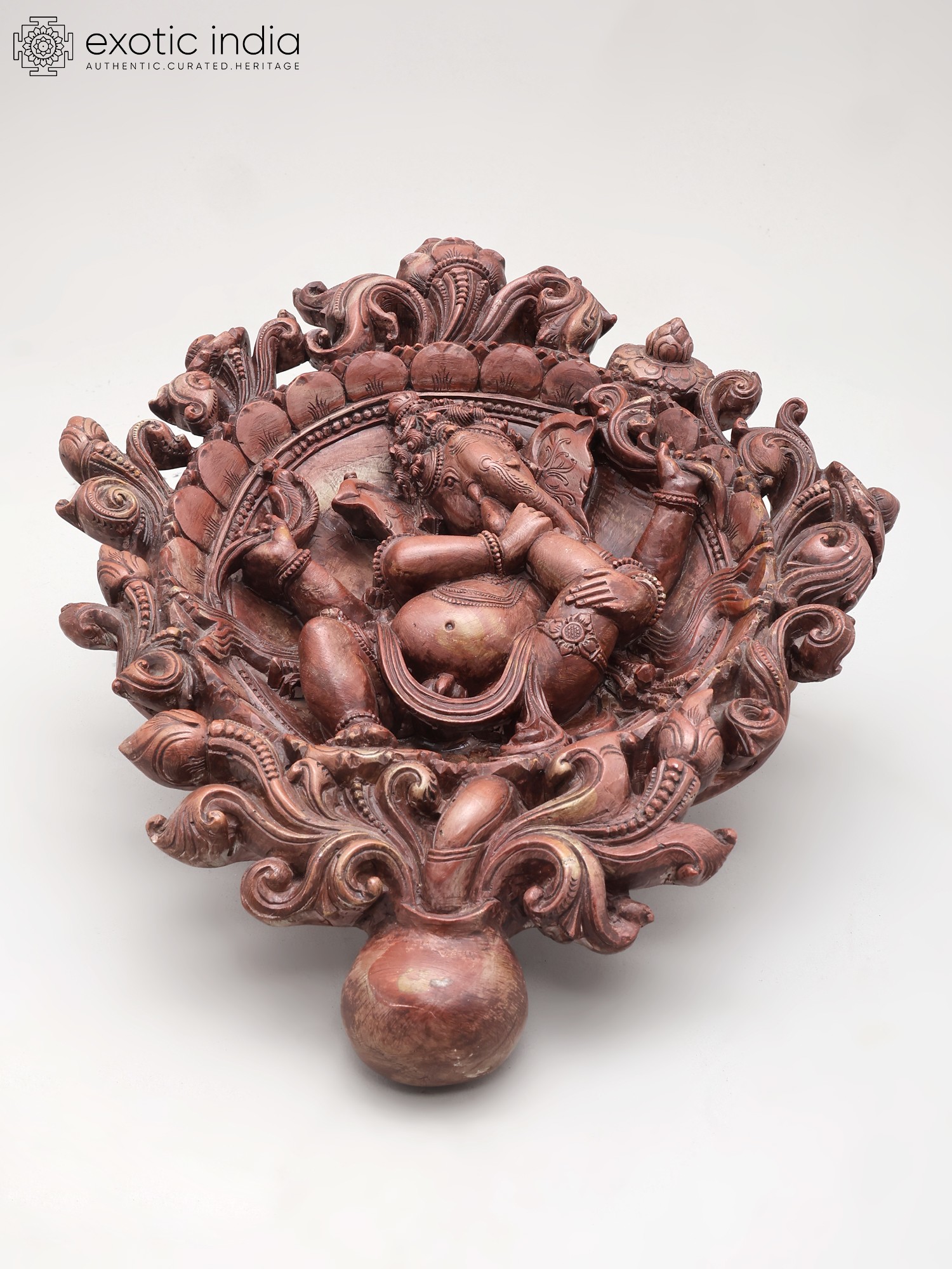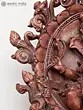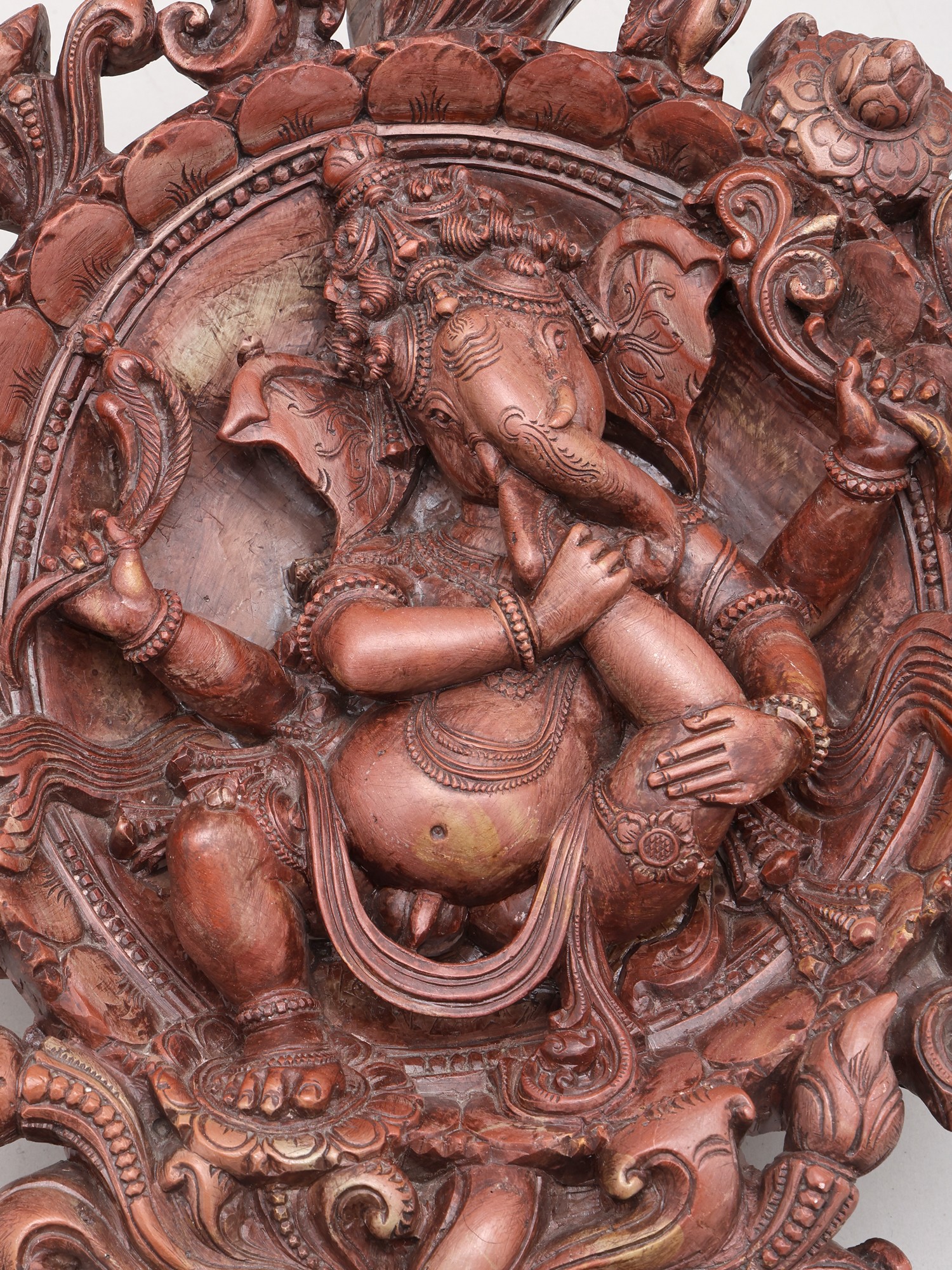 This striking piece depicts the four-armed deity in a serene posture, surrounded by an ornate, circular frame adorned with floral motifs and swirling patterns. The graceful sweep of the carving, rising to a height of thirteen inches, draws your eye to the central figure. Observe the subtle textures and the way light plays across the polished marble, highlighting the divine form and the rich, earthy hue of the stone.