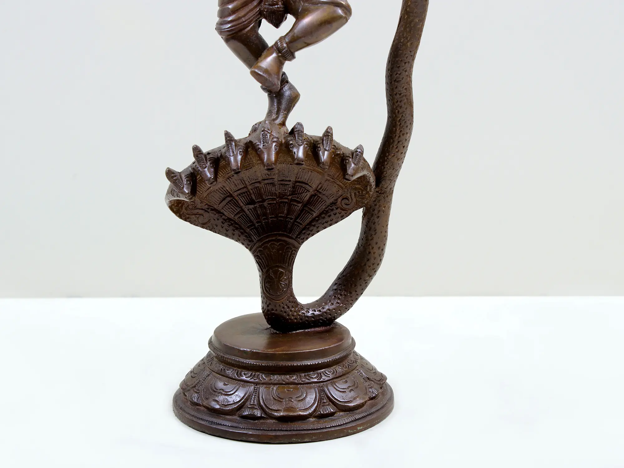 Observe the graceful posture of the divine figure, poised in a moment of profound control and triumph. The textured rendering of the serpentine form, coiled and yet subdued, speaks volumes of its vanquished power. You will be drawn to the subtle musculature and the serene yet resolute expression, accentuated by the striking halo that frames the serene countenance. Standing at a commanding height, this piece offers a dynamic visual narrative that commands attention and contemplation, its dimensions allowing for an impactful presence without overwhelming your curated environment.
