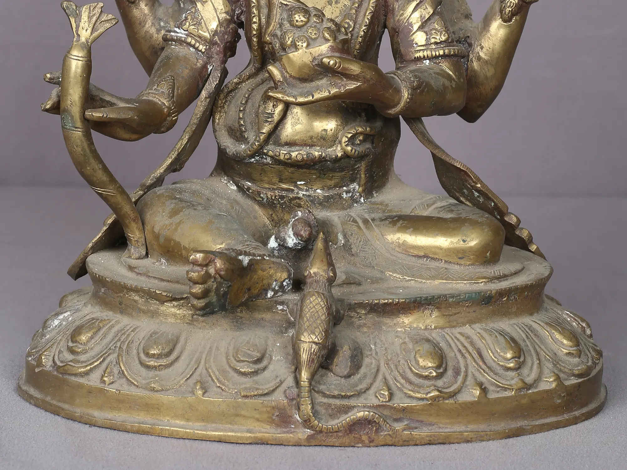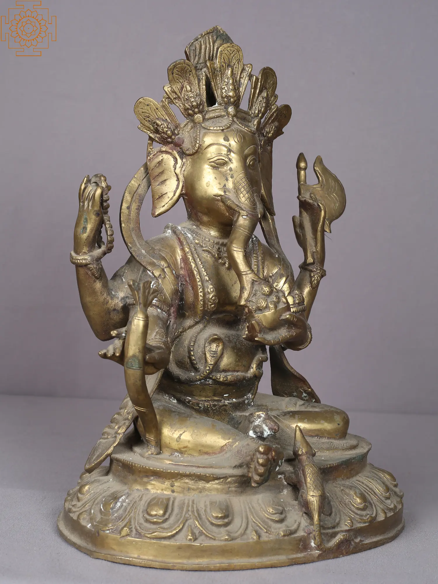 Crafted from durable brass, this thirteen-inch statue showcases Ganesha with his characteristic multiple arms, each holding symbolic attributes. In one hand, he holds his divine axe, Parashu, symbolizing the power to cut through ignorance and attachment. Another hand gestures in a protective abhaya mudra, offering reassurance and blessing to devotees. The presence of the modak, a symbol of the sweetness of spiritual realization, is central to this particular portrayal, highlighting Ganesha's role as a giver of joy and fulfillment. The intricate details of his headdress, adorned with feathers and jewels, suggest his regal stature and cosmic power, while the coiled serpent around his waist represents the kundalini energy, the latent spiritual power within all beings. The lotus base upon which he sits signifies purity and spiritual awakening.