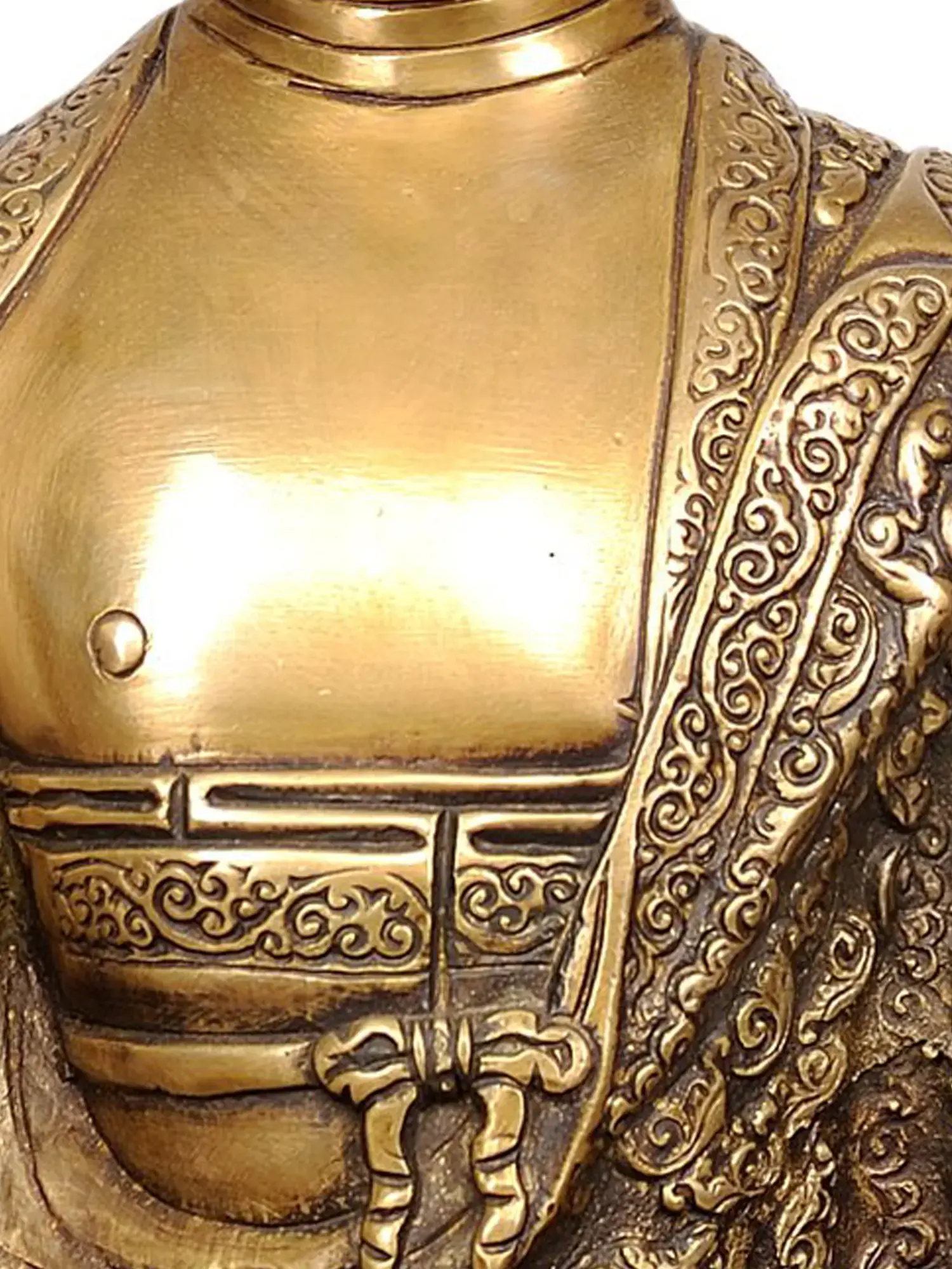 This brass statue portrays the Bhumisparsha Mudra, meaning "touching the earth." Buddha called the earth goddess Sthavara to bear witness to his enlightenment at this moment. In this example, the sculpture is made of brass and has a regal aspect owing to a great gold shine. The statue glows as if enlightenment is emanating from Buddha's thoughts. The finely carved robe with clouds and Tibetan snow lions is the most remarkable feature of this statue. This cryptic monument asks us to accept the transitory essence of life, to find peace in the midst of chaos, and to seek enlightenment in the midst of life's shadows.
