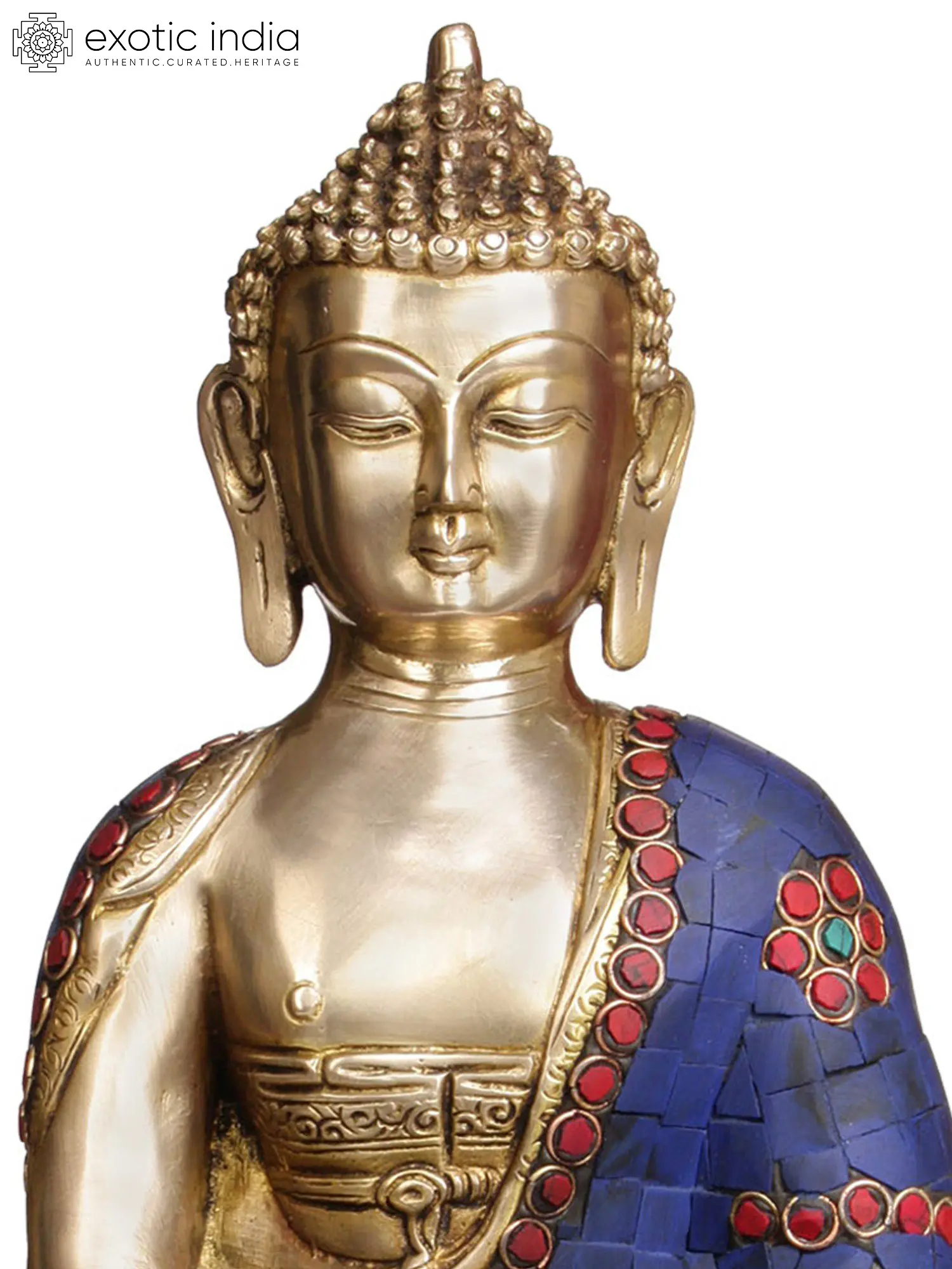 The statue is fashioned from high-quality brass, its surface polished to a soft, golden sheen. The drapery is adorned with an intricate inlay work. This decorative technique involves carefully setting small pieces of stone or other materials into the surface of the brass, creating a mosaic-like pattern. The vibrant colors of the stones contrast beautifully with the golden hue of the brass, adding depth and visual interest to the piece. The lotus base upon which the Buddha sits is also adorned with meticulous detail, its petals unfolding in a graceful and symmetrical design.