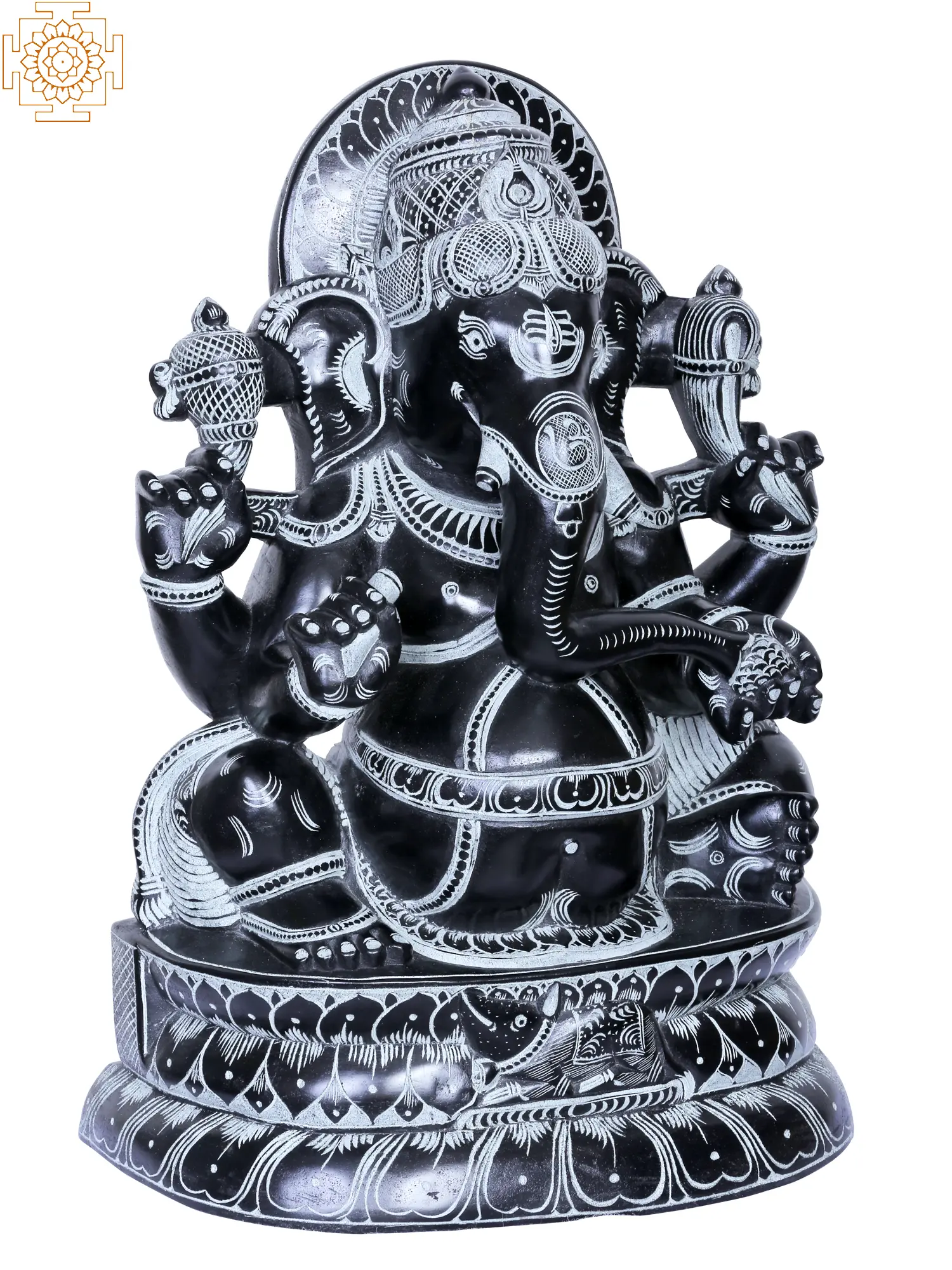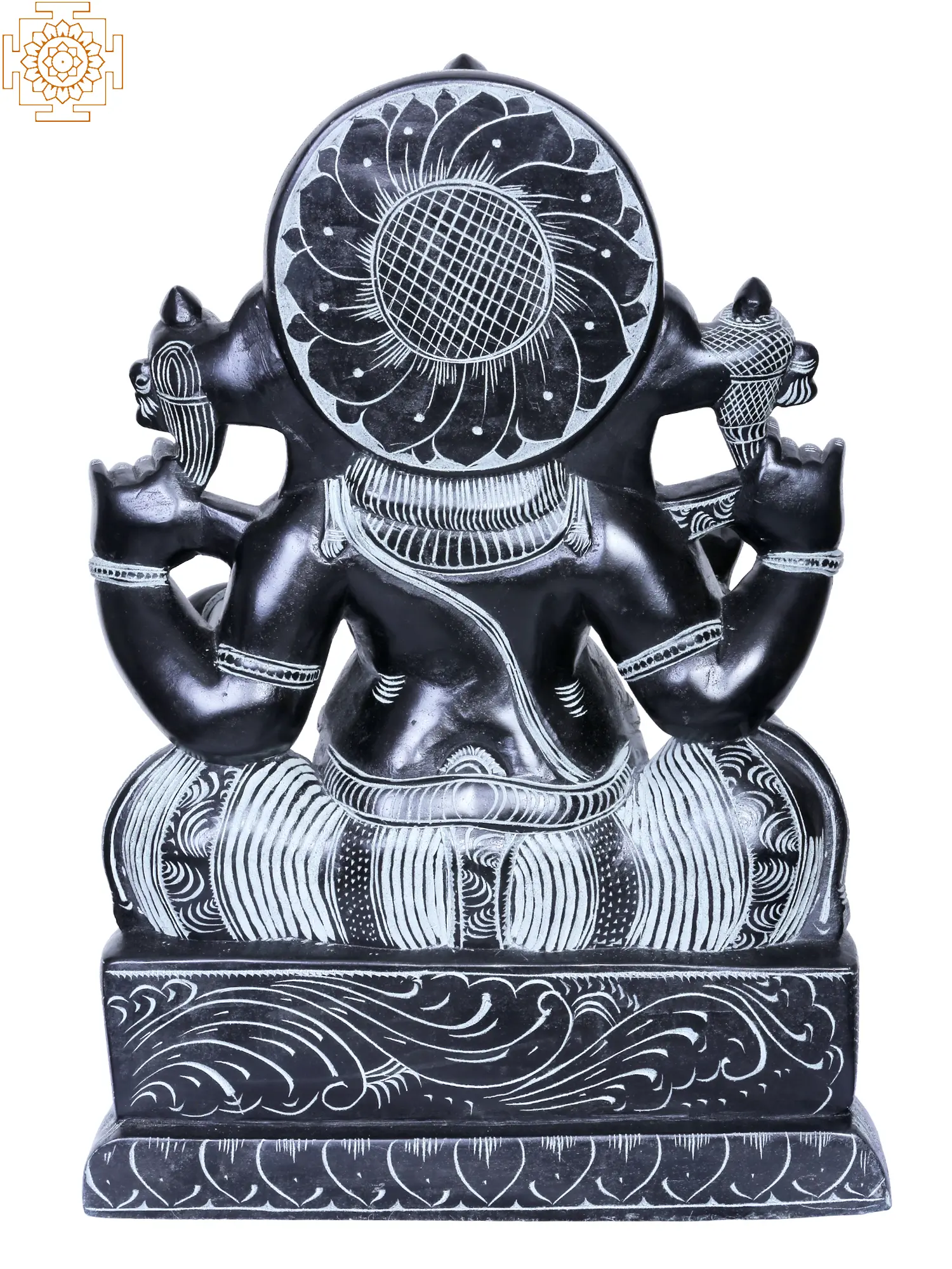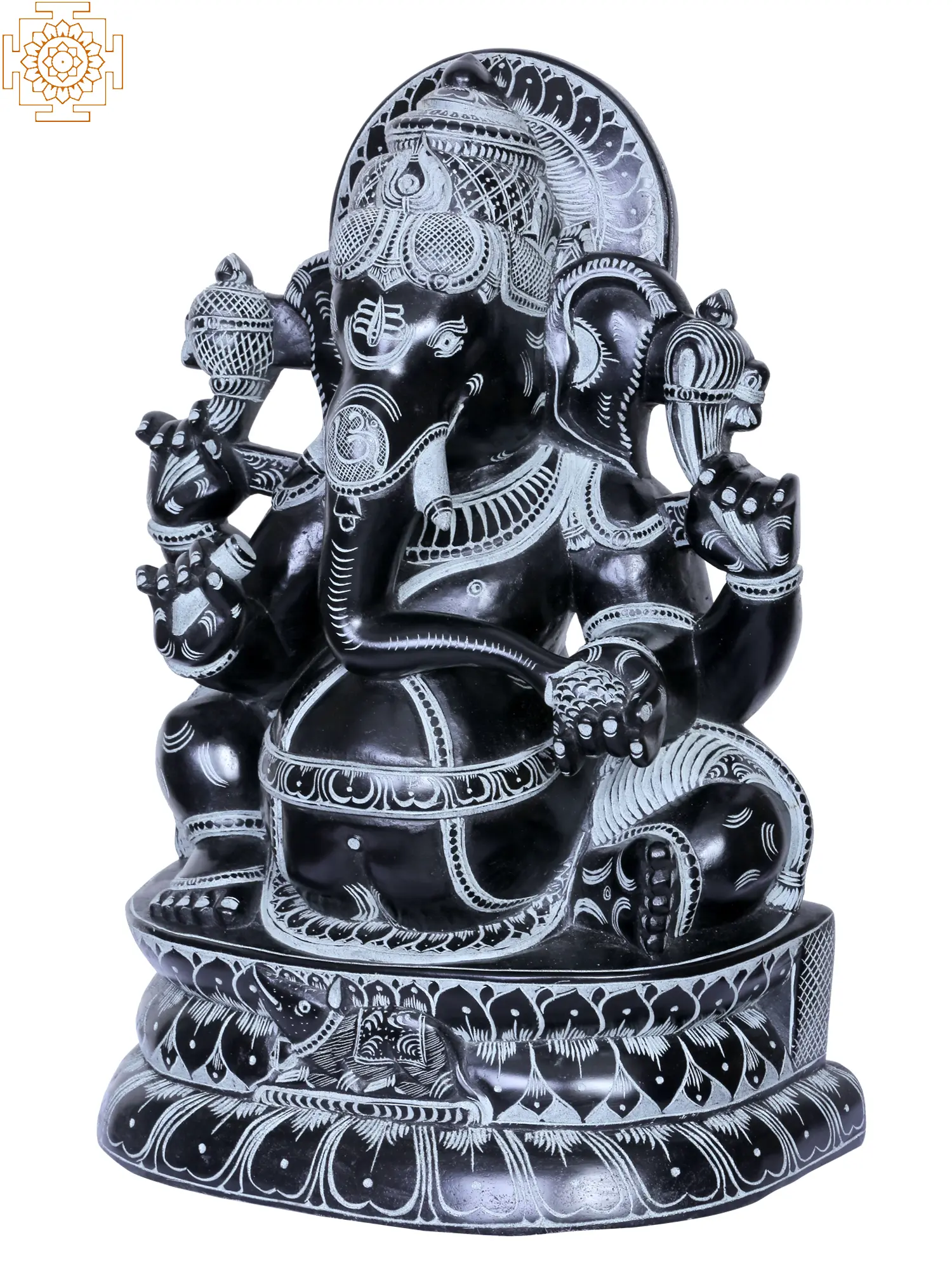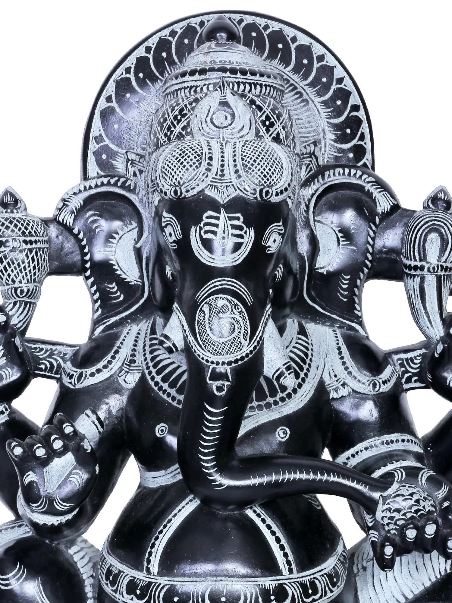 A Ganesha idol in your space can become an eternal source of auspicious energies. Vastu prescribes one choose a Gaensha statue for home with close attention to the iconography, material, and color of the icon to reap the highest benefits of Ganapati's presence. In this Mahabalipuram statue of Ganesha, the four-armed roopa of the elephant-faced deity has been carved in a stunning black stone. Black color or Shyama-varna Ganesha is an immensely potent aspect of Ganesha, which bestows upon the devotee a wealth of confidence, strength, and success.