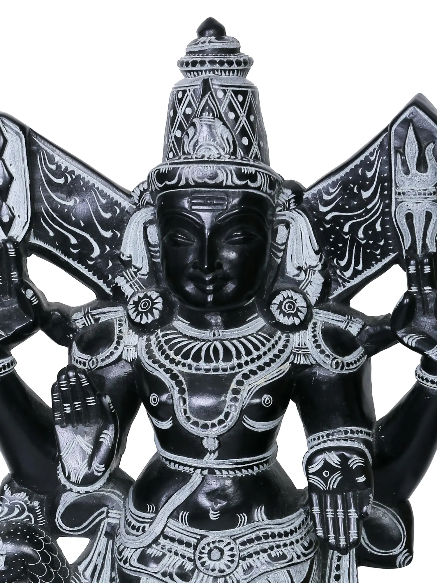 This magnificent stone sculpture brings to life the divine warrior, Lord Kartikeya, also known as Murugan. Crafted with exceptional detail from the renowned artisan region of South India, specifically Mahabalipuram, this statue embodies centuries of tradition and spiritual devotion. The dark, polished stone provides a striking backdrop for the intricately carved white inlay work, highlighting the divine form and symbolic accoutrements of this beloved deity. The commanding stance and multiple arms, each holding a sacred object, signify his power and multifaceted nature as the commander of the celestial armies and the vanquisher of evil.
