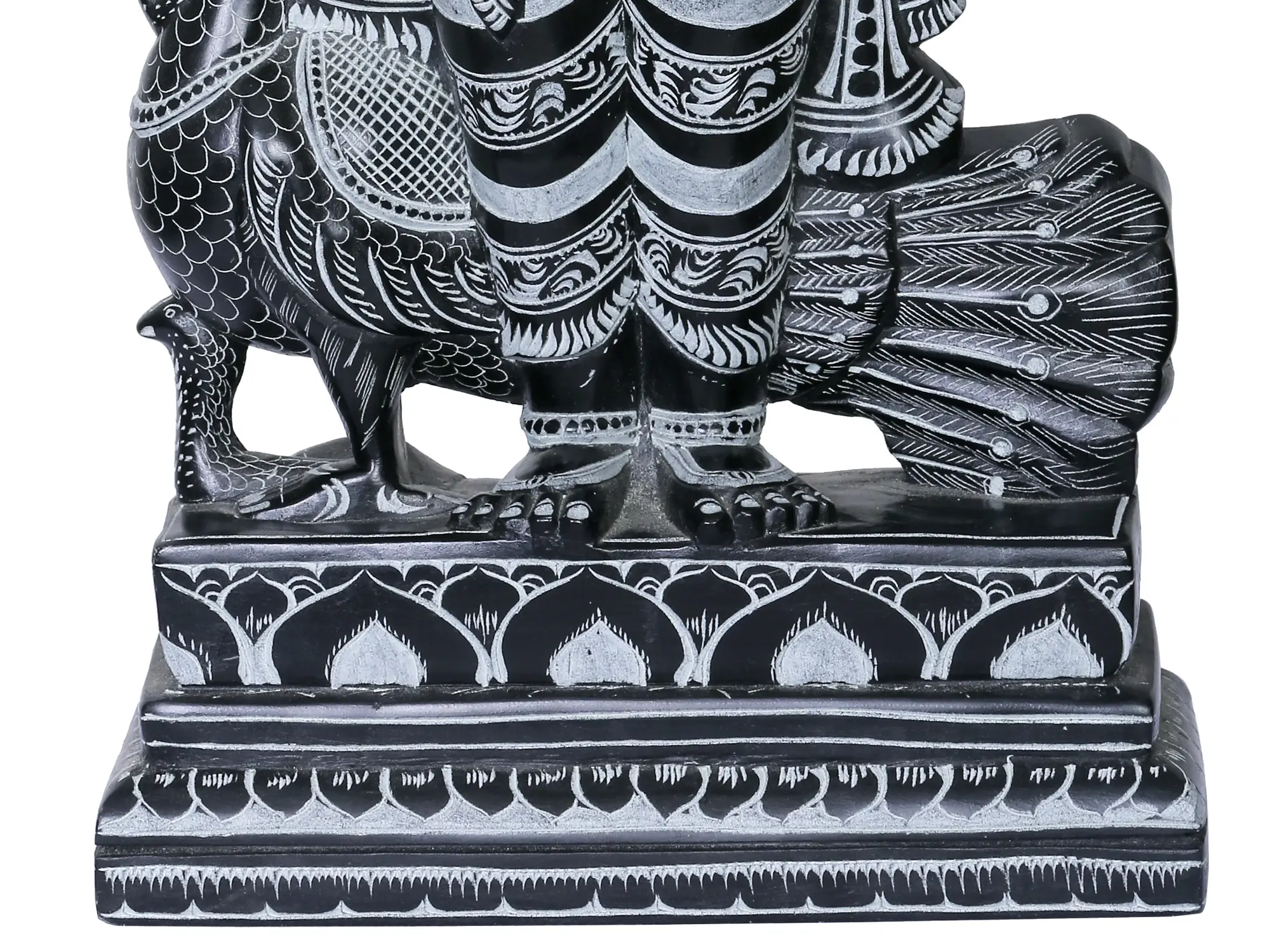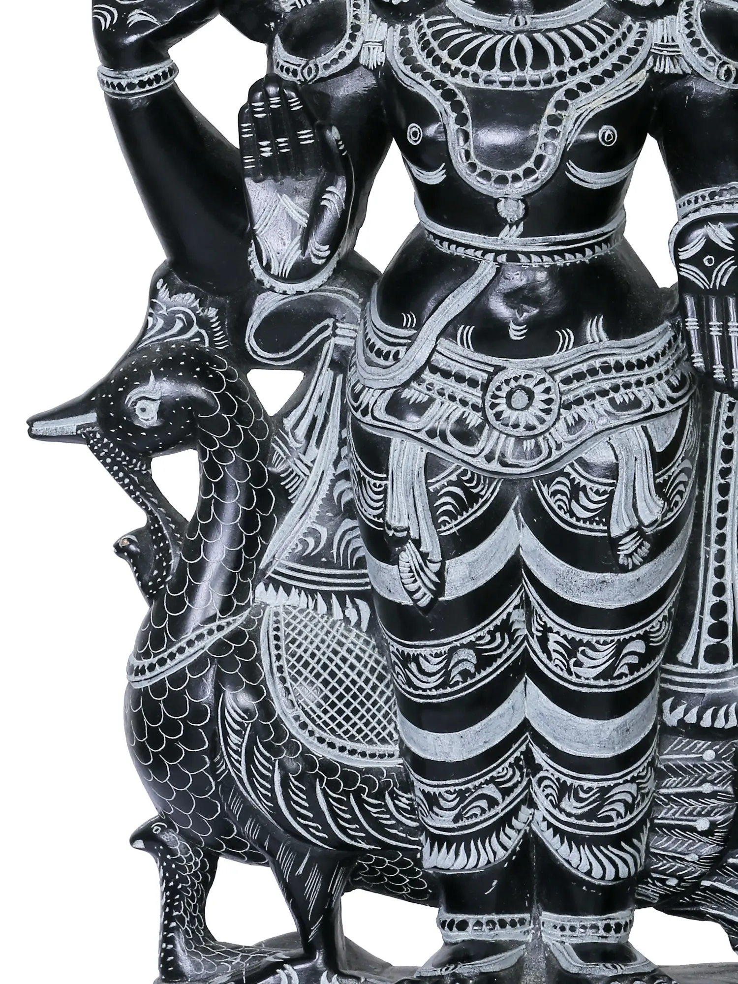 19" Lord Kartikeya in Blessing Posture with Peacock Vahana | Black Granite Stone Idol