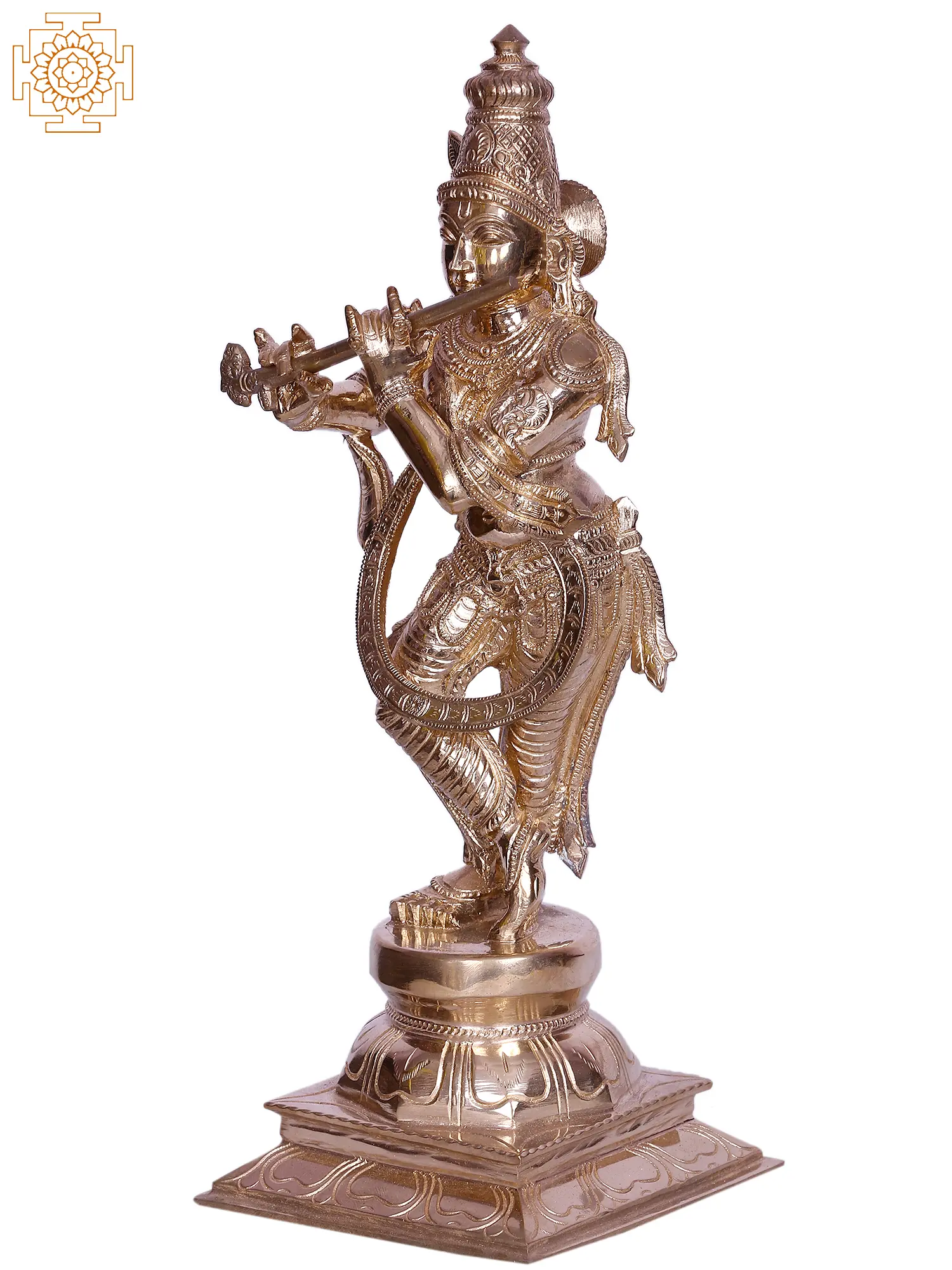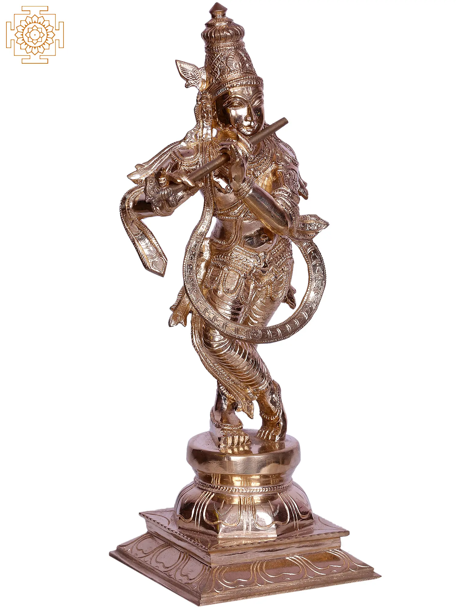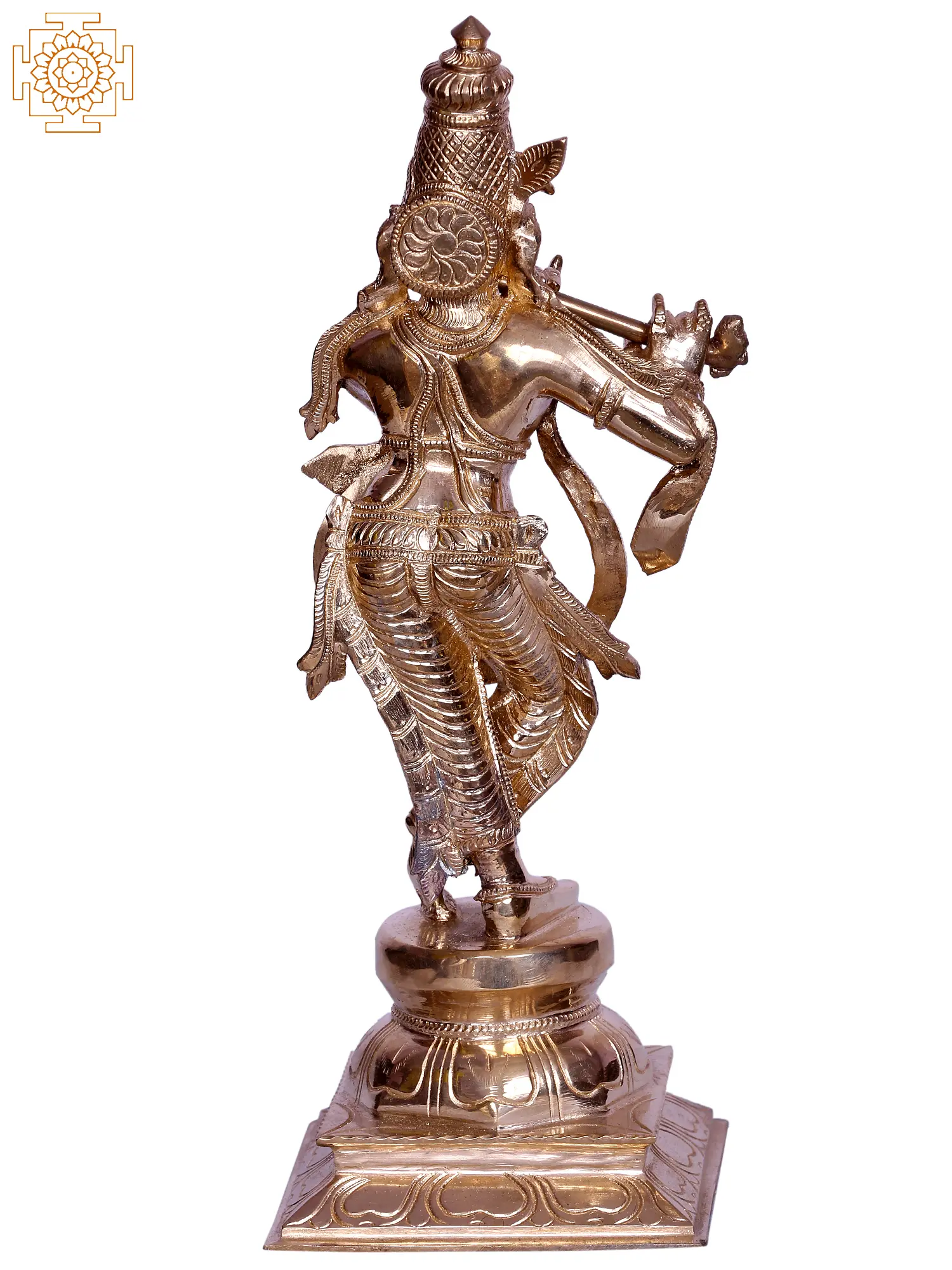 This Krishna murti is sculpted from bronze. The tradition of sculpting with bronze, the medium of the elite amongst artisans, has been perfected in South India, from where it has been handpicked. Note the sheer wealth of detail embossed on the form of Krishna, of anatomy and adornment and expression, and the exquisite features of His face.