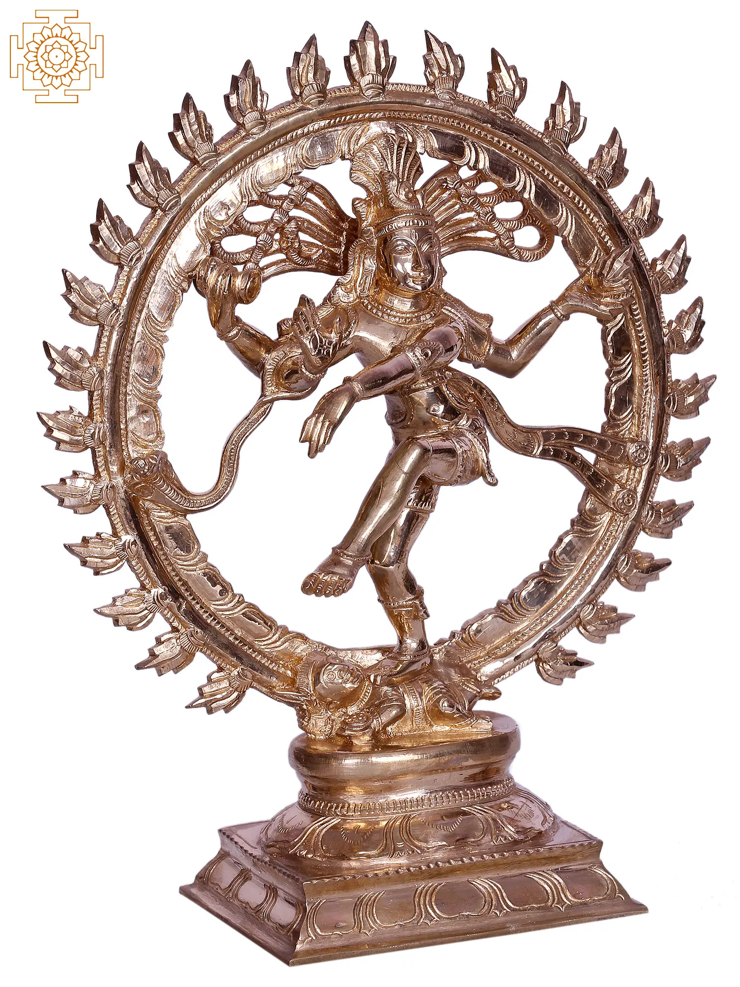 Within the ringlet of fire (prabhavali), the handsome Nataraja performs His tandava. The posterior of His four hands (He is chaturbhujadhari) bear the damroo, from which emerges the creative nada, and a quantum of all-annihilating flame, its complement. Together with the abhaya va gajahasta mudras of His anterior hands and the stance of His legs, these form the quintessential silhouette of India’s symbolic Nataraja.