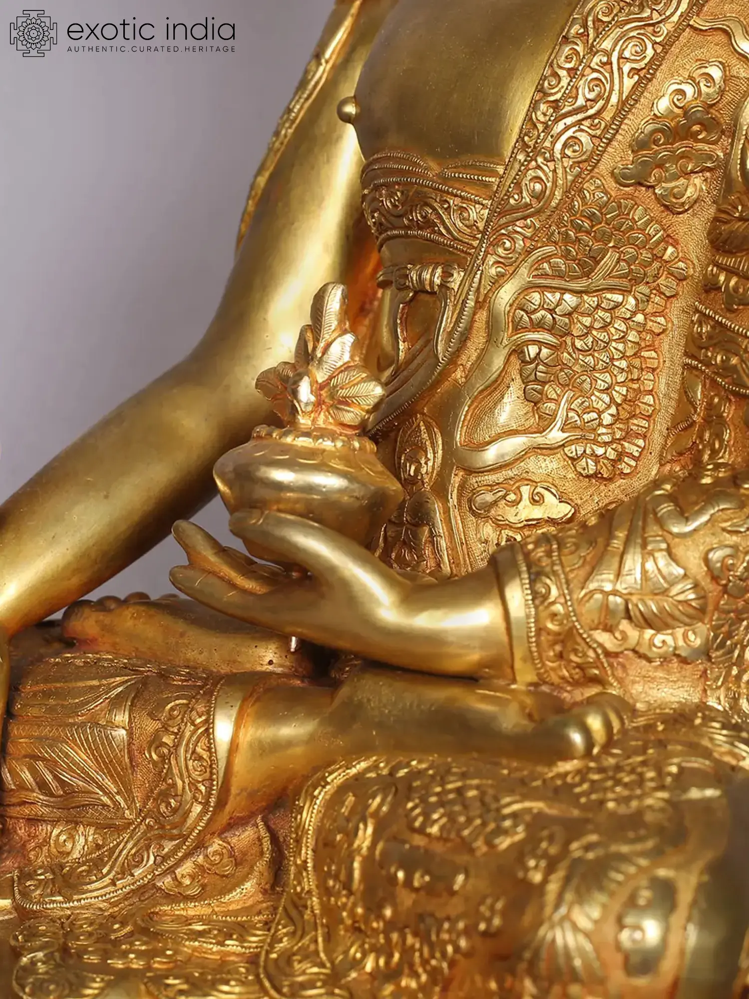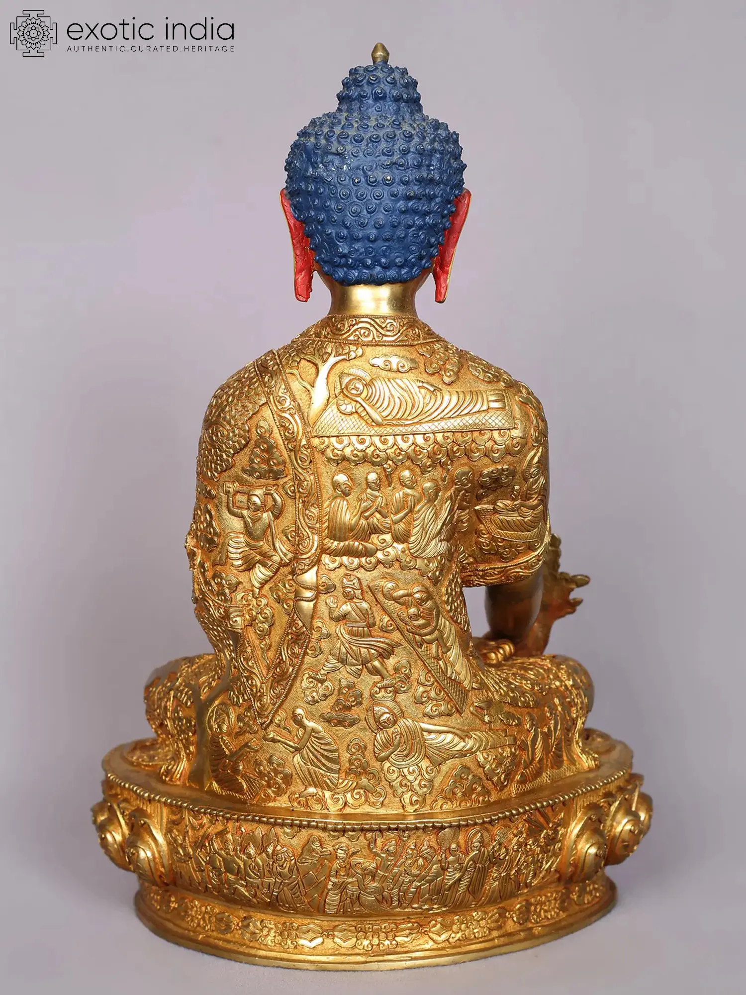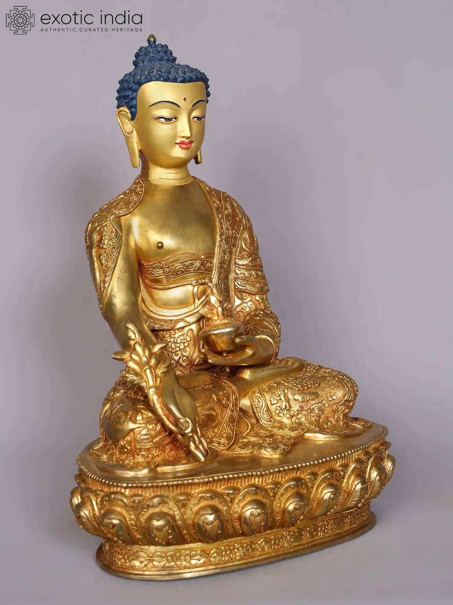 Atop his head, there is a protuberance symbolizing his profound wisdom. His hair appears as tightly coiled curls, and his earlobes are notably elongated. Shakyamuni's left hand gently rests in his lap, a gesture of meditation, while cradling his alms bowl, symbolizing his compassion and generosity.