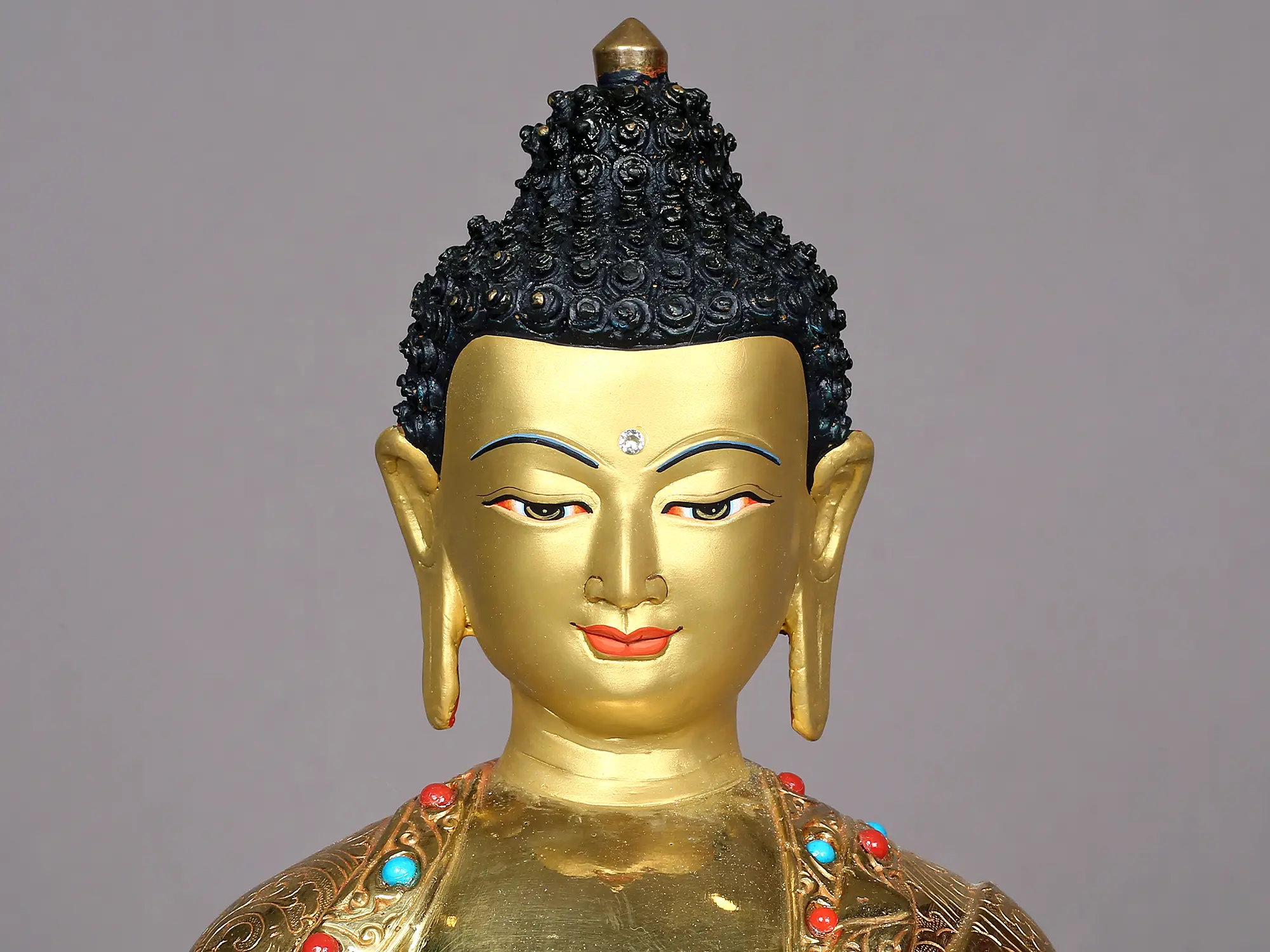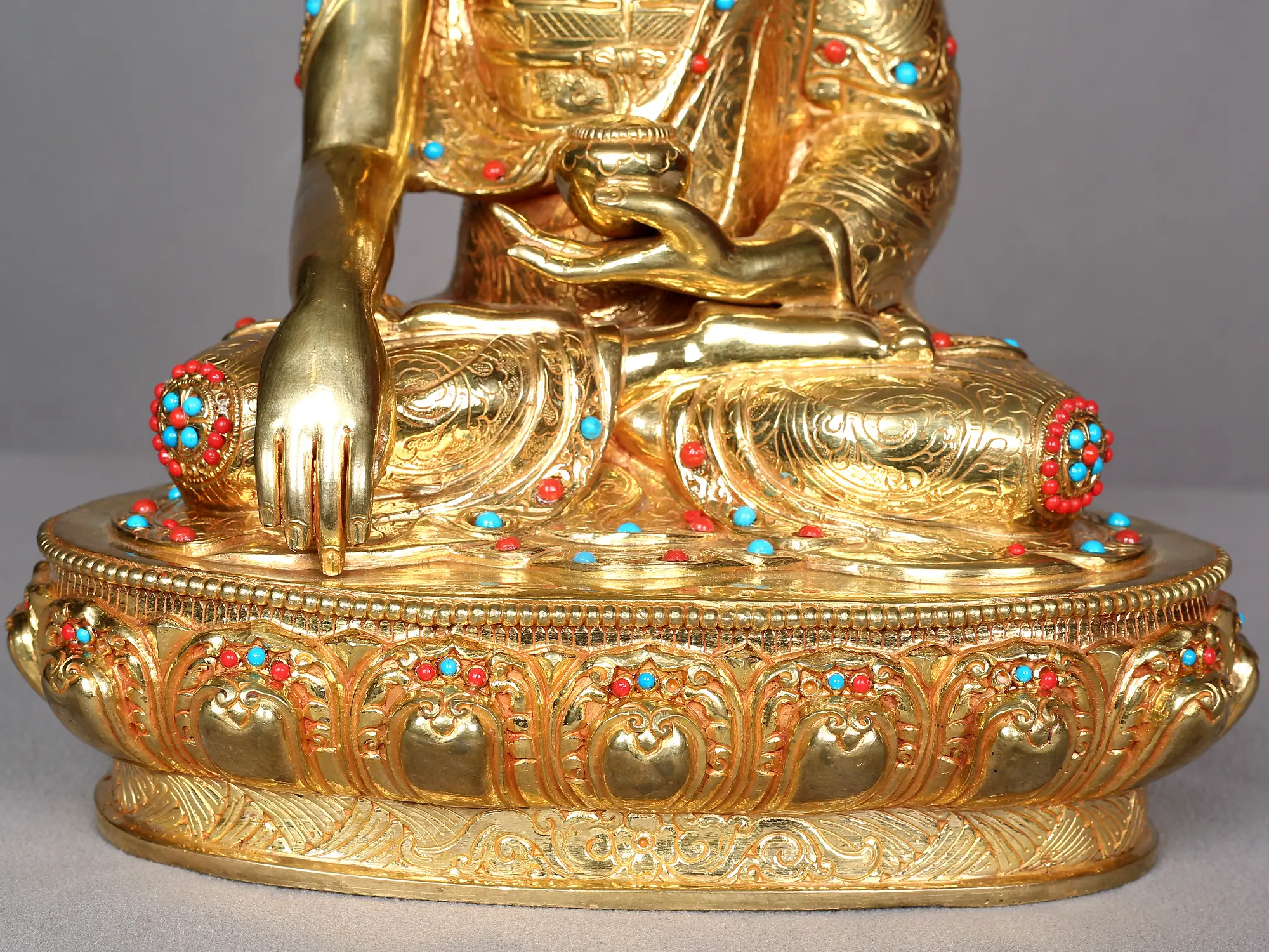 This marvelous gilded copper statue from Nepal depicts the Buddha sitting on a magnificent and intricate lotus throne, which represents the source of inner enlightenment and serves as a fitting analogy to his ultimate wisdom. In Buddhism, a blossoming lotus is synonymous with the blossoming of wisdom within the seeker's mind. The artwork juxtaposes this exquisite symbolism with the moment of Buddha's declaration of Enlightenment, portrayed through his "Bhumisparsha" or earth-touching gesture.