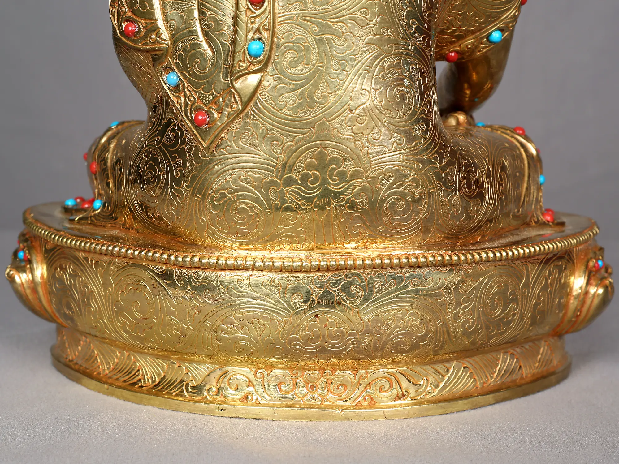 With serene emotions and exquisite features, the gilded copper statue depicts the tranquility and beauty of Bhumisparsha Buddha. The Buddha, clad in a golden gown which is embellished with precious coral and turquoise and holding an alms bowl in his hand while in meditation, symbolizes the boundless magnificence and simplicity of an Enlightened creature.