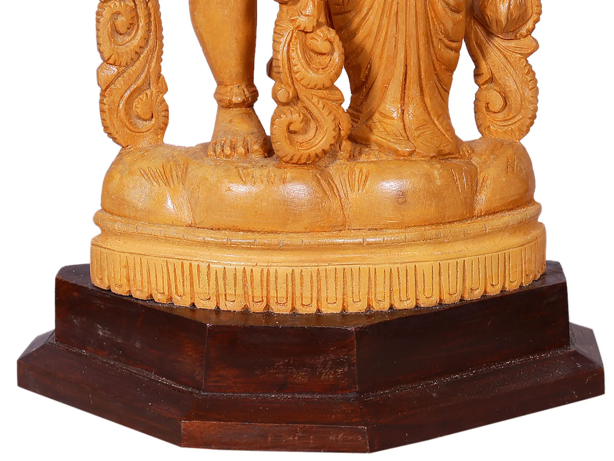 The quality of the wood and the meticulous hand-carving elevate this statue to a work of art. The artist's dedication to capturing the divine form is evident in every curve and contour. The statue rests on a sturdy, elegantly finished wooden pedestal, providing a stable and distinguished base. This piece is designed to last, retaining its beauty and spiritual significance through the years, becoming a focal point of devotion and admiration in your home.