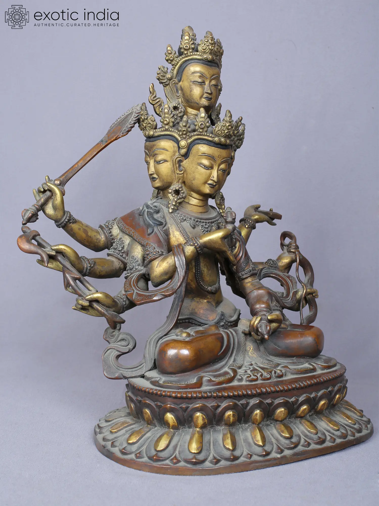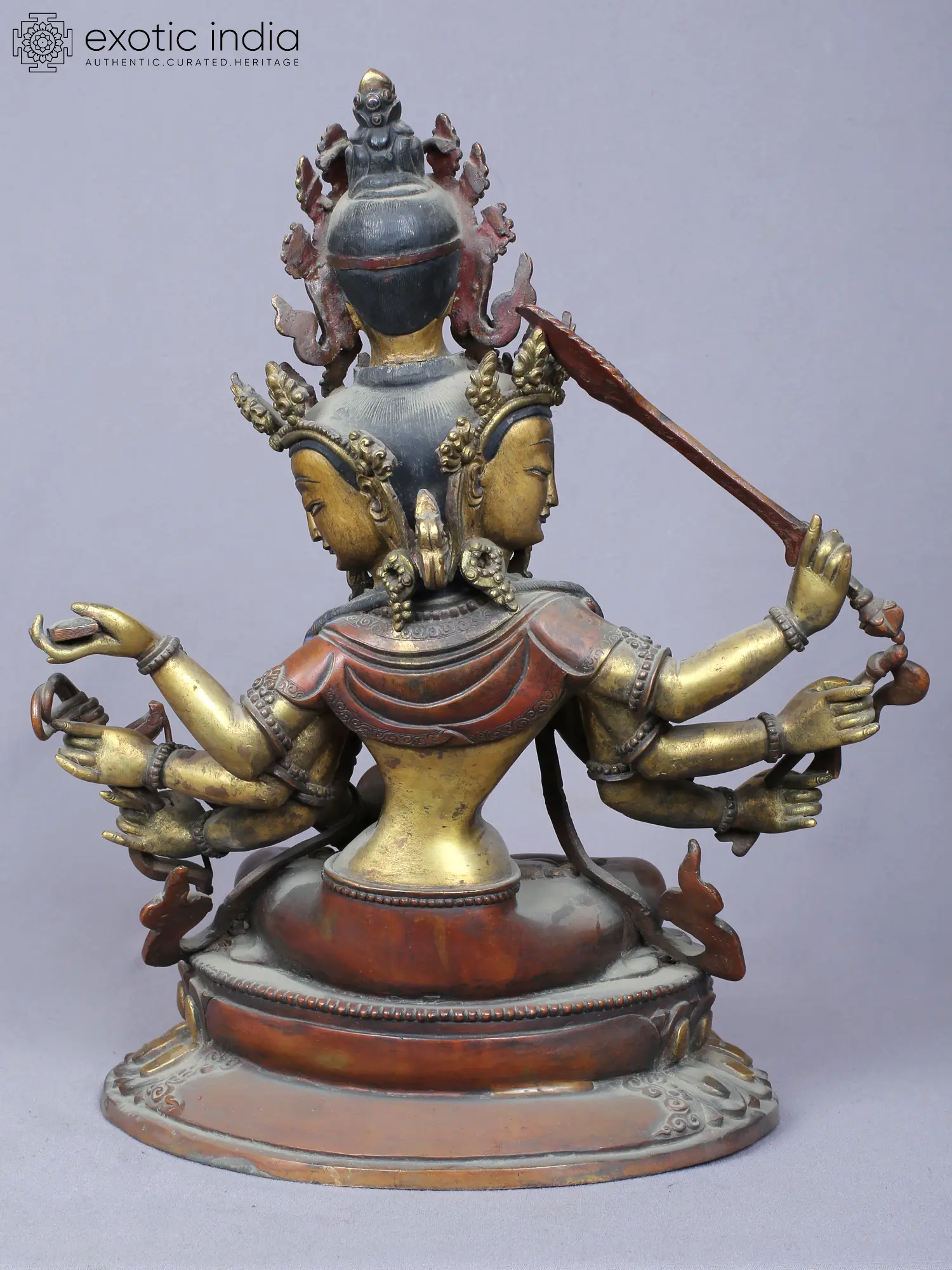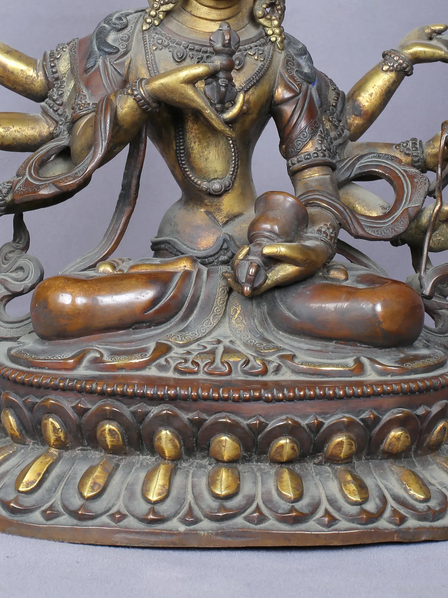 The Copper Statues Gilded with Gold are a specialty of Nepalese artists and this statue is no different. This Maha Manjushri Copper statue is a display with four heads and six hands. Maha-Manjushree, or the Bodhisattva of Wisdom, is Adi Buddha's bodhisattva companion. Maha Manjushri is widely regarded as the Buddha's manifest wisdom. In his right hand, Maha Manjushree wields the blazing two-edged sword of logical segregation to eliminate obliviousness, which is the primary cause of cyclic presence and languishing.