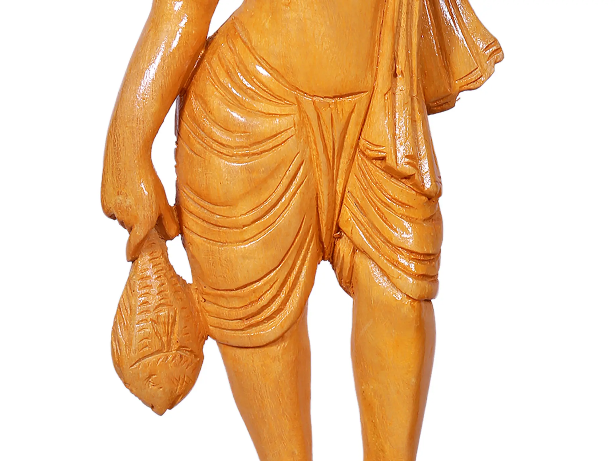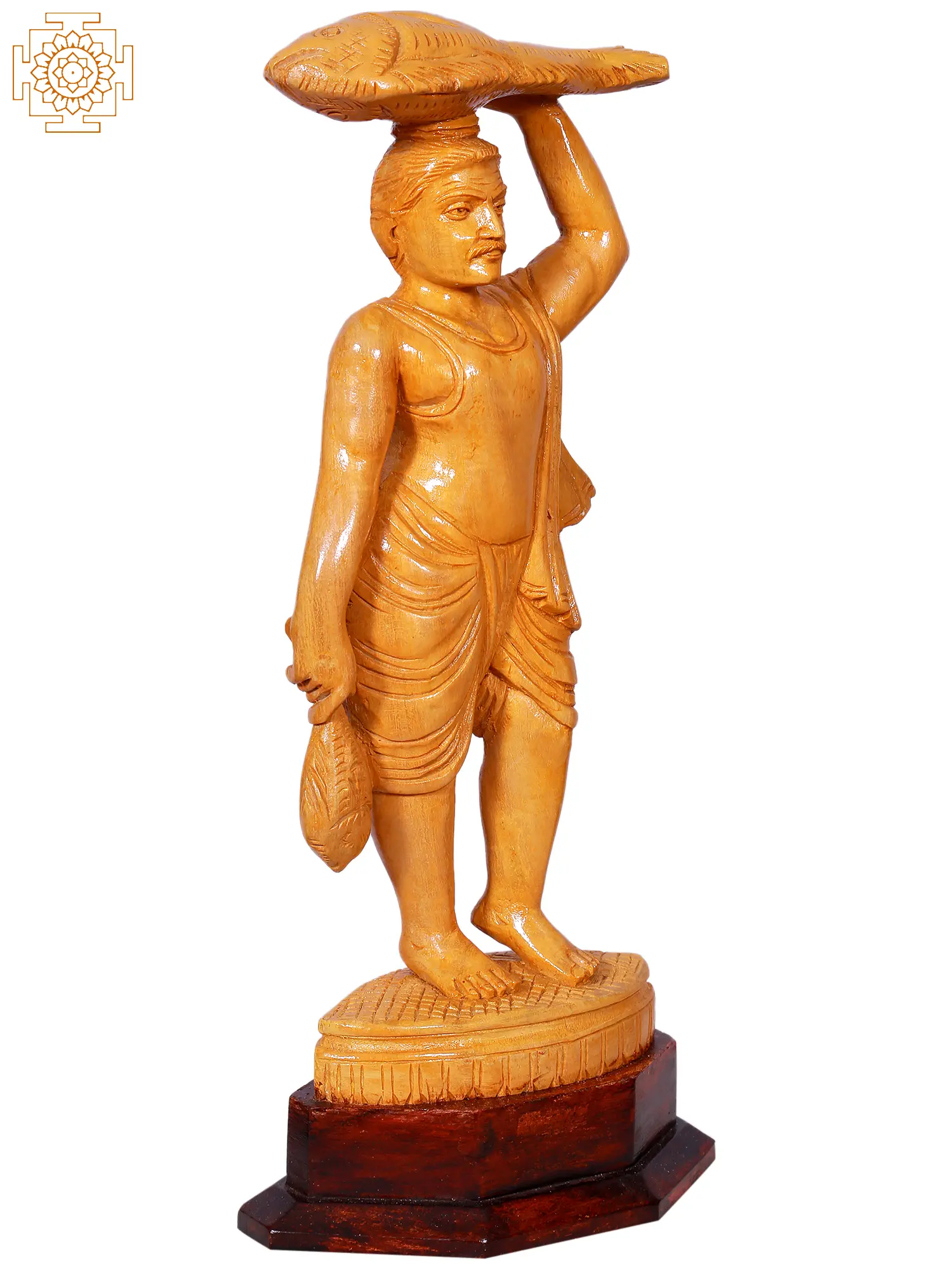 This exquisite wooden statue captures a pivotal moment of devotion and sustenance, bringing a touch of ancient Indian tradition into your home. Carved from smooth, pale wood, the figure stands on a beautifully detailed pedestal, presenting a scene rich with cultural significance. The craftsmanship is evident in the delicate rendering of the draped cloth, the subtle musculature of the body, and the dignified expression on the man's face. He holds aloft a large, intricately carved fish, symbolizing abundance and prosperity, while another similar offering rests in his hand.