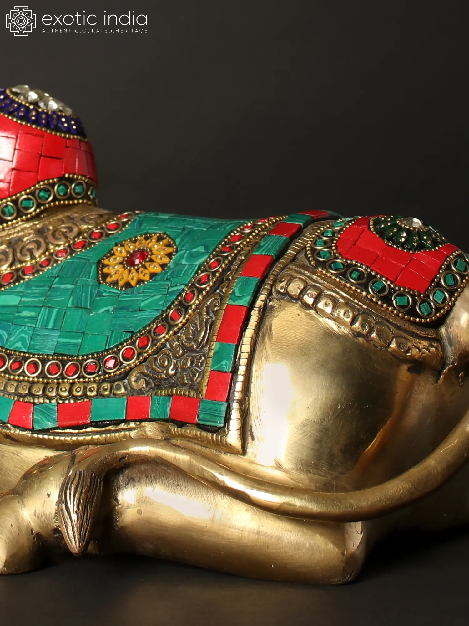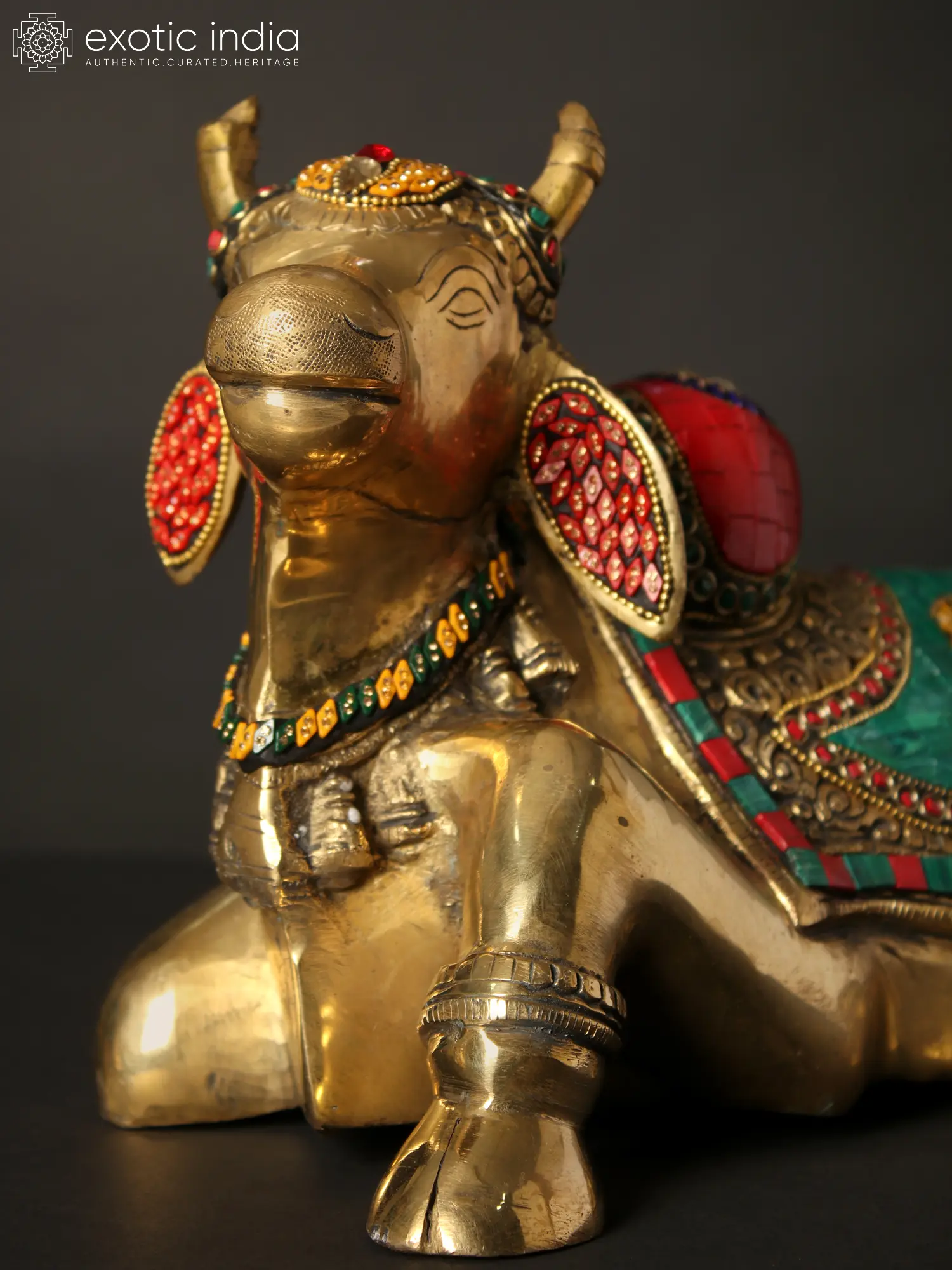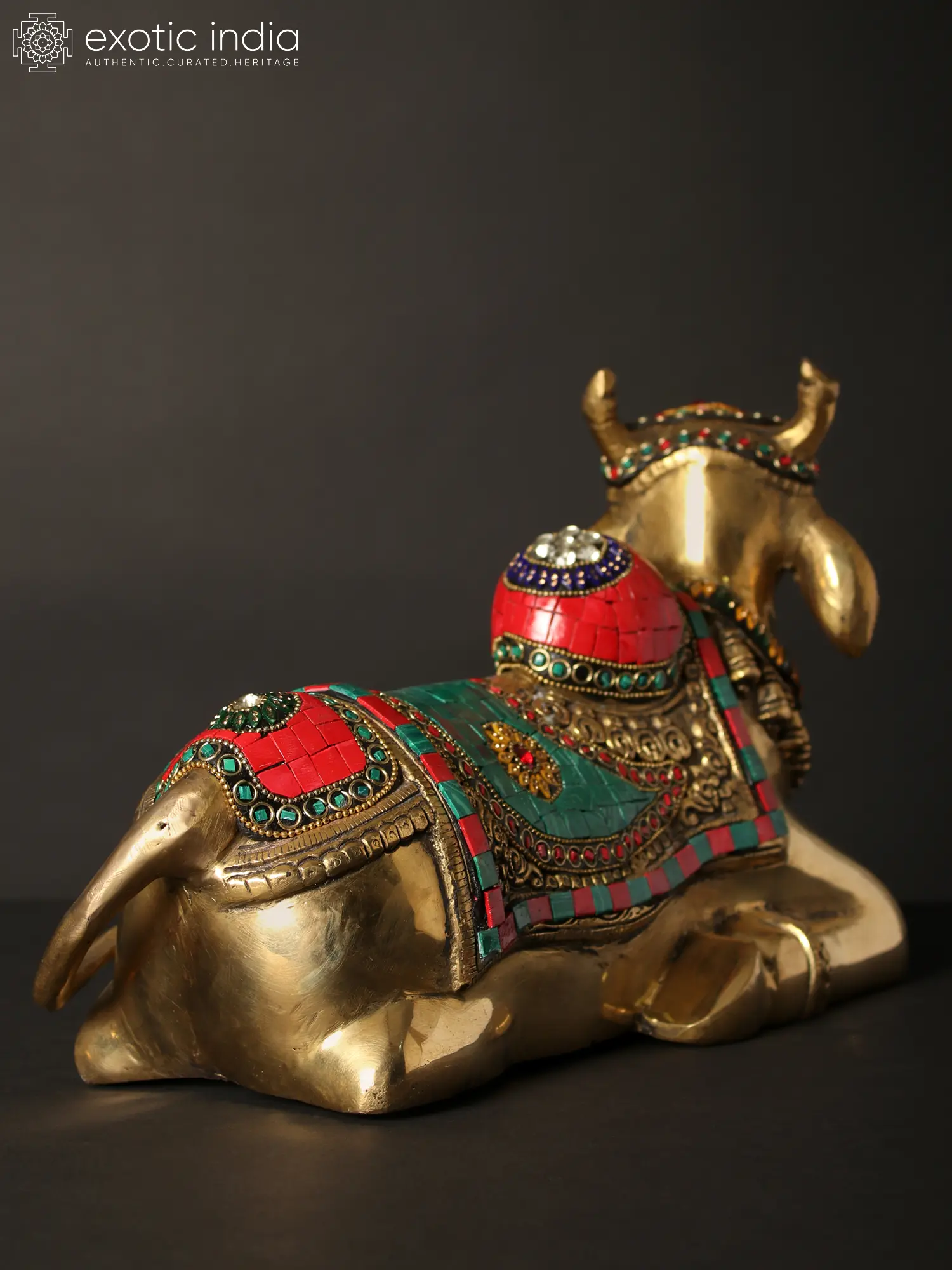 The Nandi-Vahana of Lord Shiva Brass Statue with Inlay Work magnificently embodies the regal essence of Lord Nandi, the patron of Yoga. The statue depicts Nandi in his customary pose, with meticulous inlay work adorning his hump, back covering cloth, and head ornament.