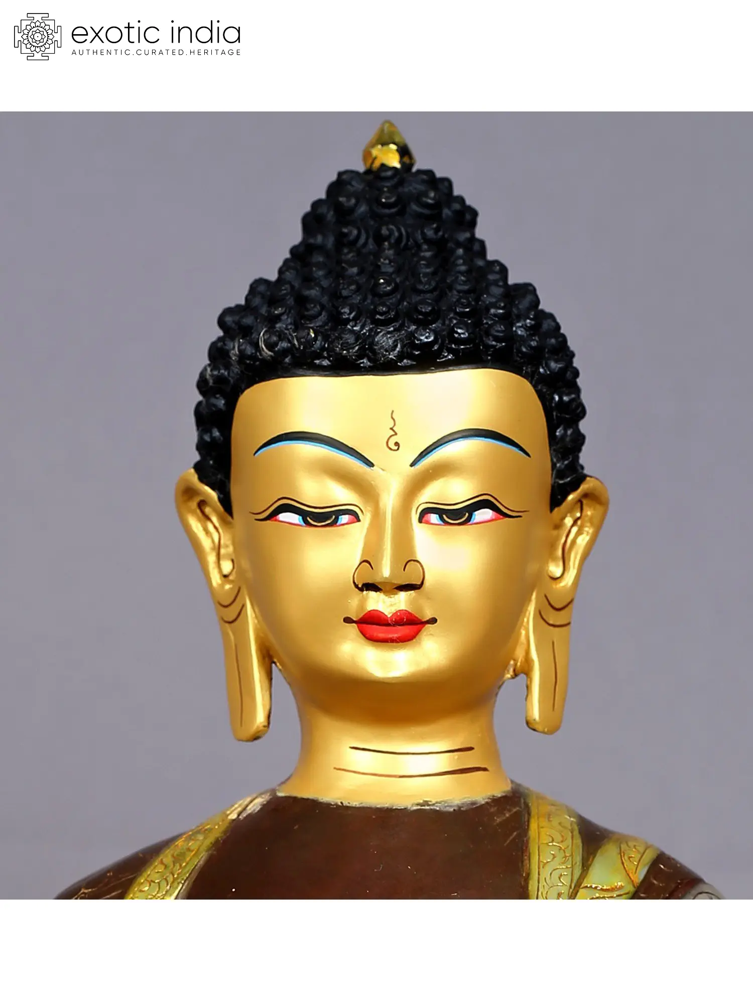 Shakyamuni's features include a distinctive dot, known as the urna (a curl of hair), between his eyebrows, and his neck adorned with three horizontal lines. His extended earlobes represent Buddha's former princely status.
