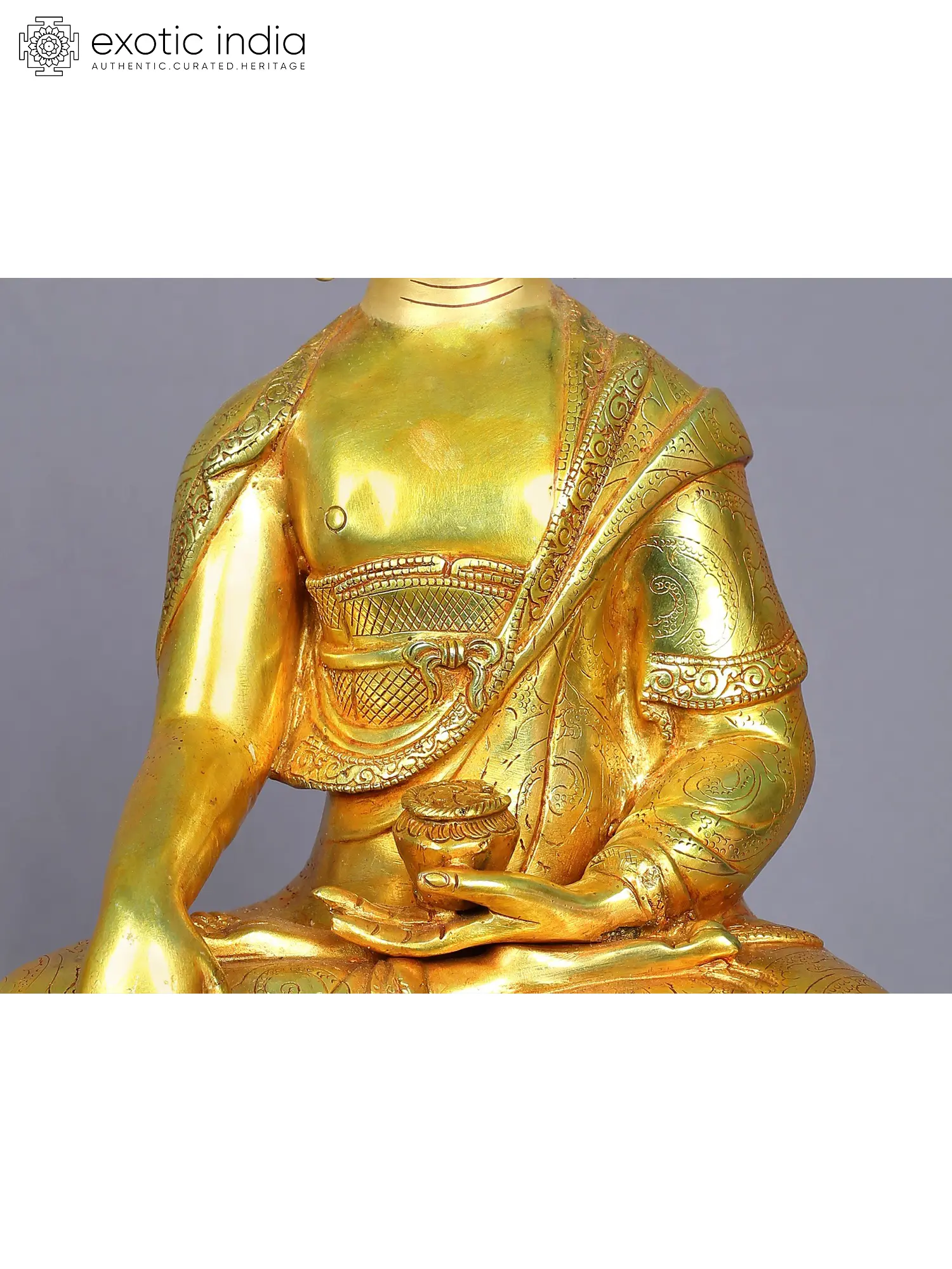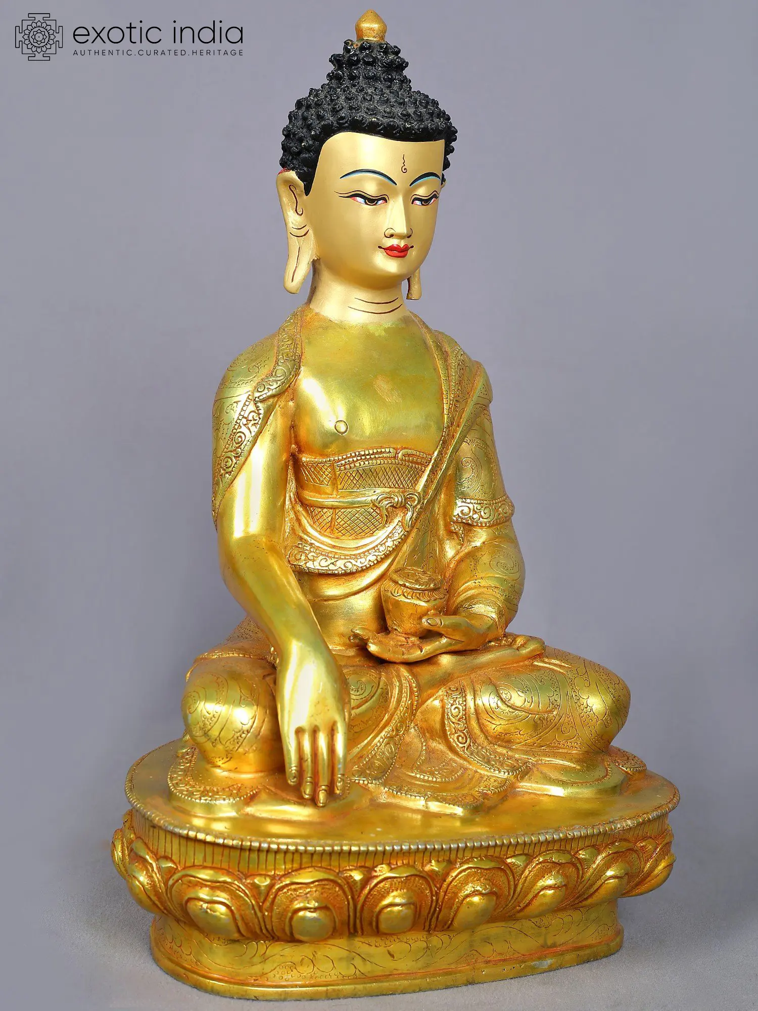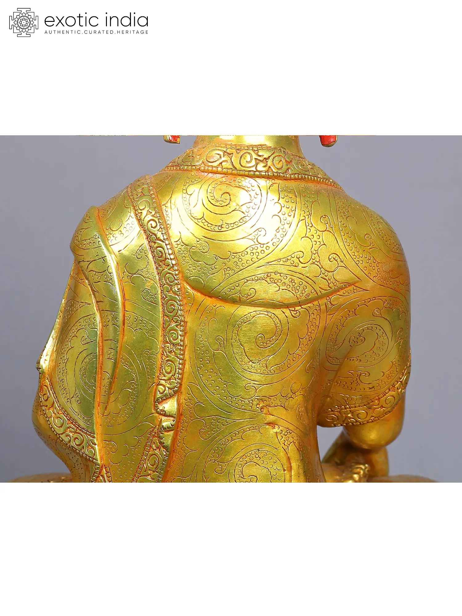 Shakyamuni Buddha is seen in the Bhumisparsha mudra, a gesture symbolic of the moment he attained enlightenment, calling upon the earth as his witness. His elongated earlobes serve as a reference to the weighty earrings once worn by the prince before he relinquished his material wealth. Three distinct fleshy neck rings signify the three realms of existence, while his attire, the monk's robe, or uttarasanga, reflects his deep religious commitment and devotion.