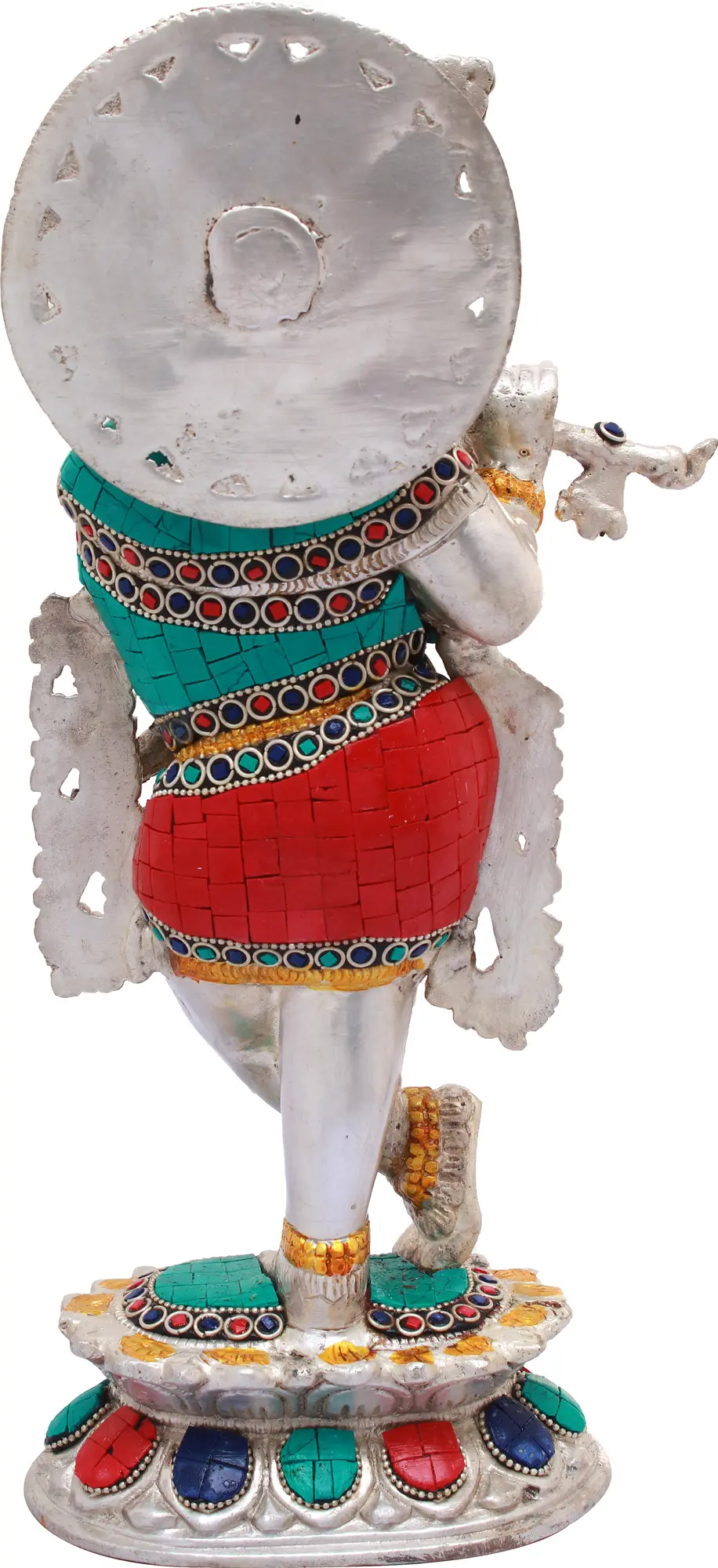 This magnificent statue is meticulously handcrafted in India, a land renowned for its rich artistic heritage. The skilled artisans have transformed brass into a breathtaking work of art, imbuing it with life and spirit. The statue is further adorned with intricate inlay work, featuring a vibrant palette of stones. Red, blue, and green gemstones are artfully set into the divine form, creating a dazzling display of color. These stones are not merely decorative; they are believed to possess auspicious energies, enhancing the spiritual aura of the idol. The intricate detailing extends to the floral motifs on the base and the divine aura surrounding Krishna's head, showcasing the dedication and mastery of the craftsman.