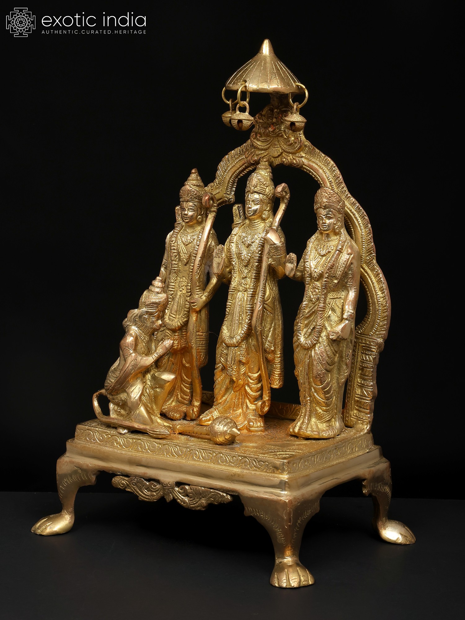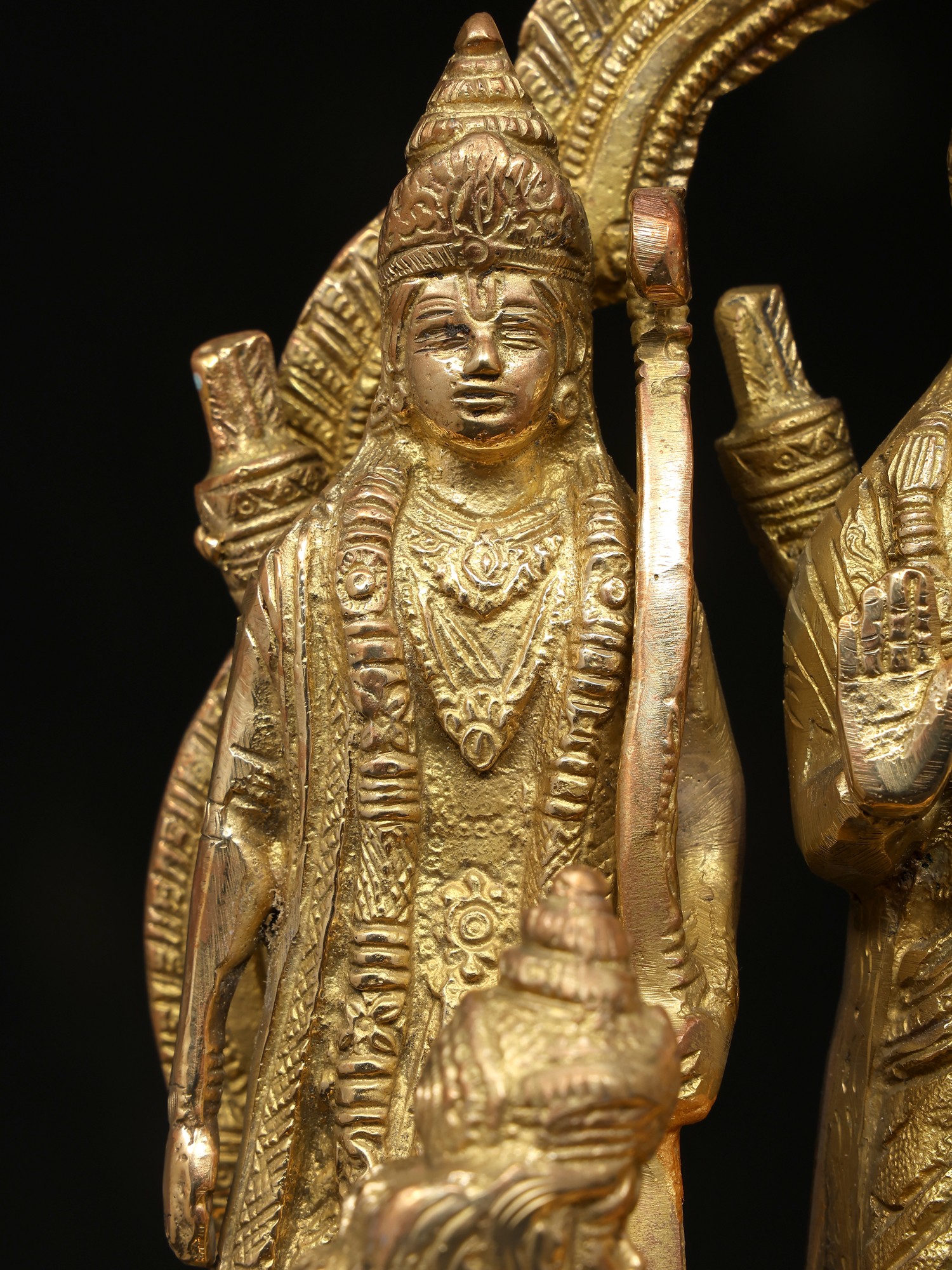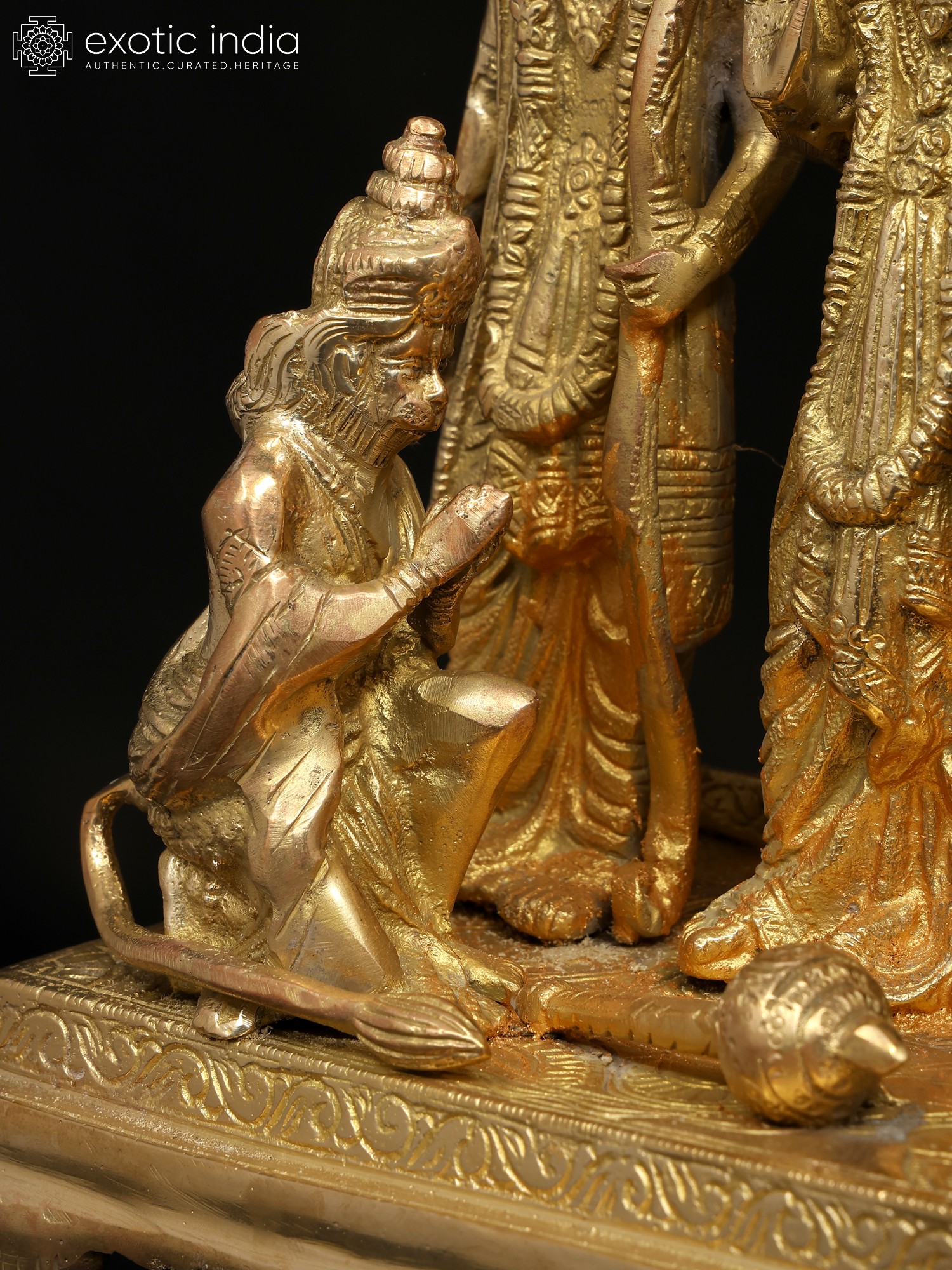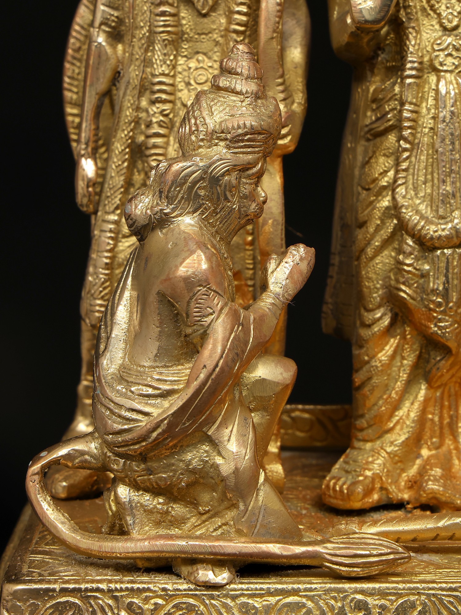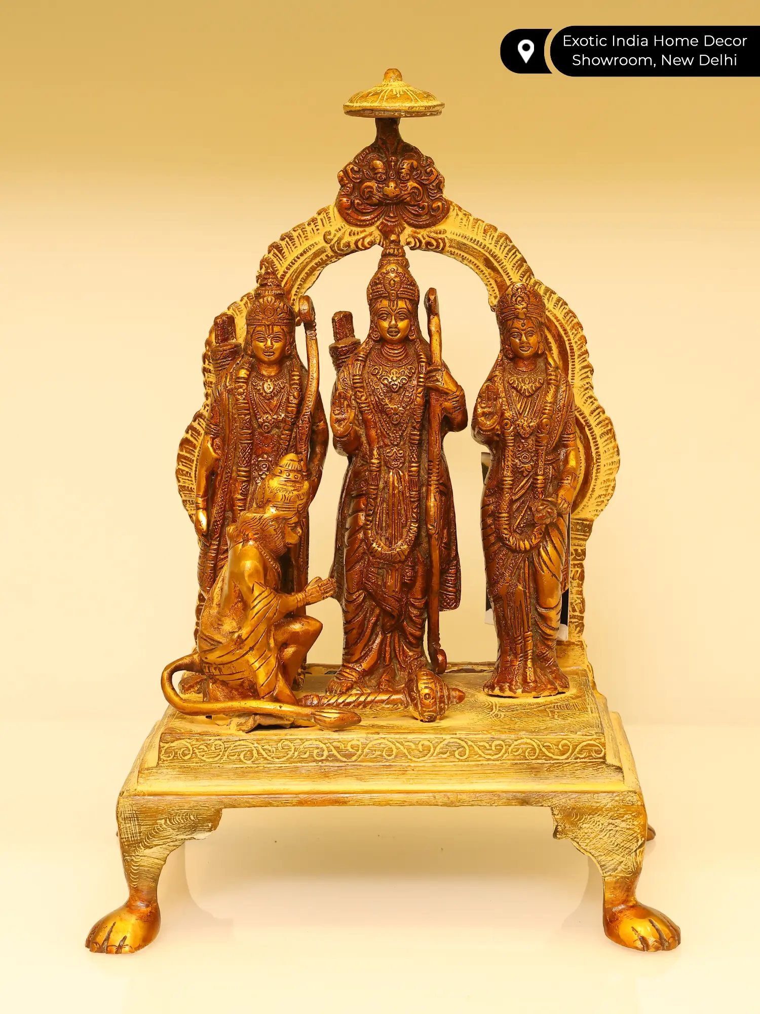 Step into the divine world of Lord Rama with our Shri Rama Durbar Brass Sculpture, cast with care in India. Shri Rama, the embodiment of dharma (righteousness) and duty, is depicted in regal splendour, accompanied by Sita, Lakshmana, and Hanuman. This sacred gathering represents the epitome of moral values and the pursuit of justice, fundamental concepts in Hindu philosophy. The intricate details, from Rama's royal attire to the devotion in Hanuman's eyes, reflect the skill and artistry of Indian craftsmen.