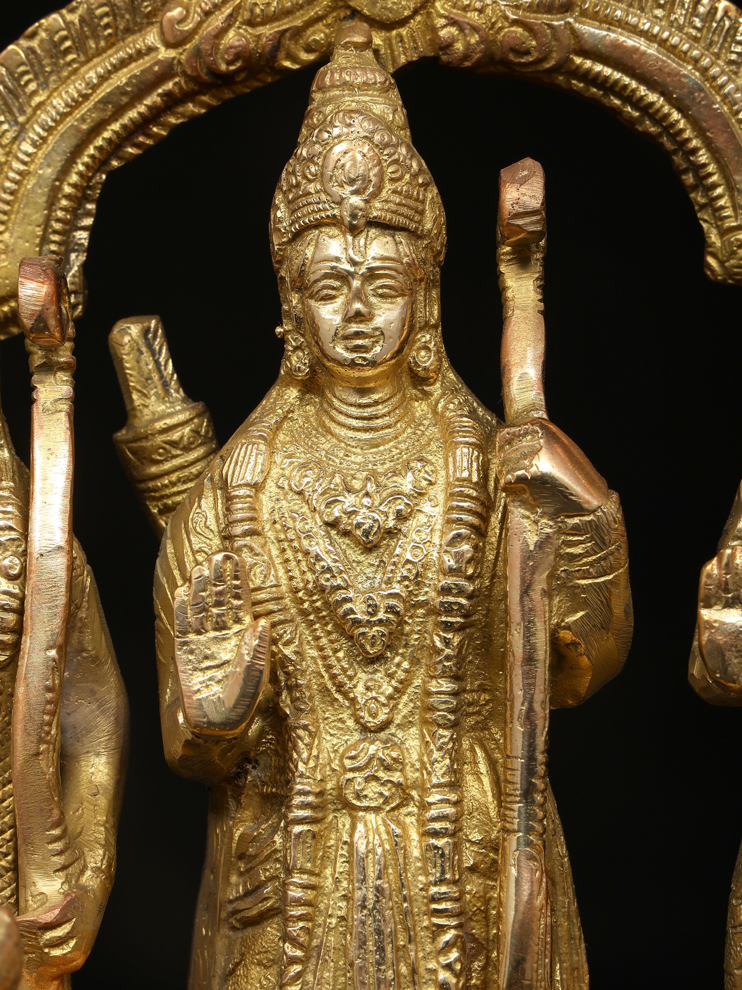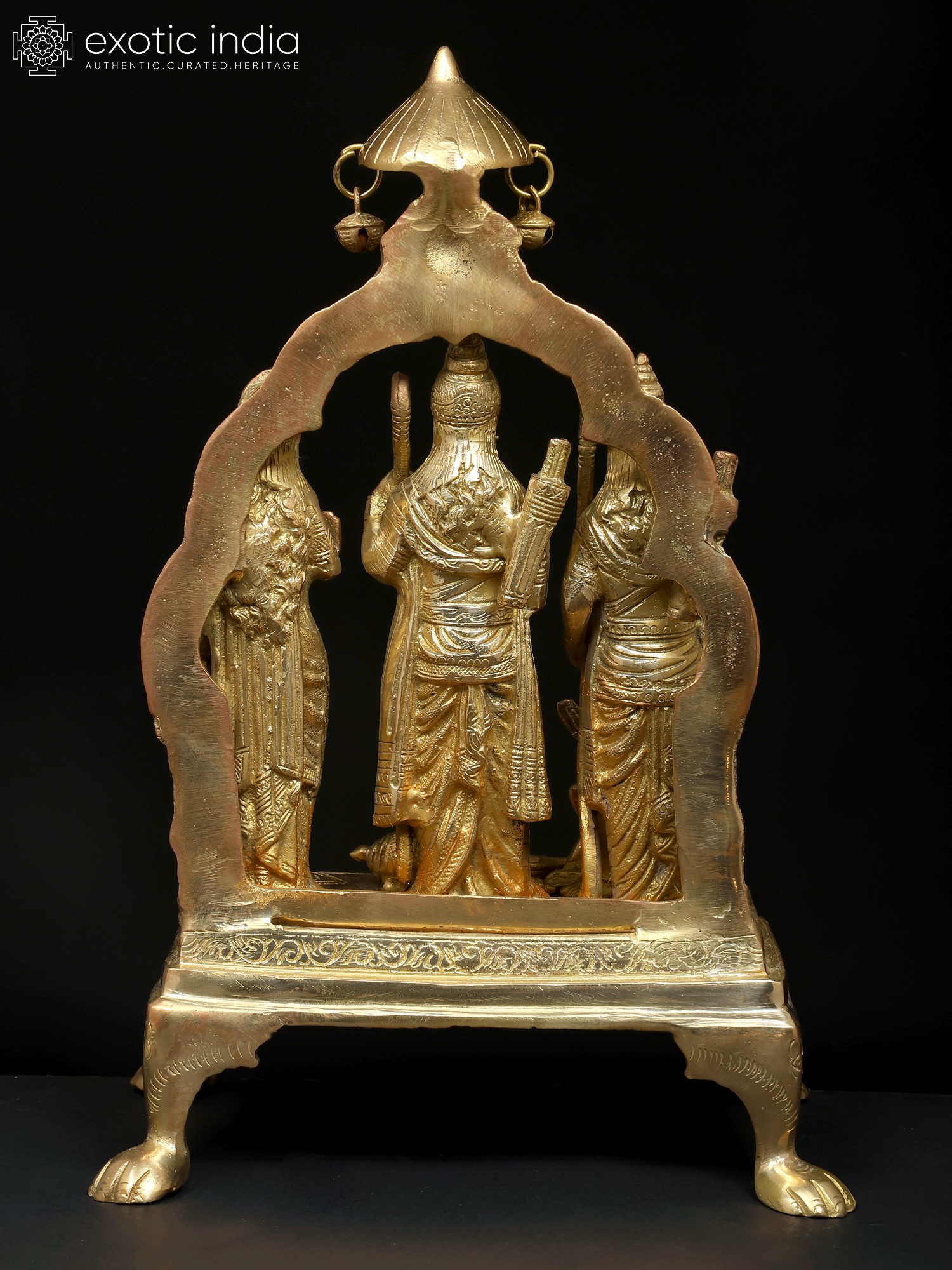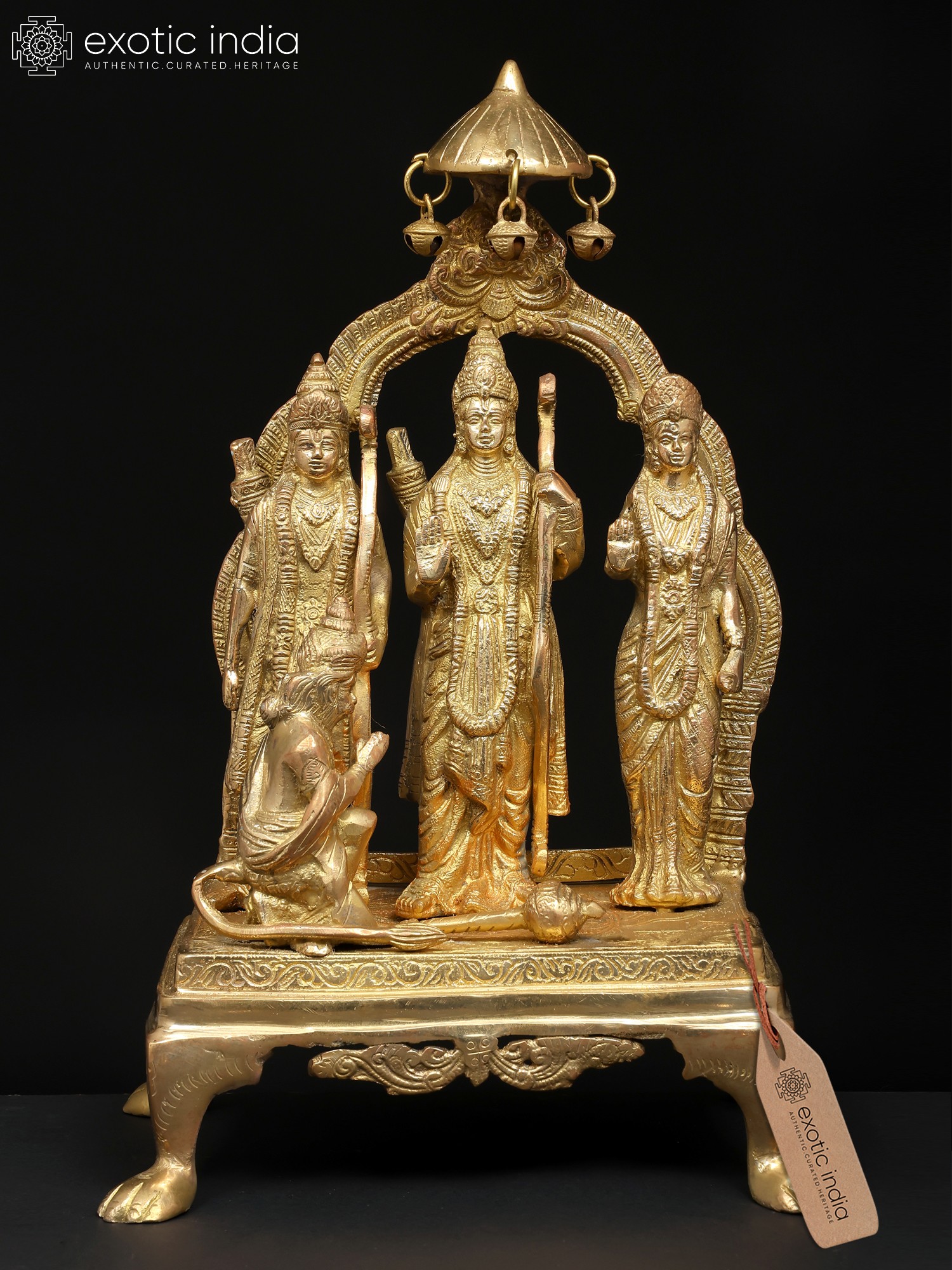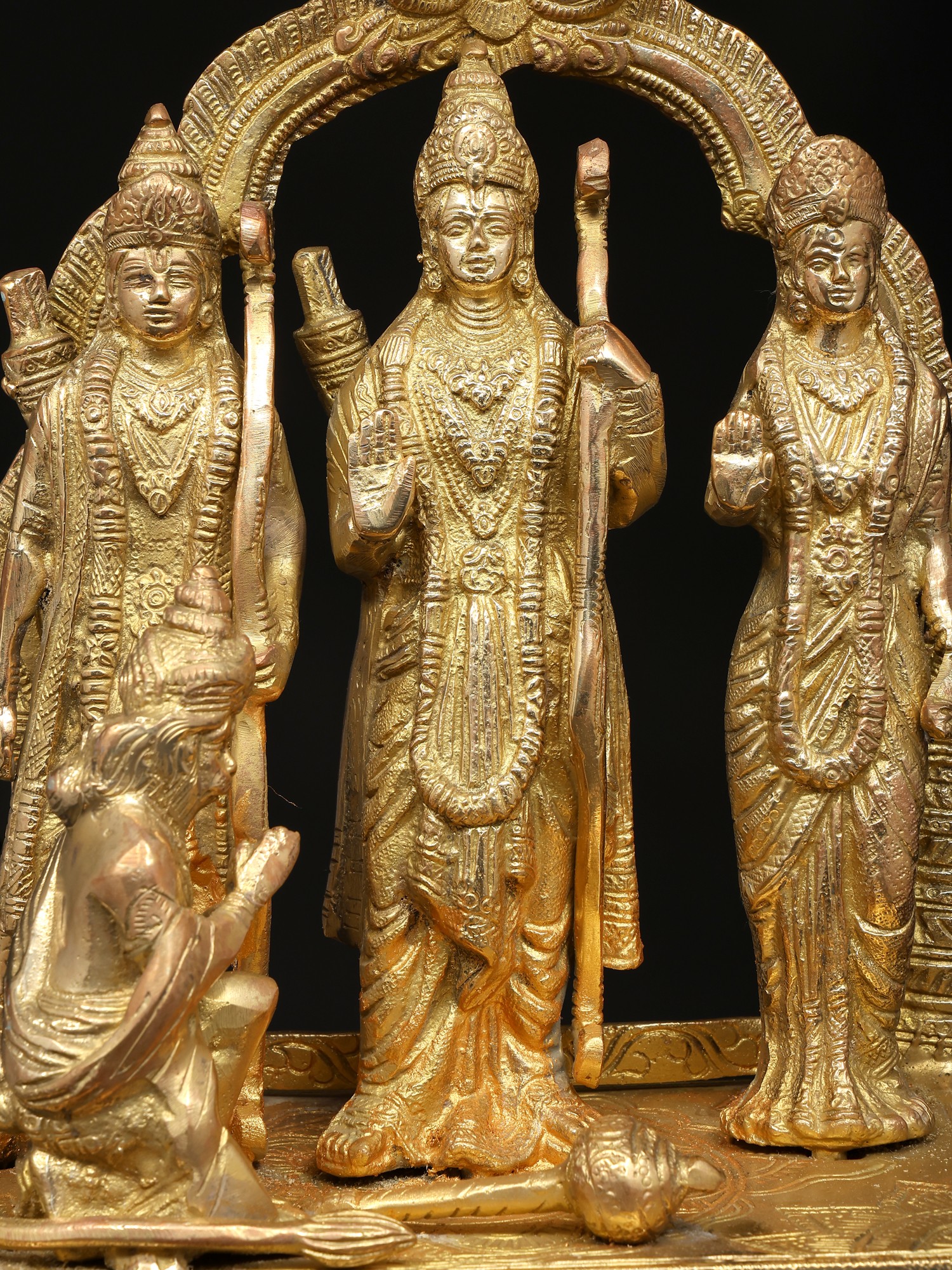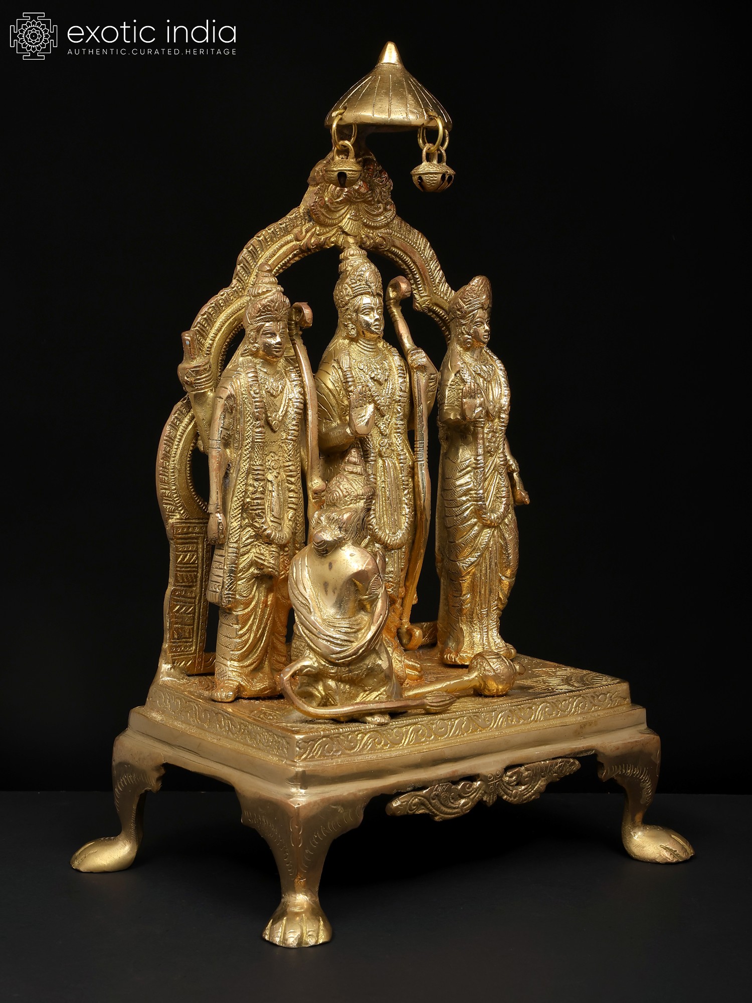 Step into the divine world of Lord Rama with our Shri Rama Durbar Brass Sculpture, cast with care in India. Shri Rama, the embodiment of dharma (righteousness) and duty, is depicted in regal splendour, accompanied by Sita, Lakshmana, and Hanuman. This sacred gathering represents the epitome of moral values and the pursuit of justice, fundamental concepts in Hindu philosophy. The intricate details, from Rama's royal attire to the devotion in Hanuman's eyes, reflect the skill and artistry of Indian craftsmen.