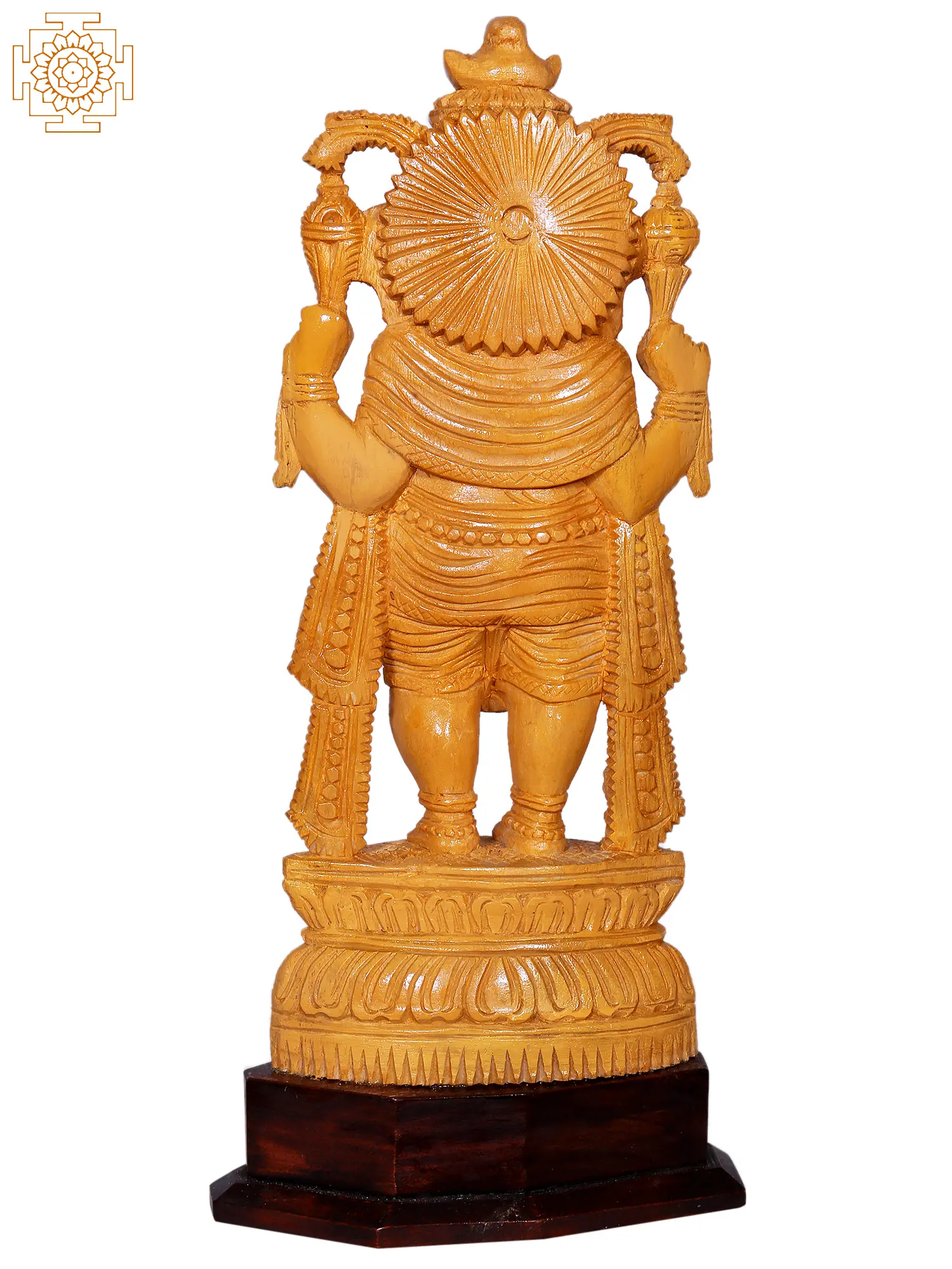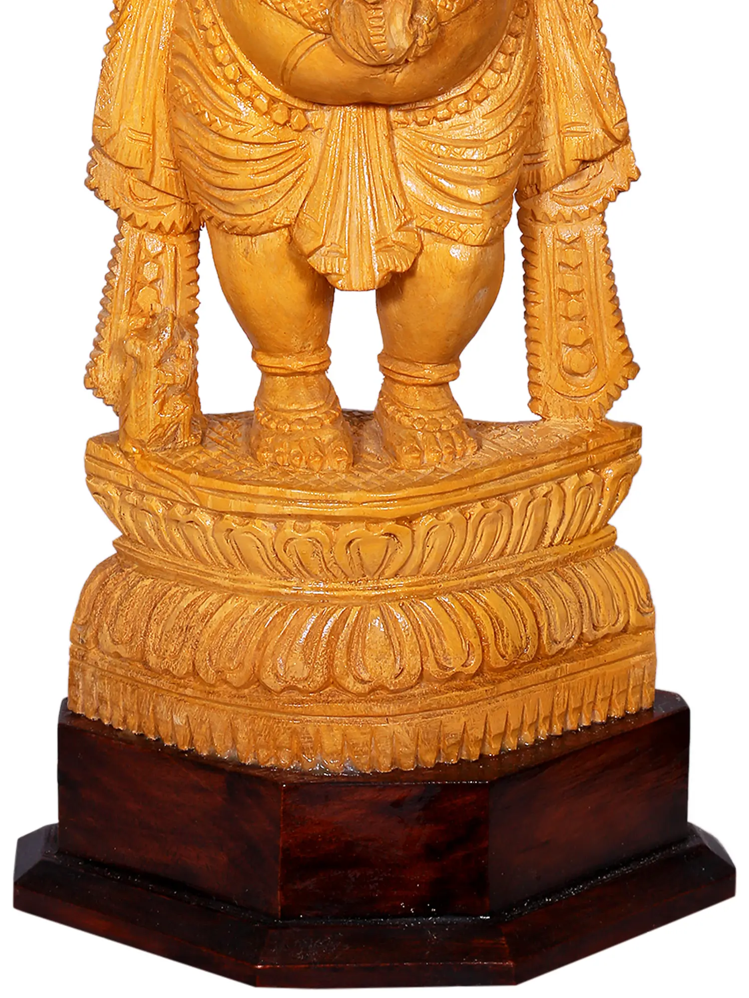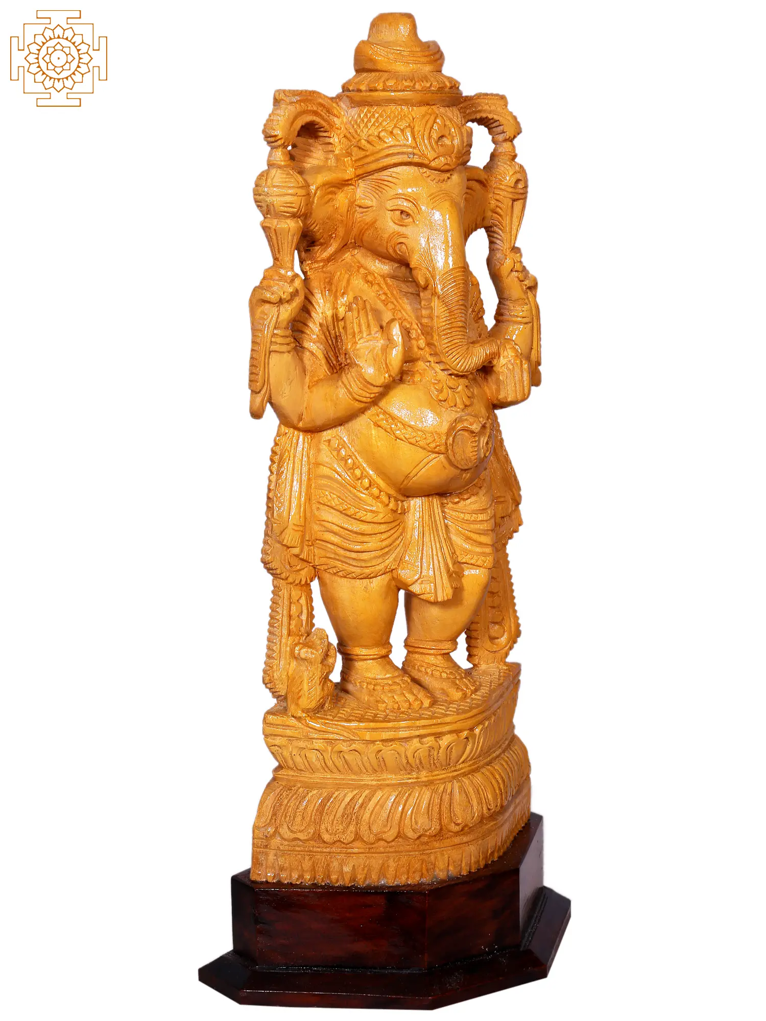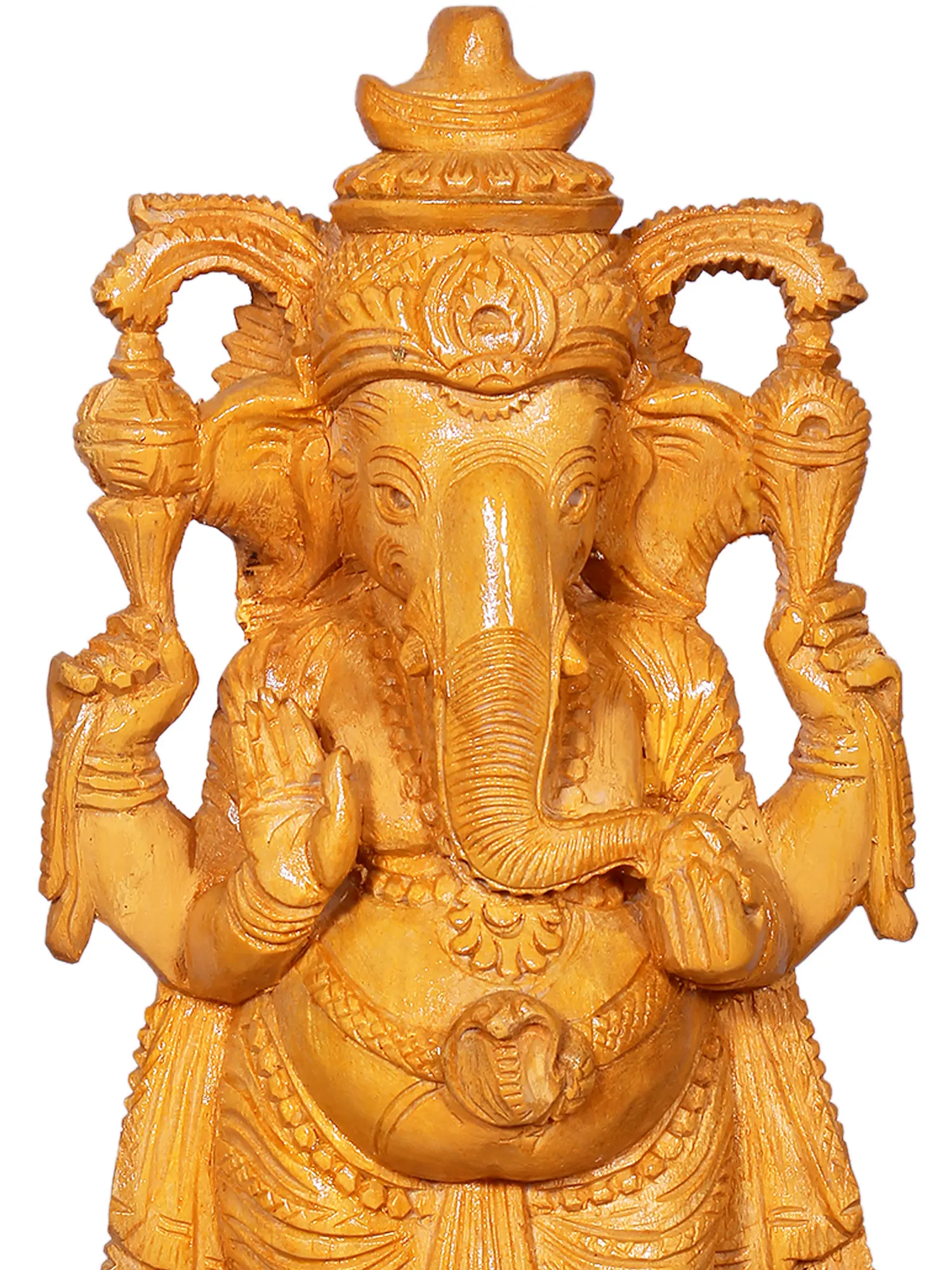 In this magnificent wooden statue, “Chaturbhuja Ganesha” stands as a mesmerizing embodiment of divinity. His form exudes grace, with a noose and goad held in two hands, ensuring the bondage of life’s obstacles and the guidance towards righteousness. His front right hand extends in the Abhaya Mudra, a reassuring gesture of protection. Meanwhile, the Lord enjoys a sweet “Modak”, symbolizing the sweet rewards of devotion. A serpent sensuously winds around his ample belly, emblematic of his supreme power. Adorned in regal attire, and crowned in glory, this wooden marvel resonates with the celestial presence of Chaturbhuja Ganesha.
