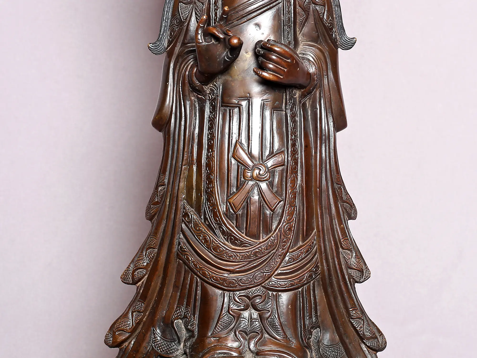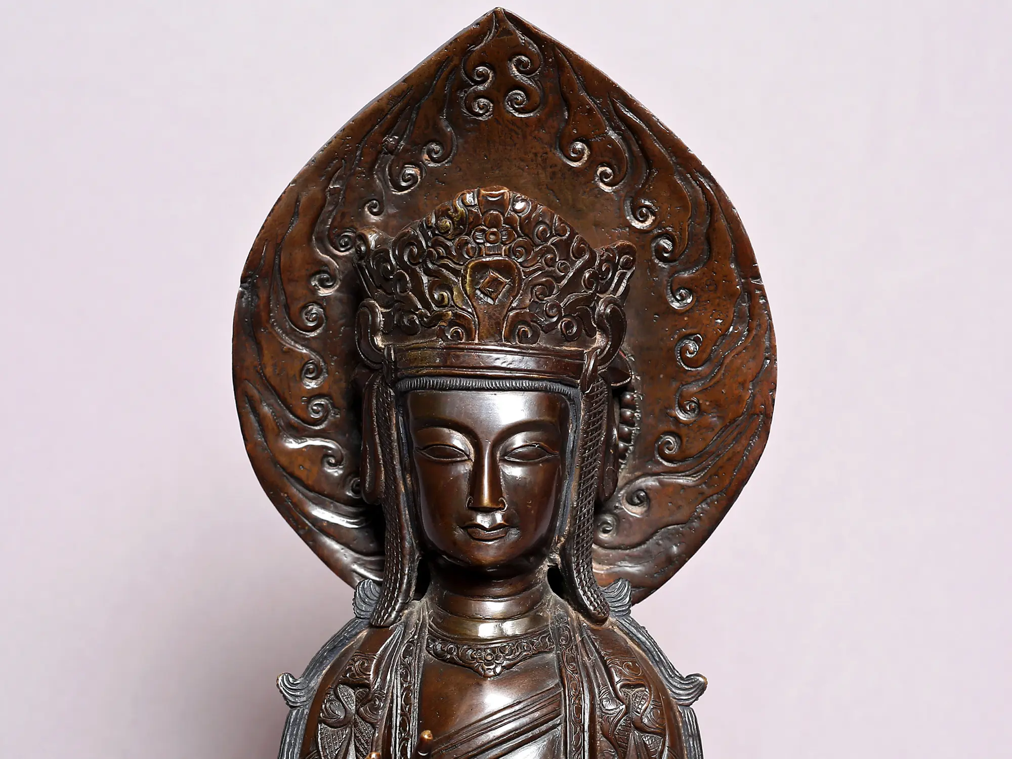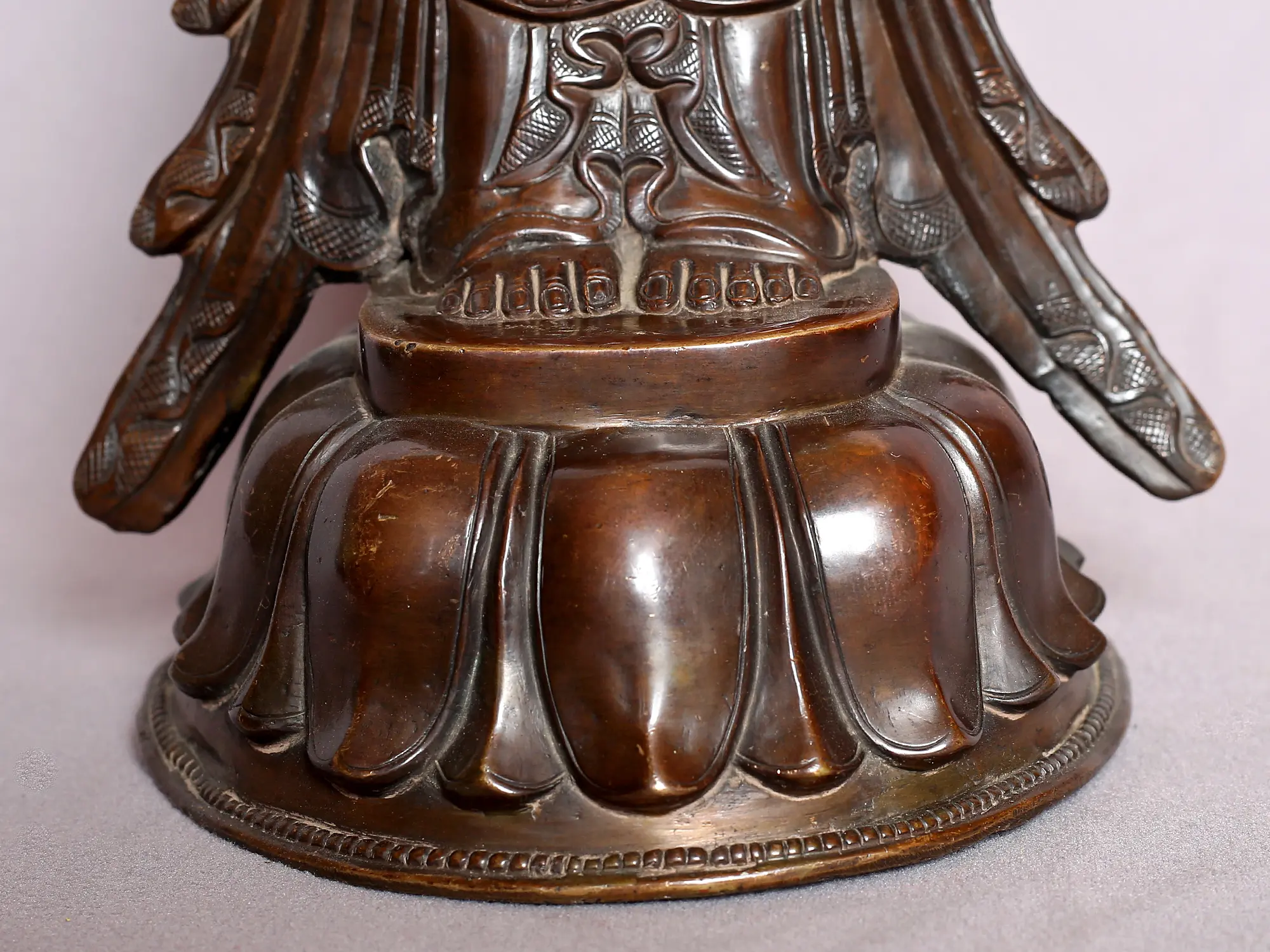 This exquisite 13" standing Guanyin Buddha statue from Nepal portrays the compassionate Bodhisattva in a gentle pose, radiating tranquillity and grace. Crafted with meticulous attention to detail, the figure showcases the serene expression on Guanyin's face and the intricate folds of her flowing robes. The significance of this statue lies in Guanyin's role as the embodiment of compassion and mercy in Buddhism. Believed to alleviate suffering and grant blessings, Guanyin is revered by millions as a compassionate deity. The statue serves as a spiritual reminder and a symbol of hope, inspiring devotees to cultivate kindness and empathy in their lives.