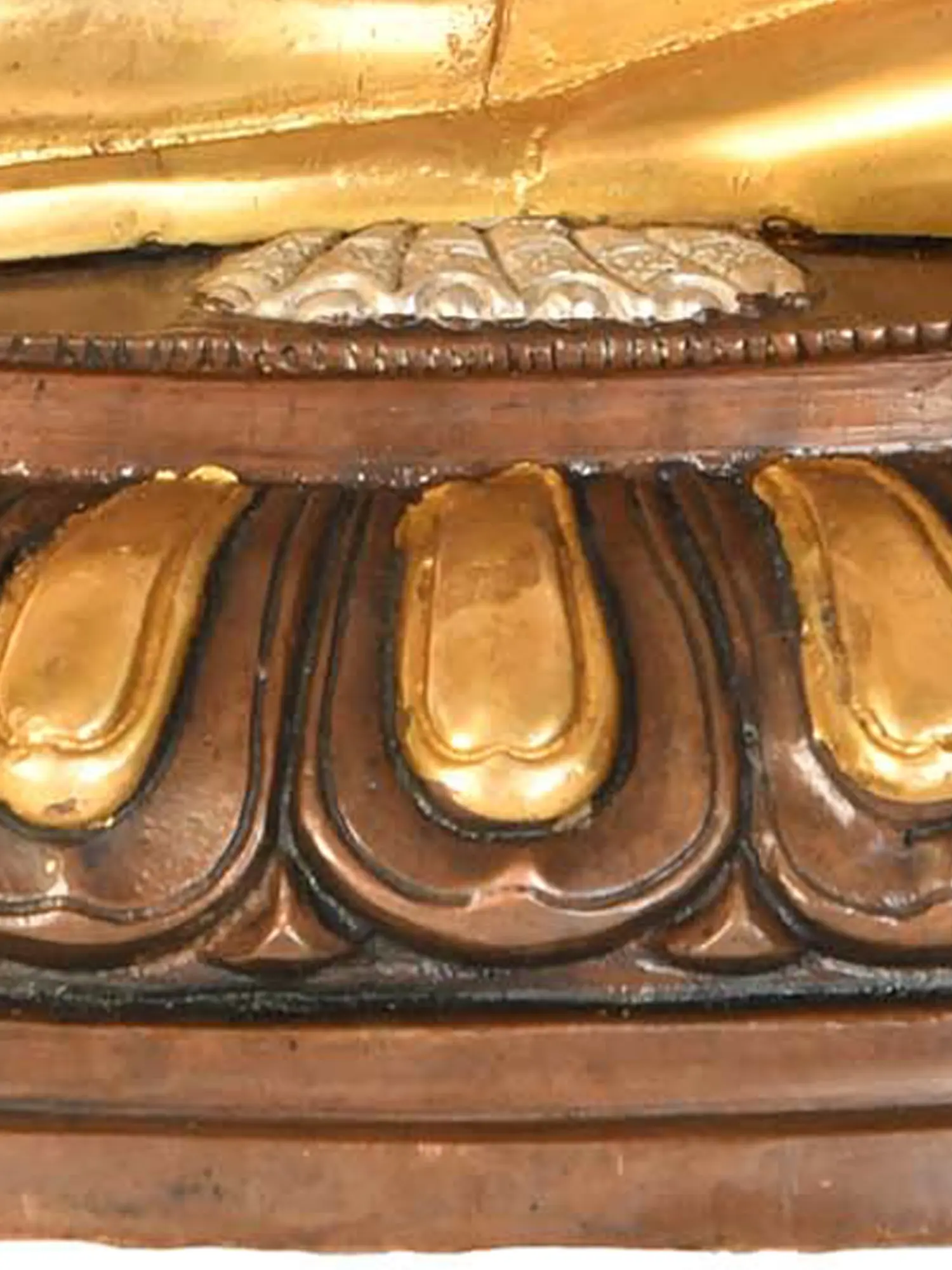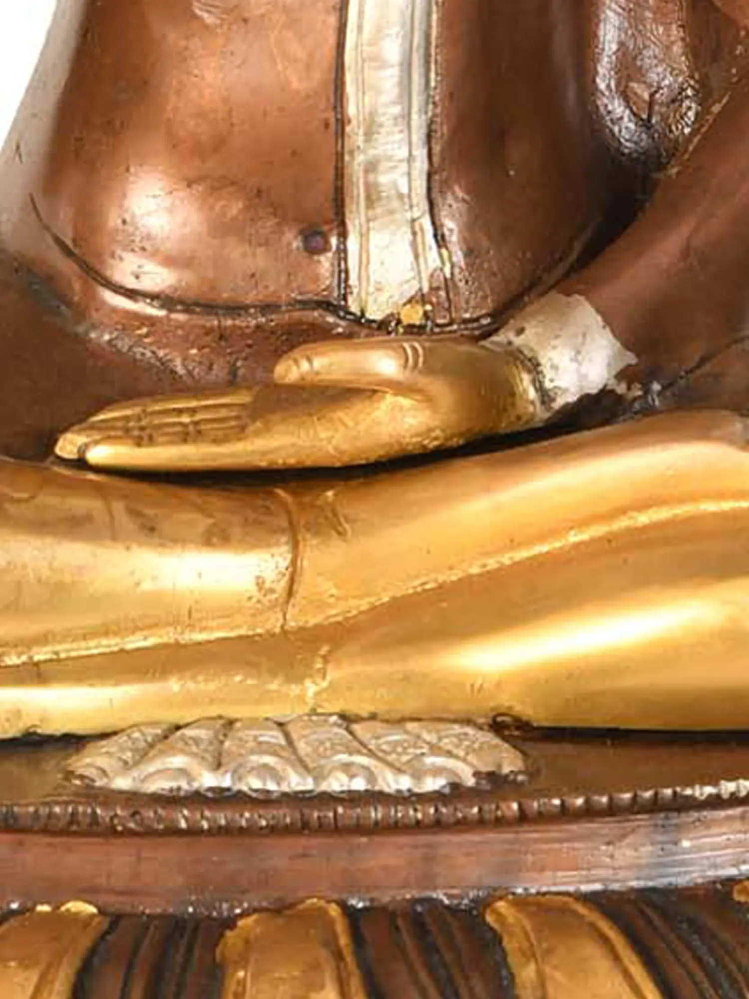 This exquisite brass statue captures the serene presence of the Buddha in a posture of benediction, a symbol of peace and good fortune. Crafted with meticulous artistry in India, this piece embodies a spiritual depth that transcends geographical boundaries. The rich, contrasting patinas of brass and copper, enhanced by a delicate silver inlay on the robe, lend an aura of ancient wisdom and profound tranquility. The smooth, flowing lines and the gentle expression on the Buddha's face invite contemplation and a sense of inner calm. ––––––––––