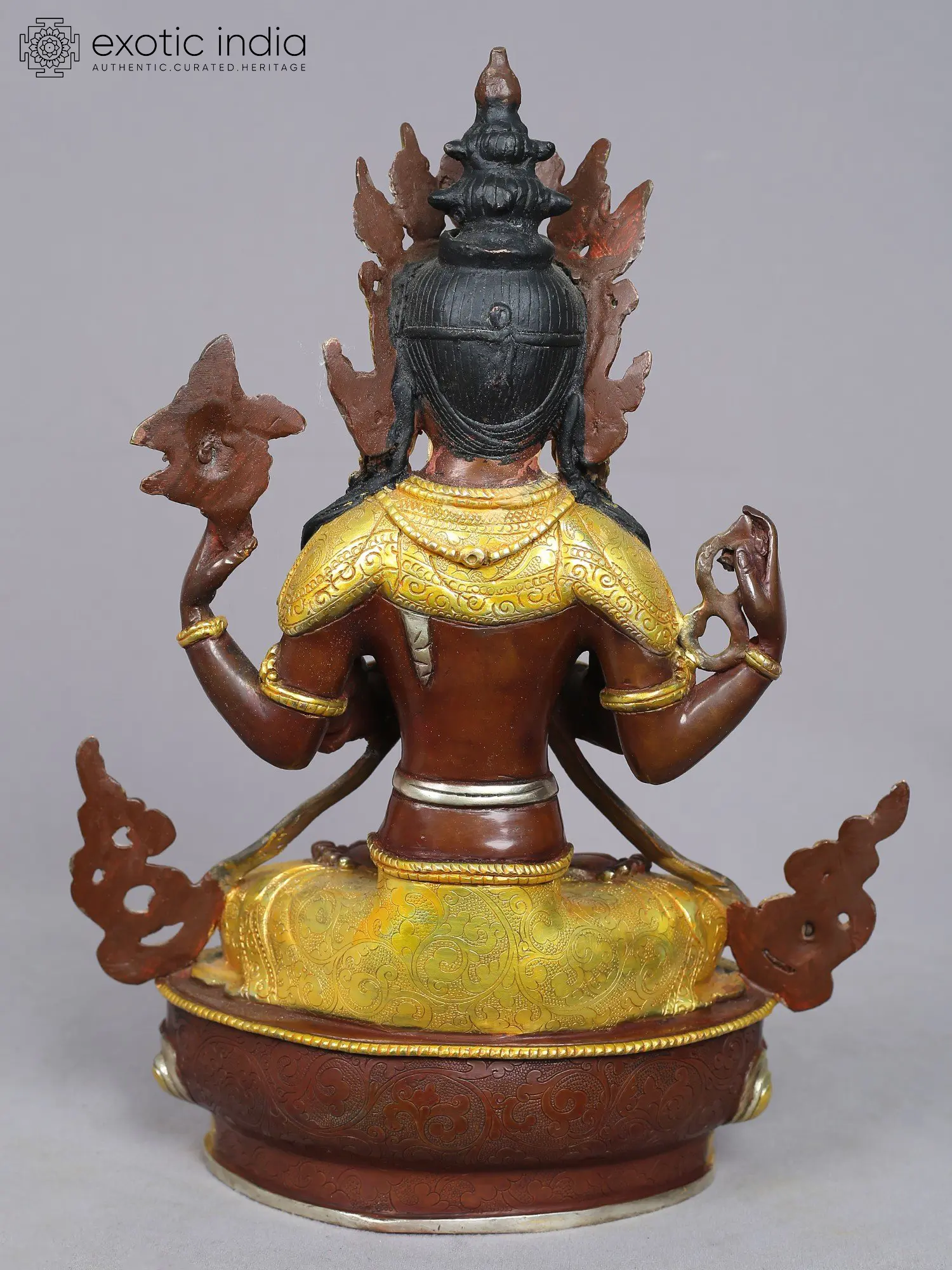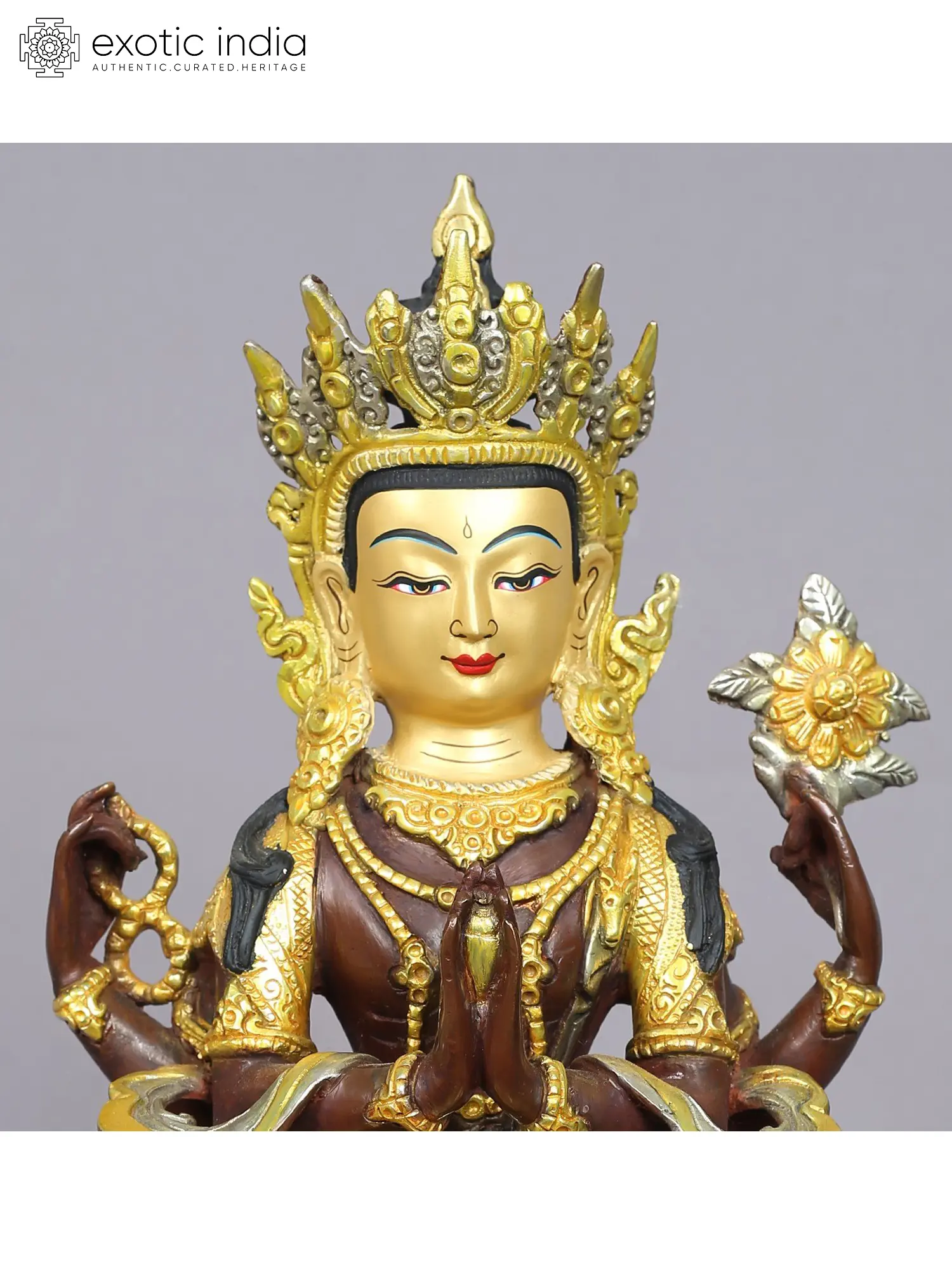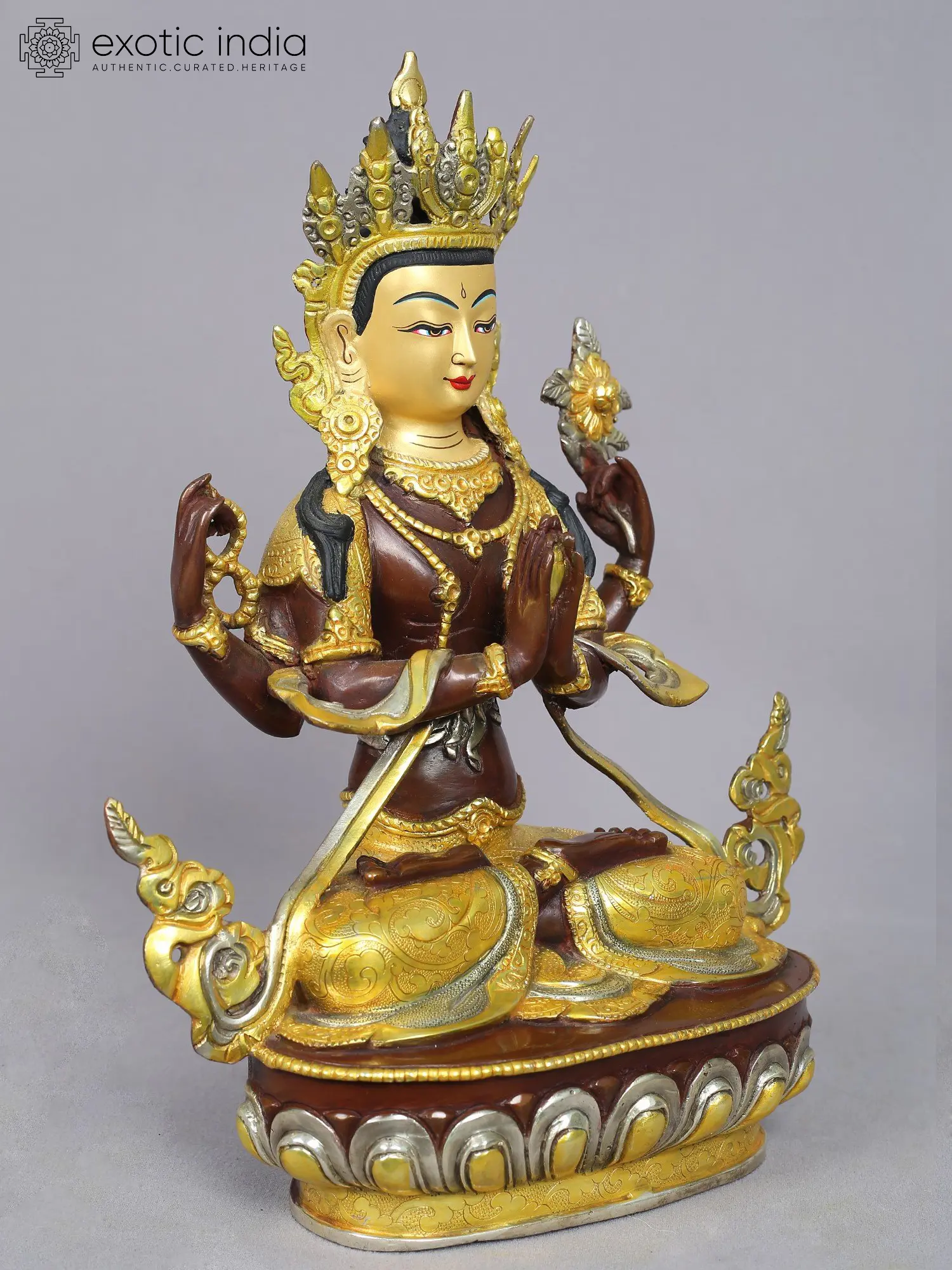 His two front hands are joined in devotion, symbolizing his compassionate heart. In his upper right hand, he holds a crystal akshamala, signifying the endless cycle of existence. His left hand cradles a lotus, offering salvation from suffering to enlightenment. Draped in rich golden silks, seated in the Sukhasana,(straight pose), and resting on lotus petals, Avalokiteshvara represents boundless compassion and grace.