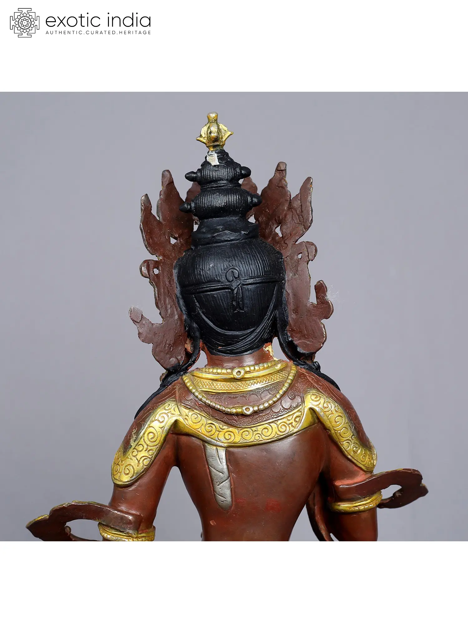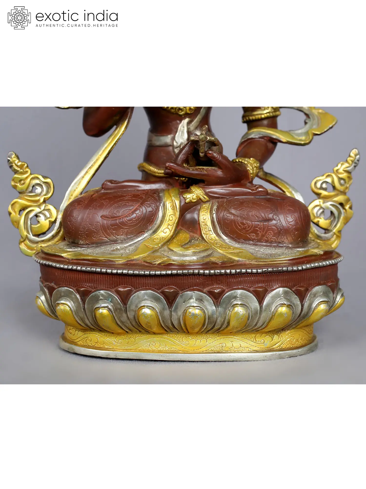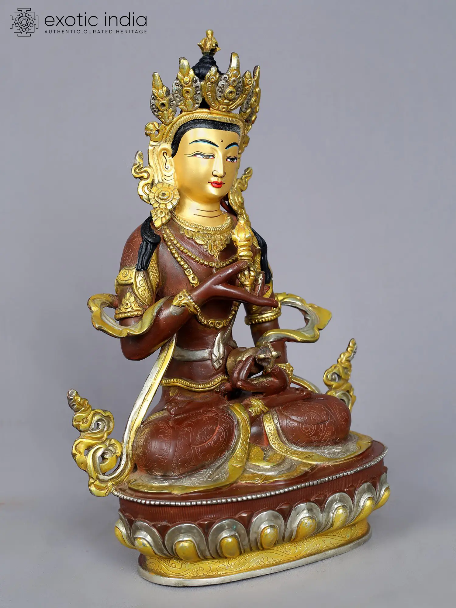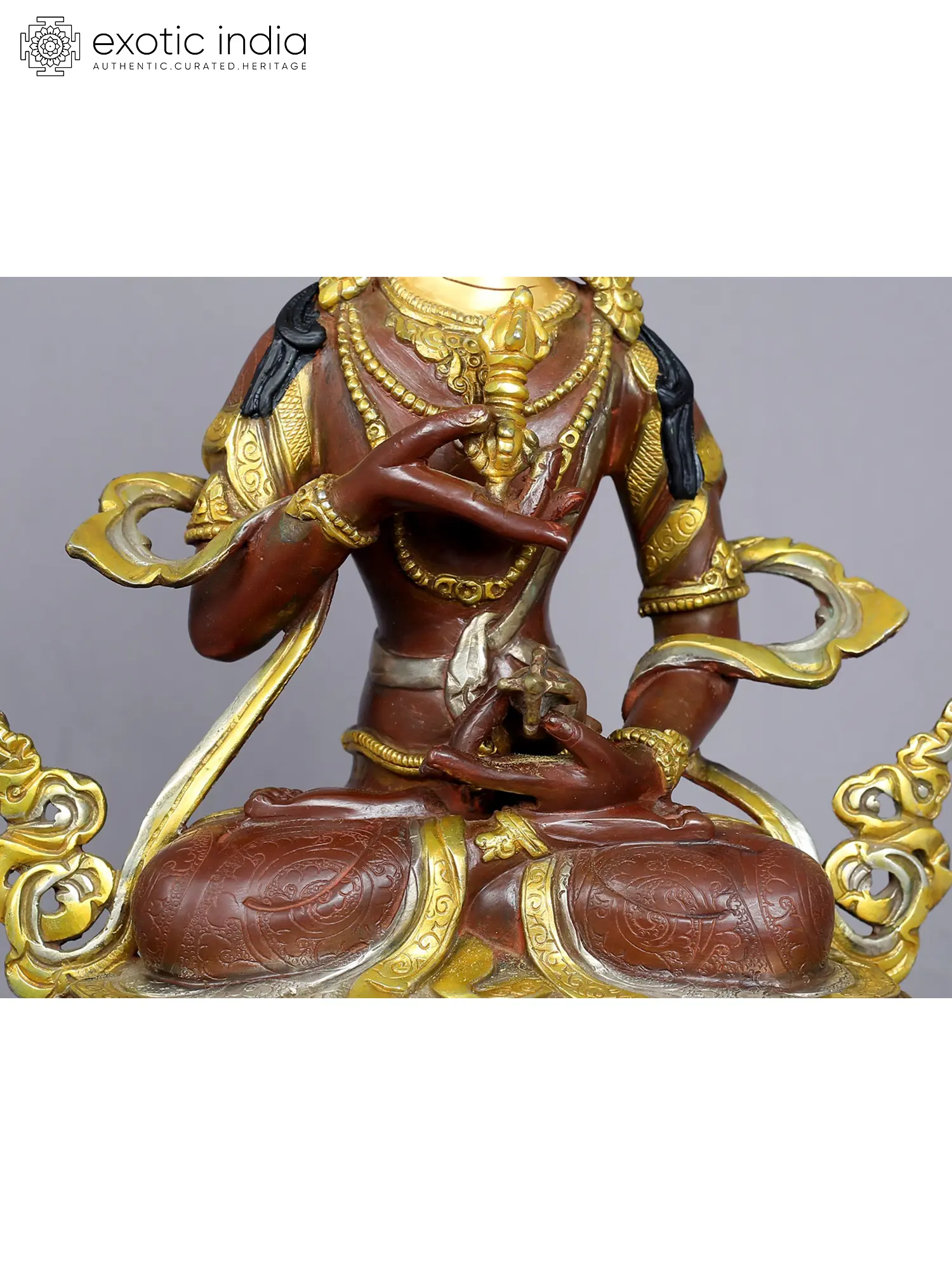 In Vajrasattva's left hand, he cradles a bell, which serves as a symbol representing a profound understanding of the genuine essence of reality. In his right hand, he firmly grasps a golden vajra, symbolizing the compassionate and skilful application of this insight to assist other beings. Adorned with opulent gold and jewel ornaments, including a crown, earrings, bracelets, and necklaces, he is draped in rich silks. Seated in a vajra posture, he slightly sways to the left, resting upon a moon disc above a lotus.