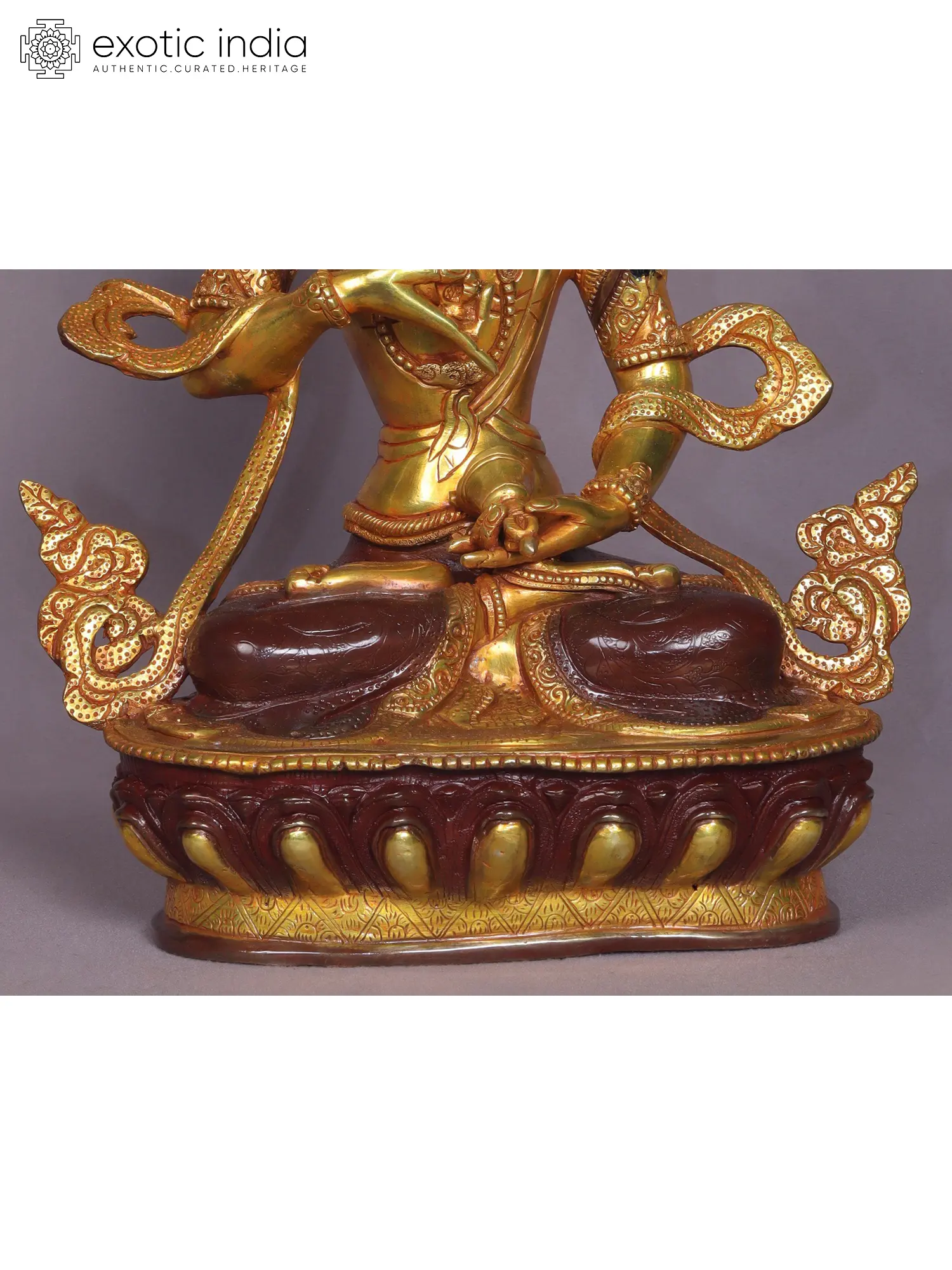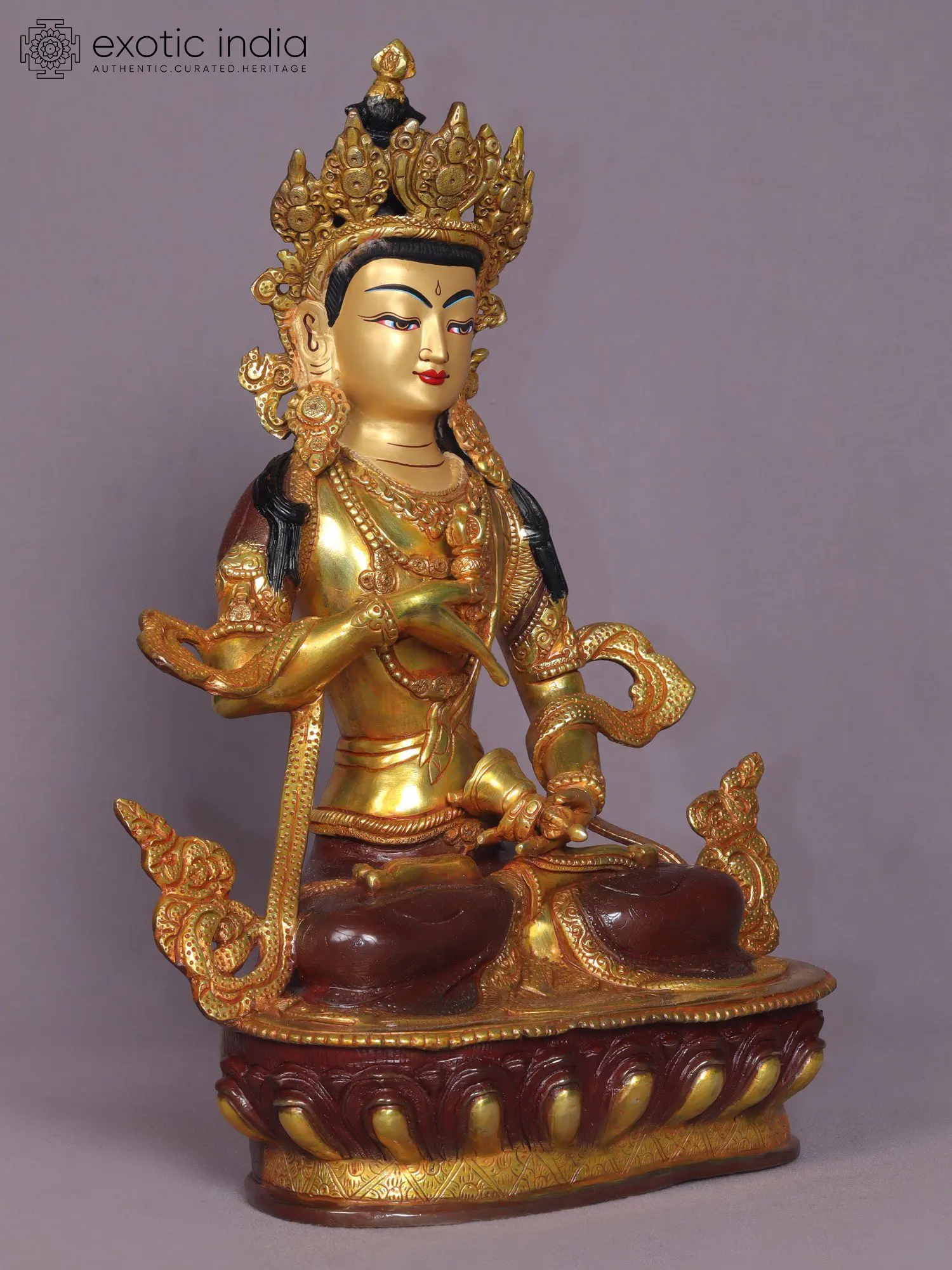 With a vajra gently cradled at his heart in his right hand and a bell held near his abdomen in his left hand, Vajrasattva symbolizes the union of wisdom and skilful means. He gracefully sits upon a moon disc atop a lotus seat, adopting a tranquil posture with crossed legs.