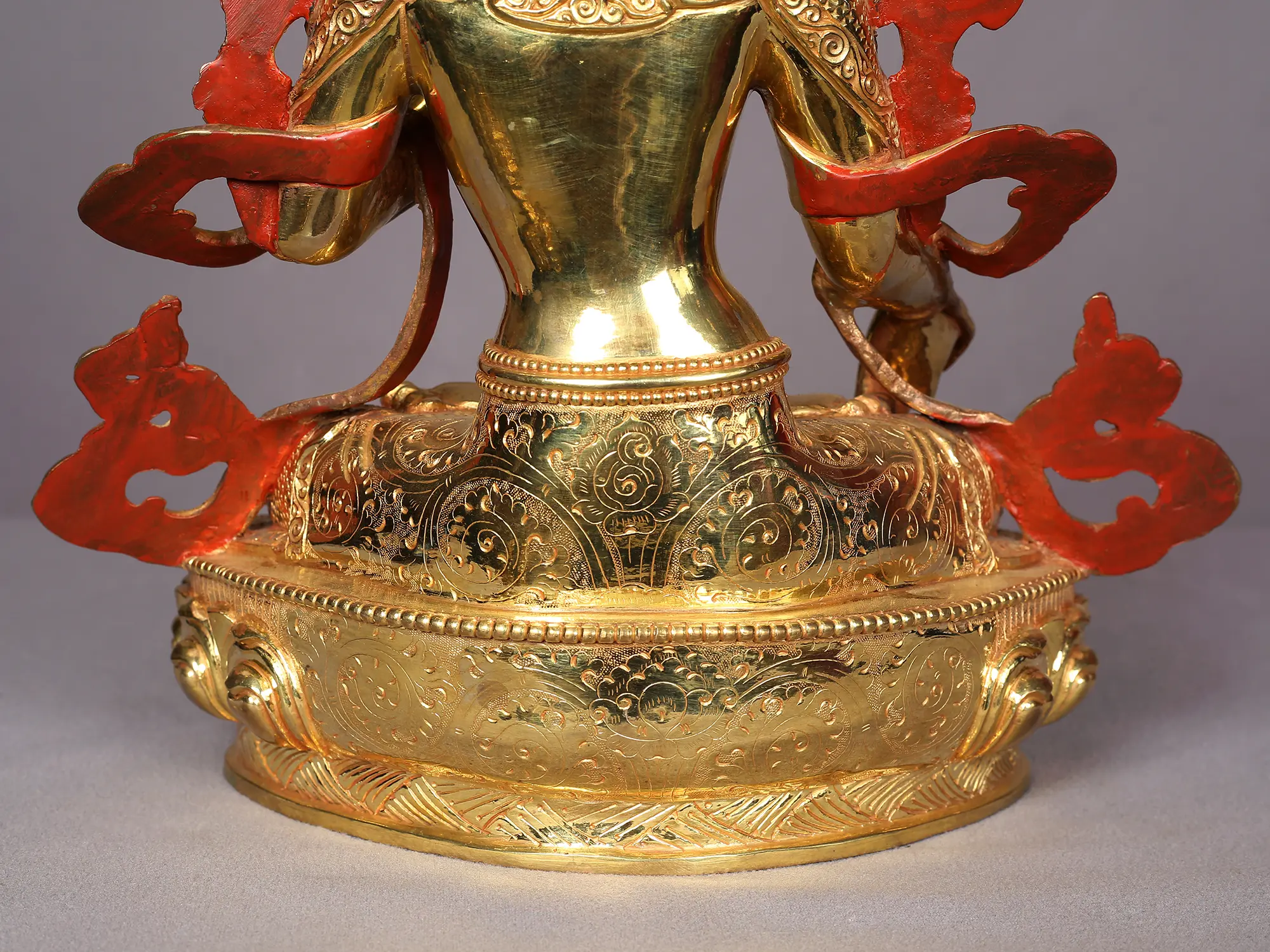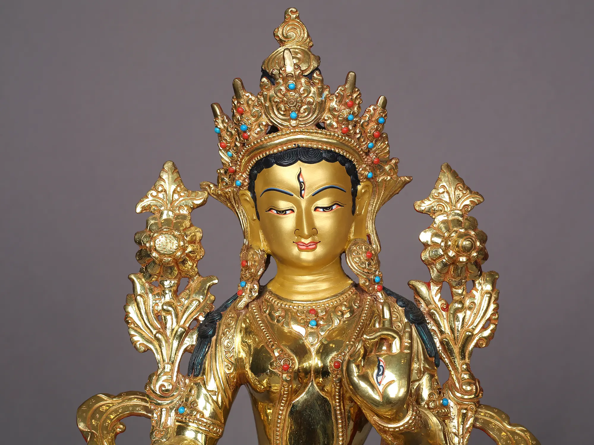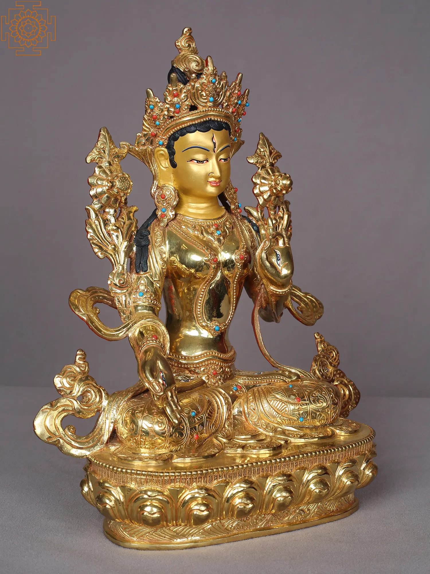 Embodying the essence of divine motherhood, which salvages the children from the troubles of the world, goddess White Tara in this handmade copper with a gold statue from Nepal is delineated with awe-inspiring realism. She is seated on a lotus throne, adorned in glimmering attire and traditional ornaments studded with precious stones. The eyes painted on her countenance and limbs are highlighting her powers as Saptalochani, the seven-eyed one, who protects her devotees from the turbulence of the world and guides them to enlightenment.