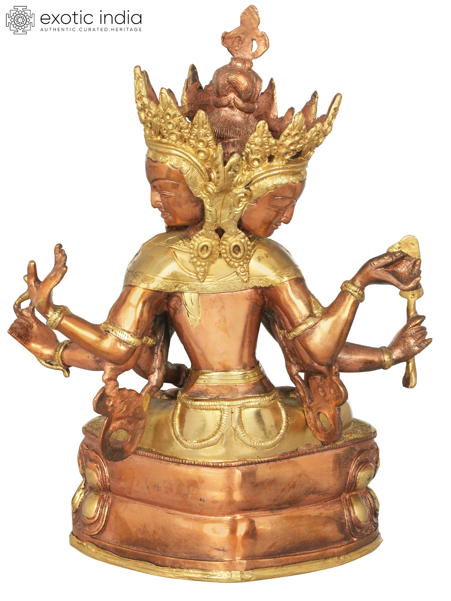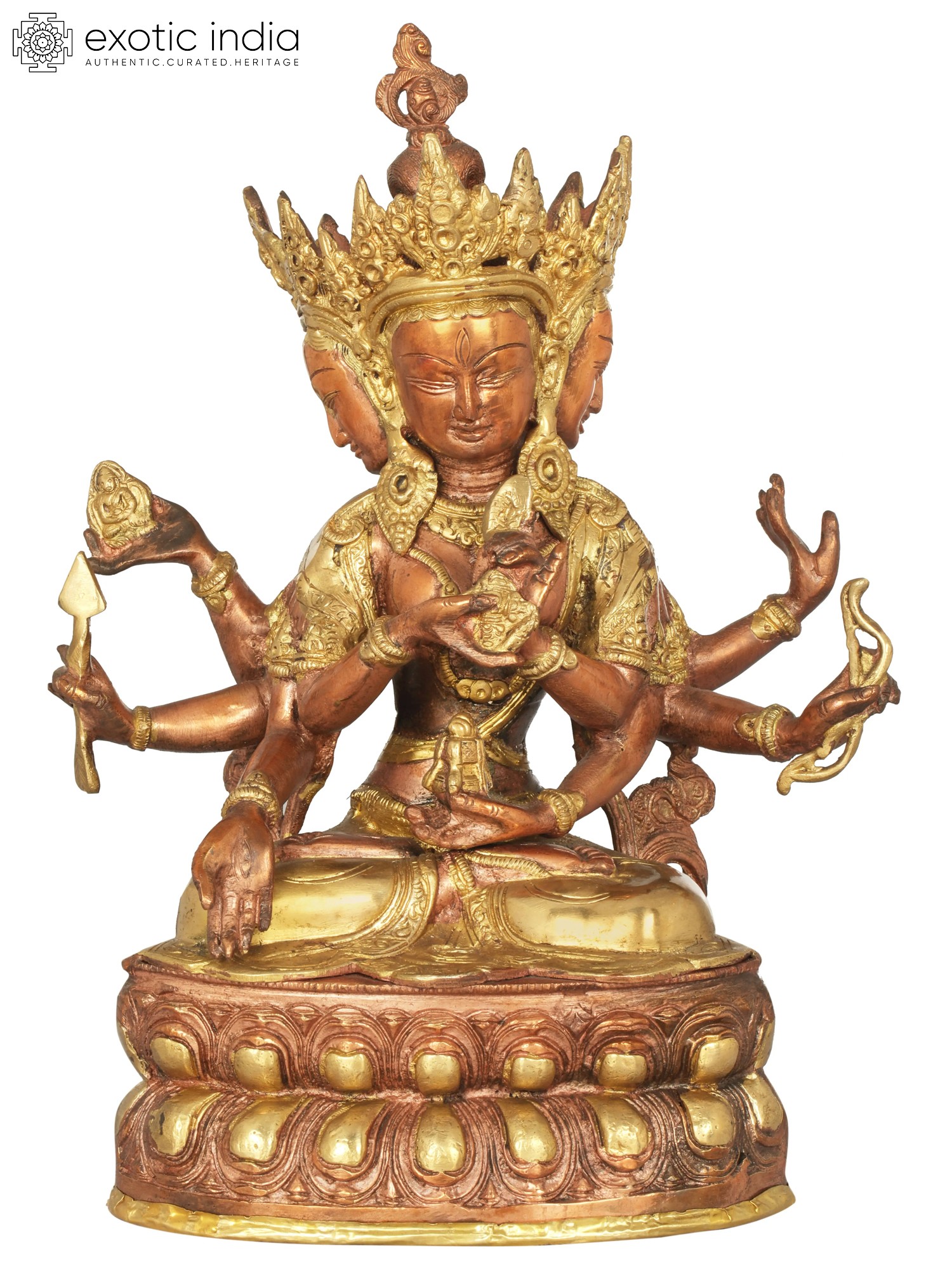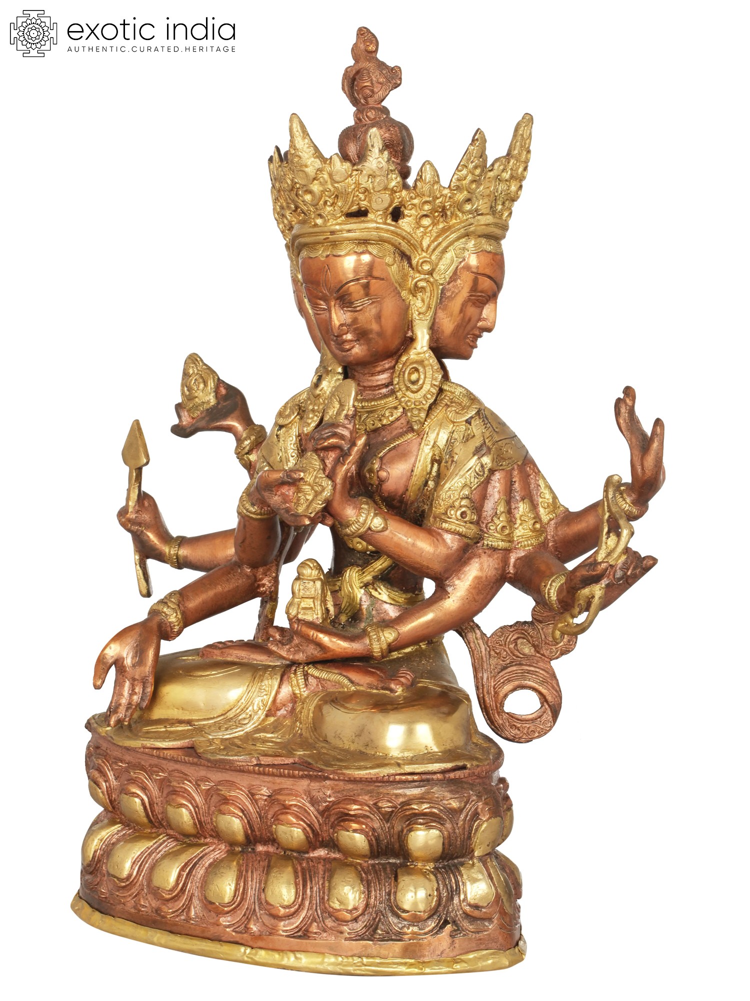In the heart of the Himalayas, where ancient traditions breathe life into sacred art, stands this magnificent brass statue. It depicts Ushnishavijaya, a revered bodhisattva in Tibetan Buddhism, embodying the triumph over death and the cycles of suffering. This exquisite rendition, meticulously handcrafted in India, captures the profound spiritual essence of this powerful deity. Ushnishavijaya, also known as the Goddess Victorious Over Death, is a potent symbol of longevity, purification, and spiritual awakening. In Buddhist cosmology, she is invoked to overcome obstacles, particularly those related to the fear of death and rebirth, and to purify negative karma. Her presence is said to bestow auspiciousness and protection, guiding devotees towards enlightenment and freedom from the ceaseless wheel of Samsara. The multi-headed and multi-armed iconography reflects her multifaceted powers and her ability to perceive and act in countless ways for the benefit of all sentient beings. Each head represents different aspects of wisdom and compassion, while the numerous arms symbolize her boundless capacity to offer aid and blessings.