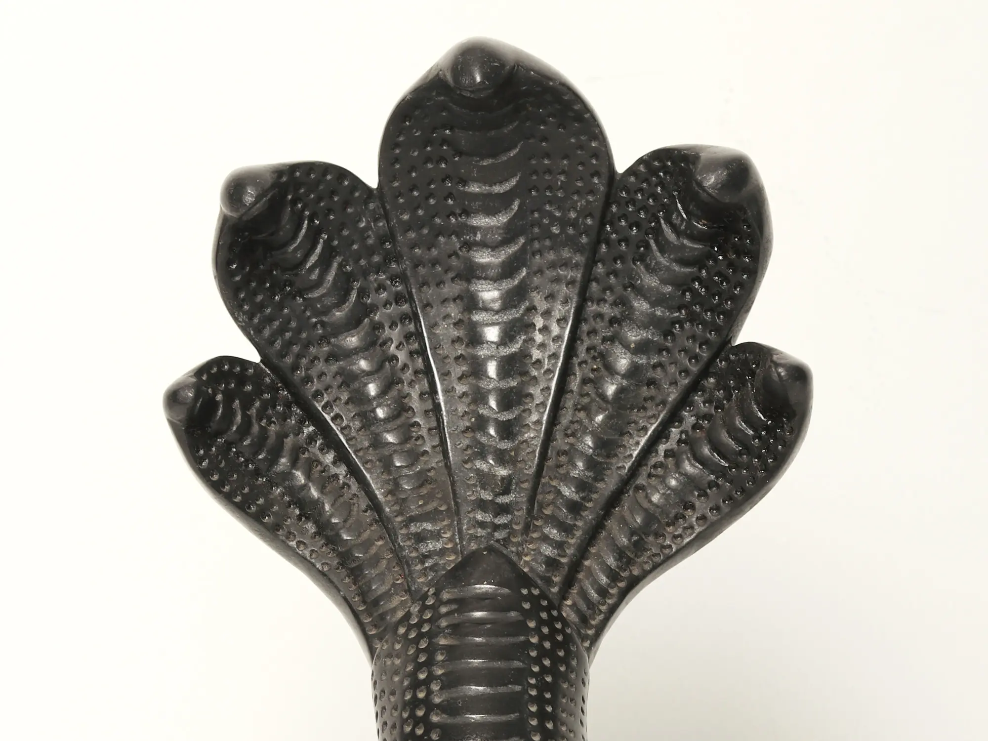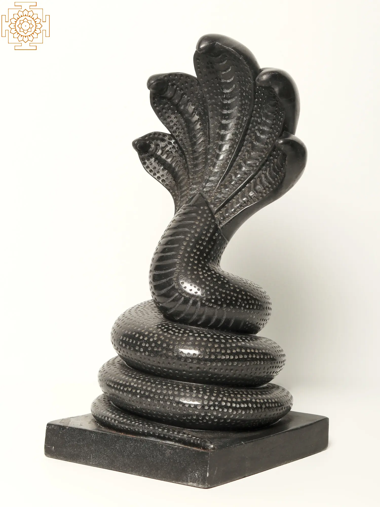The black marble Seshnaag represents a profound symbol of craftsmanship and the embodiment of Lord Vishnu's mighty carrier. This sculpture portrays the serpent as the revered patron of the world, embodying power, protection, and cosmic harmony. The finesse with which the body of Seshnaag is crafted, featuring intricate lines and dots, showcases the artist's attention to detail and mastery of their craft. From a distance, the sculpture resembles an exact representation of Seshnaag, inviting awe and admiration. The perfect symmetry of the five heads signifies balance and equilibrium within the natural world and the divine realm. This black marble Seshnaag serves as a reminder of the interconnectedness of all beings, the significance of cosmic order, and the majestic presence of divine guardianship.