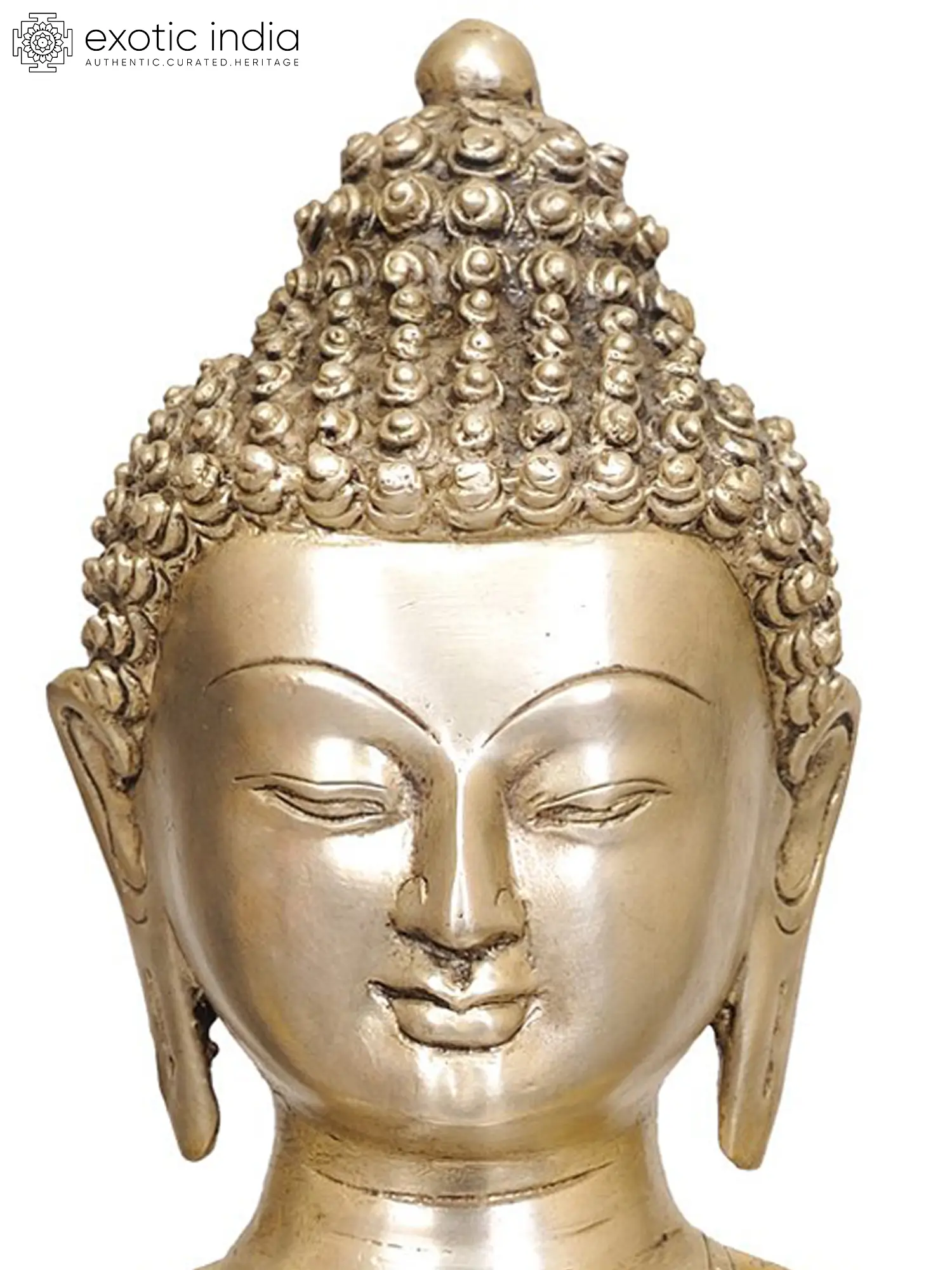 This exquisite 14-inch brass statue captures the essence of peace and enlightenment, depicting the revered Buddha in a meditative posture. Crafted with meticulous detail by skilled artisans in India, this handmade masterpiece is more than just a decorative piece; it is a conduit to tranquility and a symbol of profound spiritual awakening. The lustrous brass forms a solid foundation, reflecting the enduring nature of the Buddha's teachings. ——