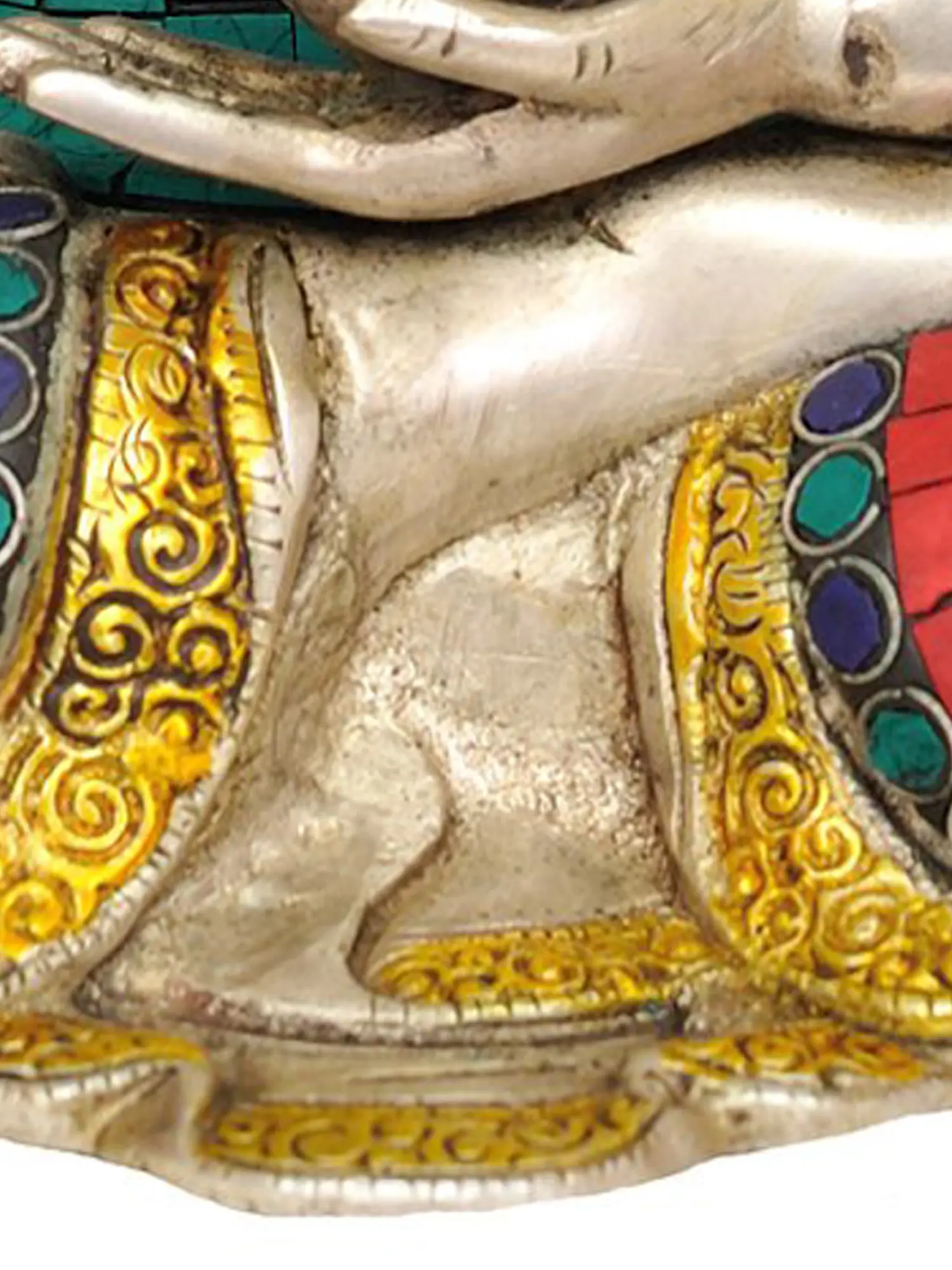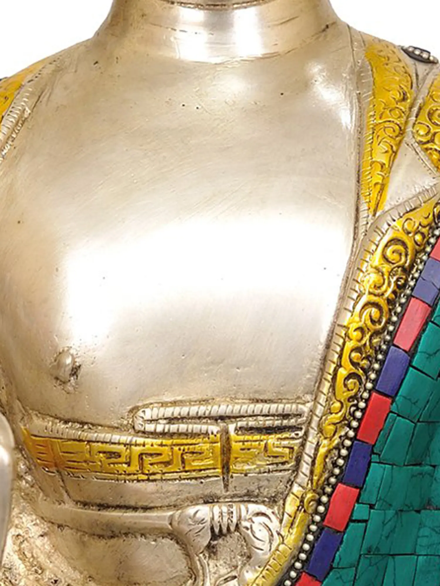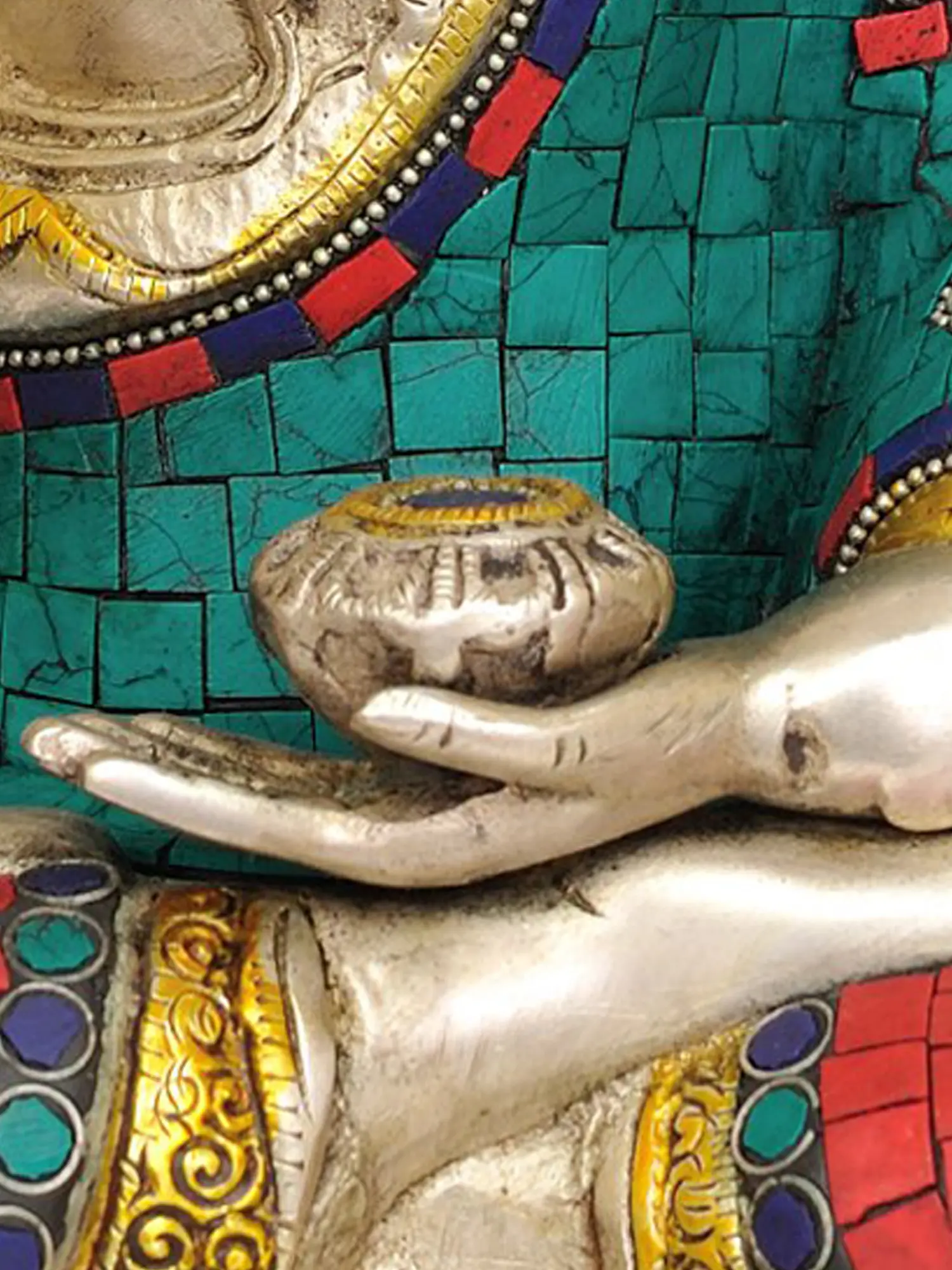 What truly sets this statue apart is the stunning inlay work adorning its robes and lotus seat. Vibrant, meticulously arranged pieces of turquoise and coral bring the brass to life, evoking the rich tapestry of nature and the preciousness of spiritual wisdom. The deep, calming blues and greens of the turquoise are often associated with the heavens and the boundless sky, while the fiery reds of the coral symbolize vitality, protection, and the grounded energy of the earth. This thoughtful combination creates a visually captivating piece that draws the eye and invites contemplation. Delicate gold accents, applied with traditional techniques, further enhance the regal and sacred aura of the deity. ——