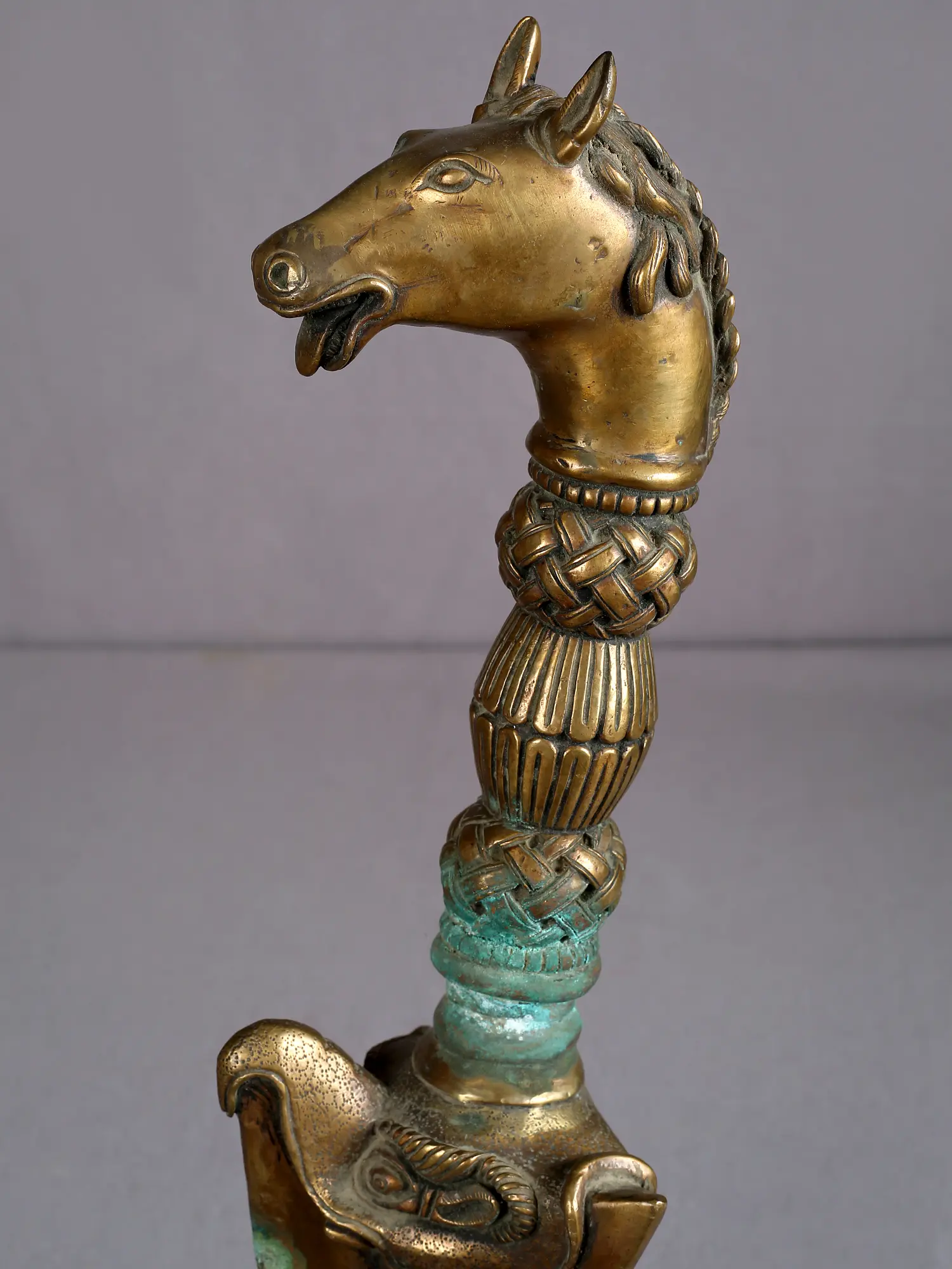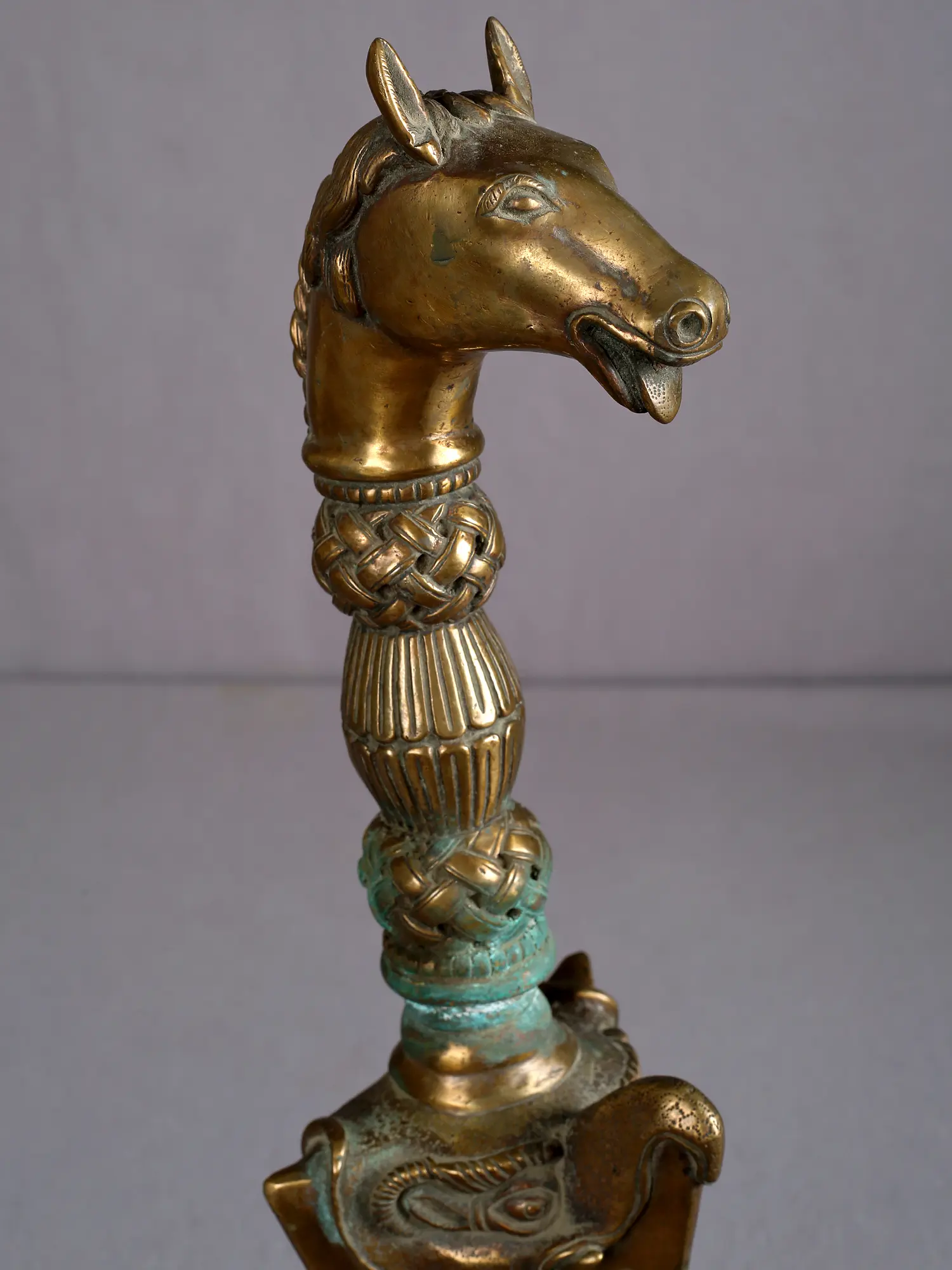 Horsehead Phurba is specifically dedicated to Hayagriva, the wrathful form of Amitabha (Yidam Tamdin). The piercing sound is familiar to anybody who has ever heard a wrathful stallion scream. A stallion’s scream of war causes the wolf group to flee for their lives. Similarly, Hayagriva produces the same force, which is the wrathful form, or emanation of Amitabha— the Buddha of speech. Regardless of Phurba form, entire body form, Thangka form, or visualization, Hayagriva is typically seen with one or more green heads emerging from his flaming hair. Like with Green Tara, the green stands for activity and horse speaking. As in the case of the wish-fulfilling horse, horses also stand for the fulfillment of wishes. Of course, horses are also revered in Nepal, Tibet, and Mongolia.