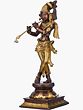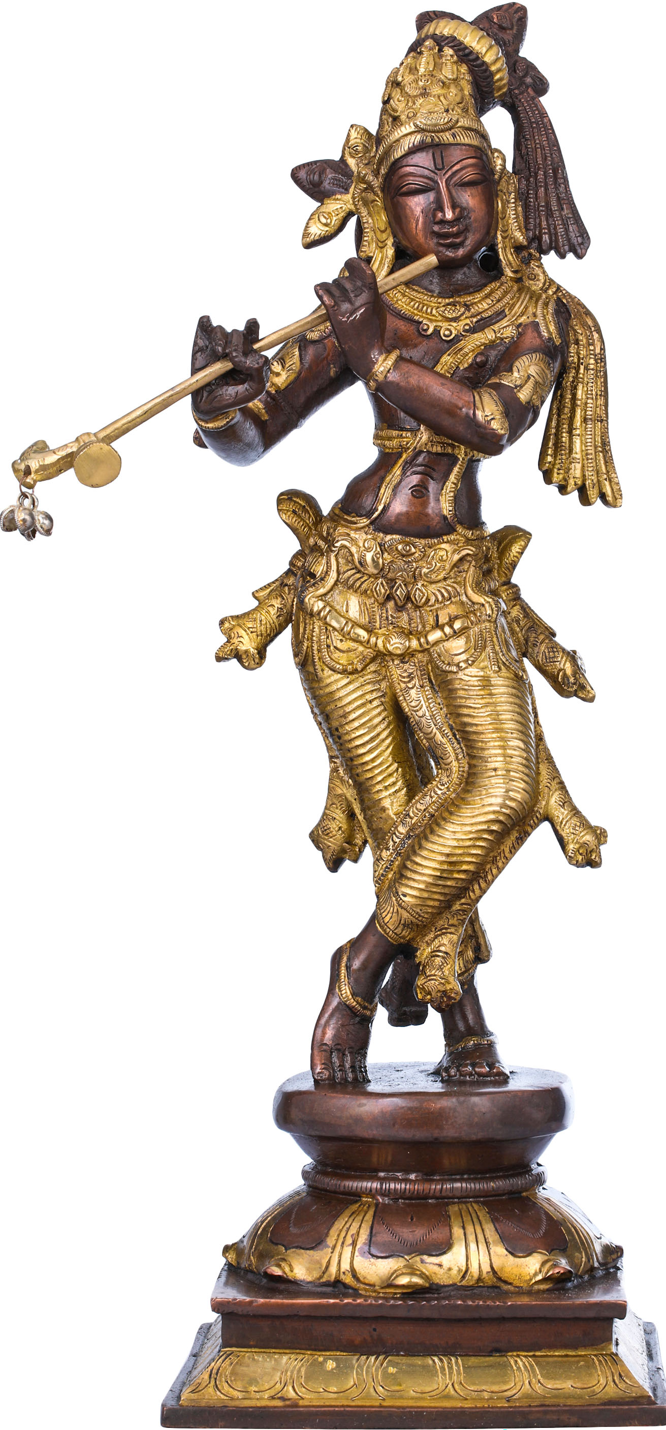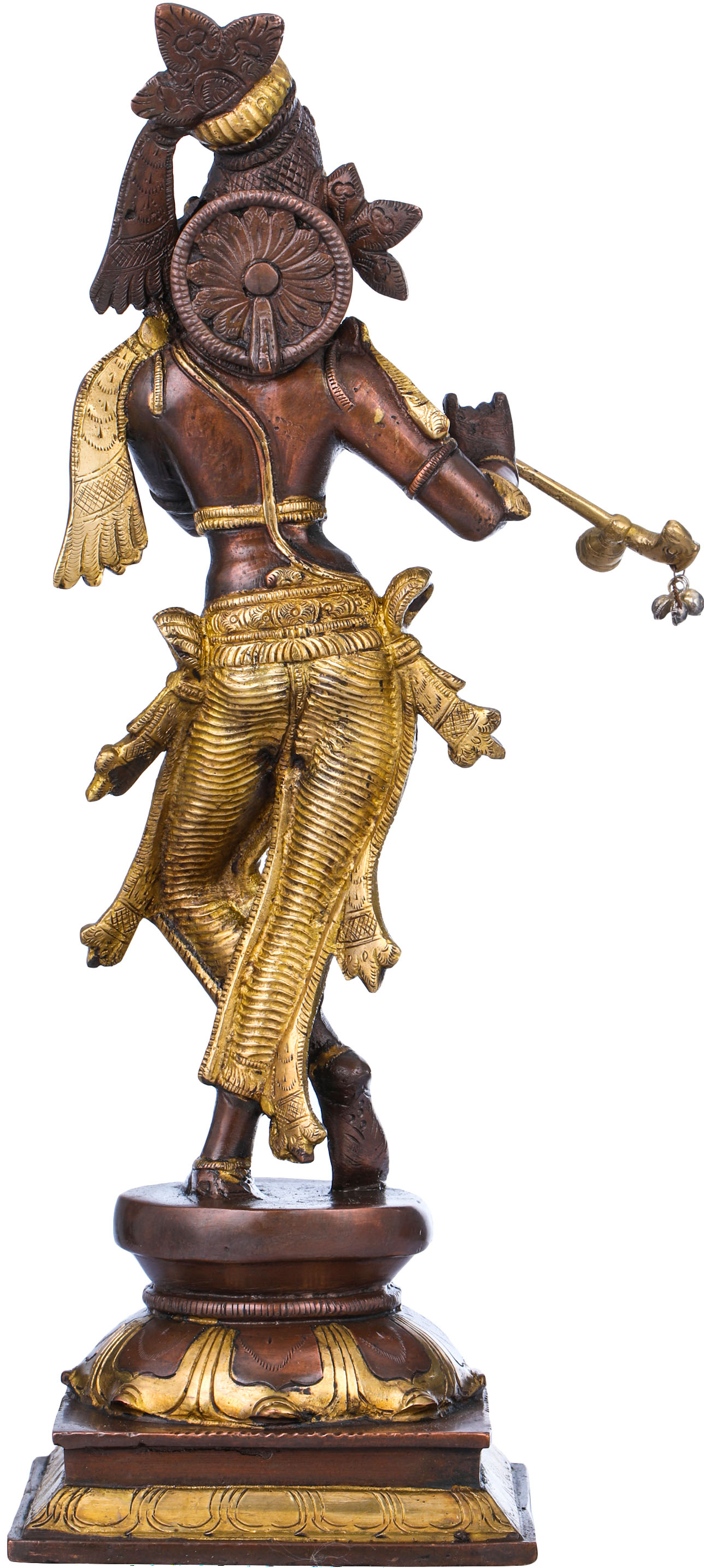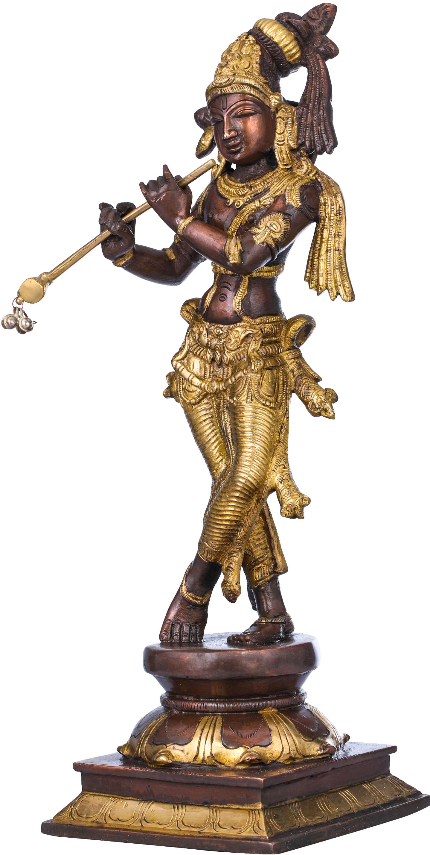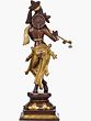 Exquisitely fashioned in lustrous brass, the standing statue of Lord Krishna, accompanied by his divine flute, presents a mesmerizing and captivating representation of this revered deity within the rich tapestry of Hindu tradition. With an air of divine grace and charm, Lord Krishna stands elegantly, playing his enchanting melodies on the sacred flute. The sculpture deftly encapsulates the very essence of Krishna's divine presence, radiating an aura of captivating divinity and eternal allure. This intricately detailed and finely crafted brass statue serves as a remarkable work of art, masterfully capturing the timeless charm and melodious beauty that Lord Krishna embodies, making it a cherished embodiment of spiritual devotion and artistic craftsmanship.