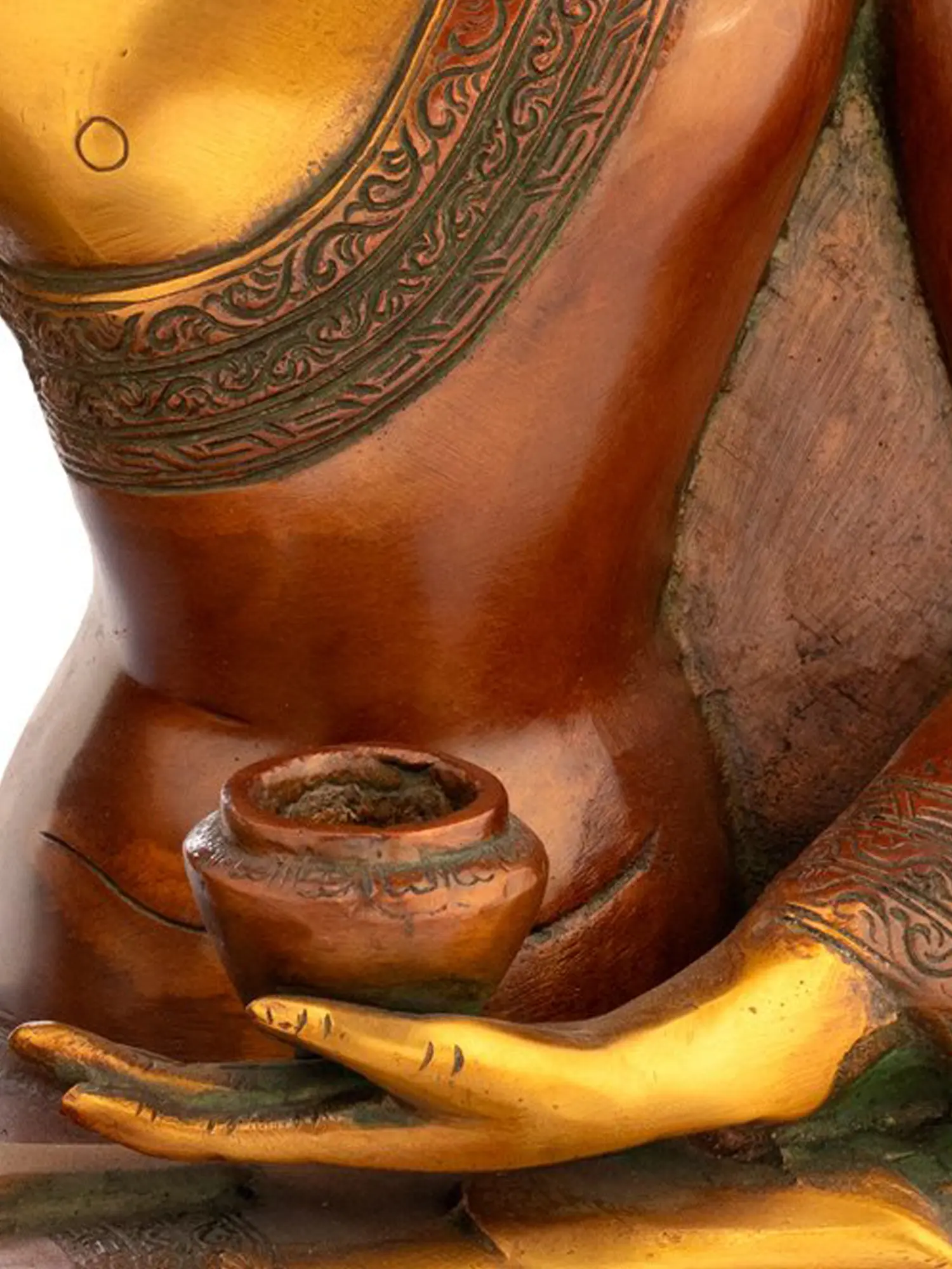 Handmade in India, this statue is a testament to the rich tradition of metal craftsmanship that has flourished on the subcontinent for centuries. The intricate details, the patina that lends an antique feel, and the overall composition speak to a deep understanding of Buddhist iconography and aesthetic principles. Indian artisans have a long-standing tradition of creating sacred objects, passed down through generations, and this sculpture is a beautiful example of that lineage. The casting process, involving molten brass poured into meticulously carved molds, requires immense precision and dedication. The result is a piece that is not only visually stunning but also spiritually resonant, intended to inspire devotion and contemplation.
