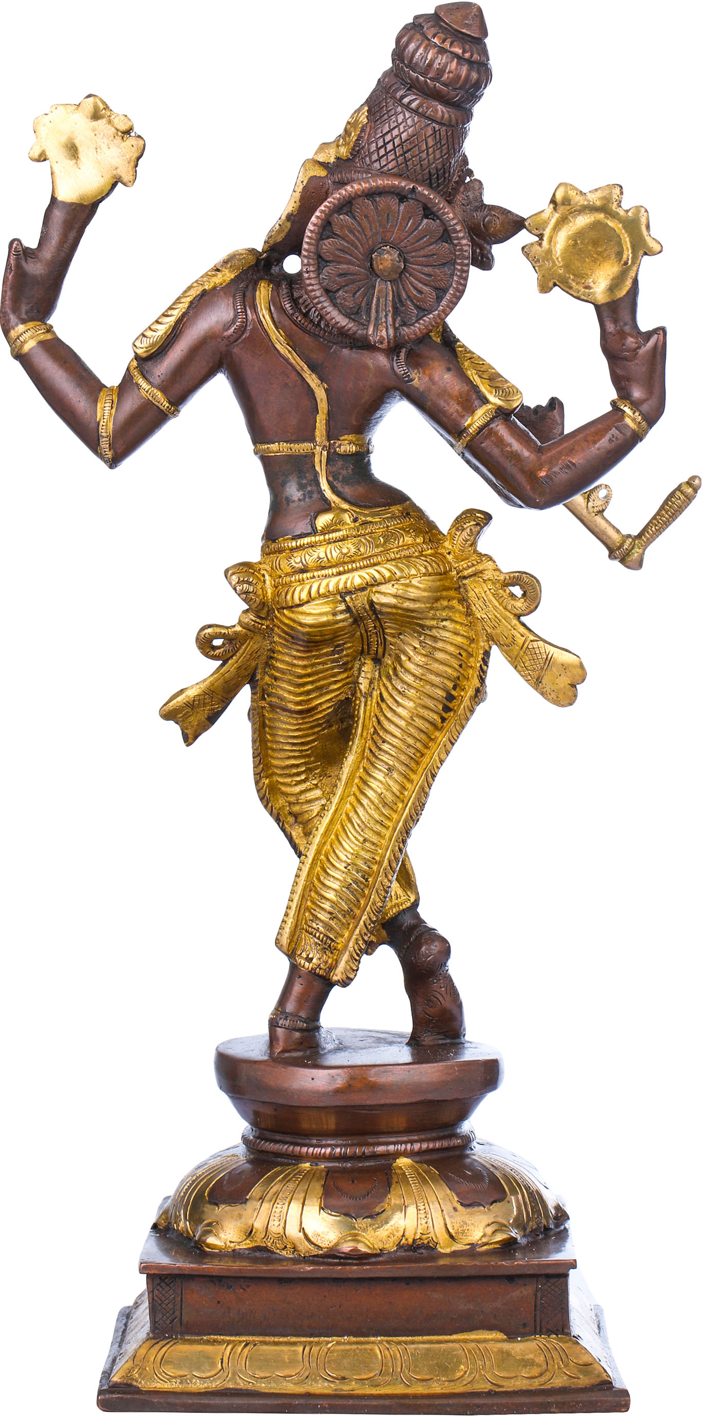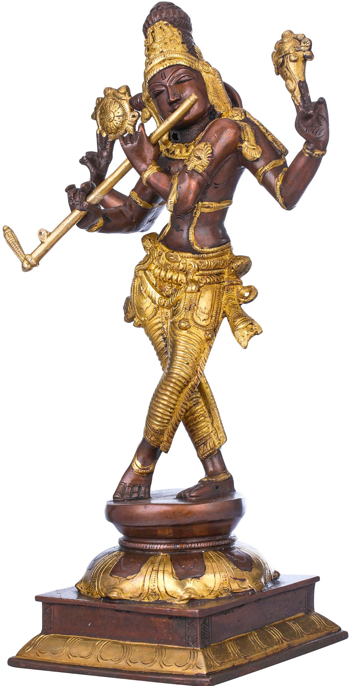 This statue, a brass-piece, shows Krishna as playing on his flute. This pure aesthetic visualization is aimed at revealing beauty and delighting thereby, but the mysticism that this flute-playing form of him generates is also quite significant. The flute, a material means, creates a ‘bhava’, an ecstatic sentiment which is all divine and abstract, and this ecstatic divinity leaves the flute player transformed, and again, this spiritual transformation reveals as rhythm manifesting in the body. ‘Material’ being the source of ‘spiritual’, and ‘spiritual’, manifesting in ‘material’, is the essence of Krishna’s Vaishnavism, which this divine image thrusts.