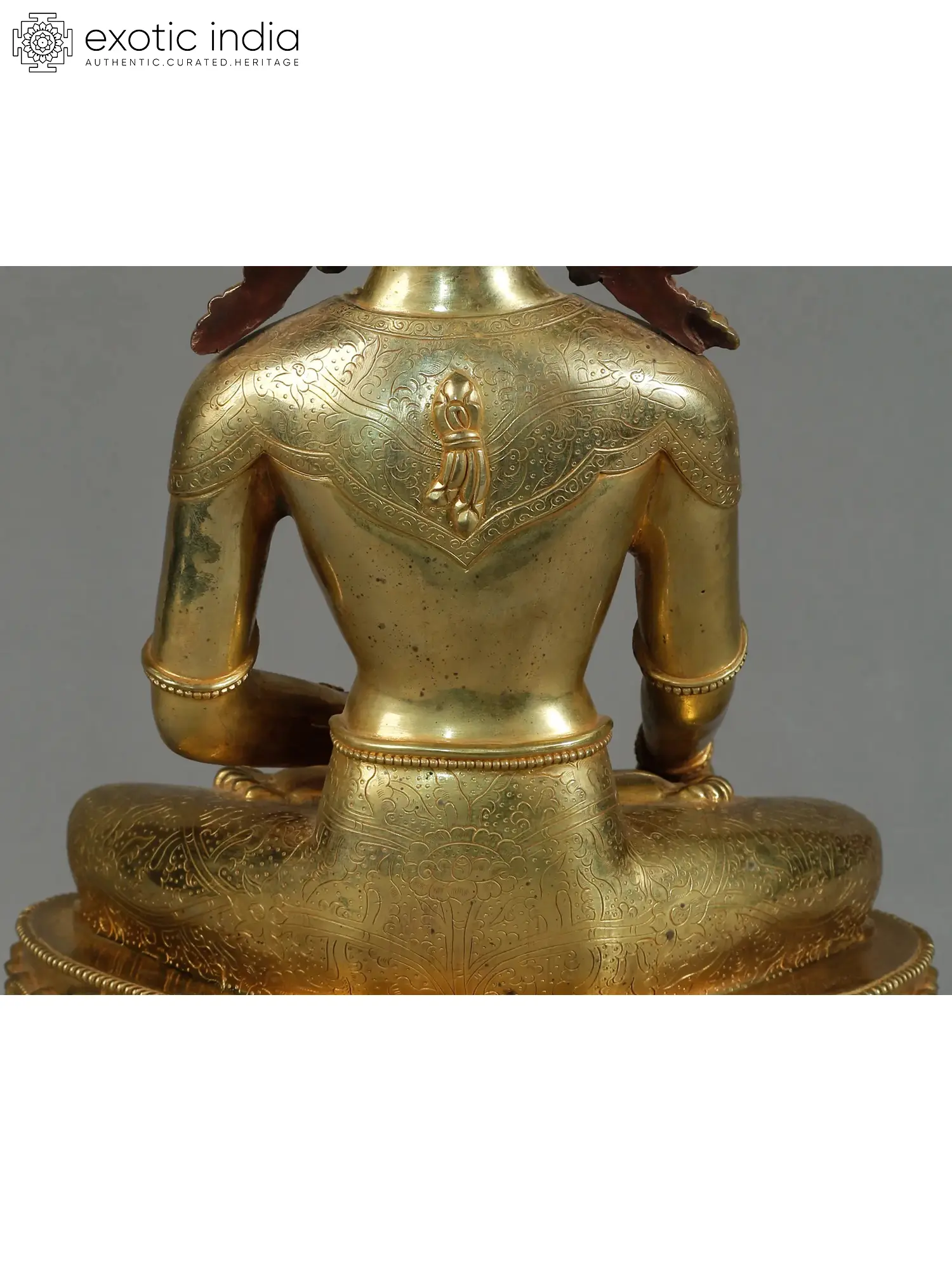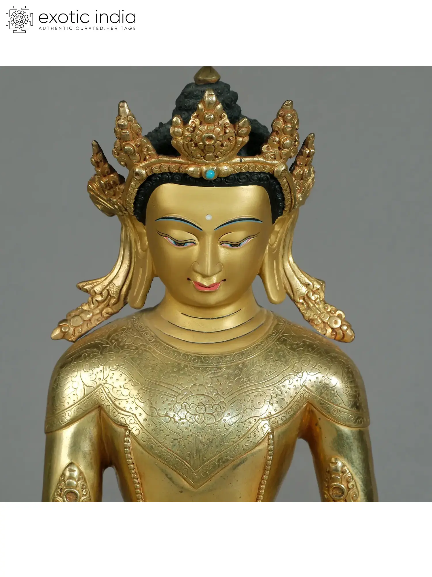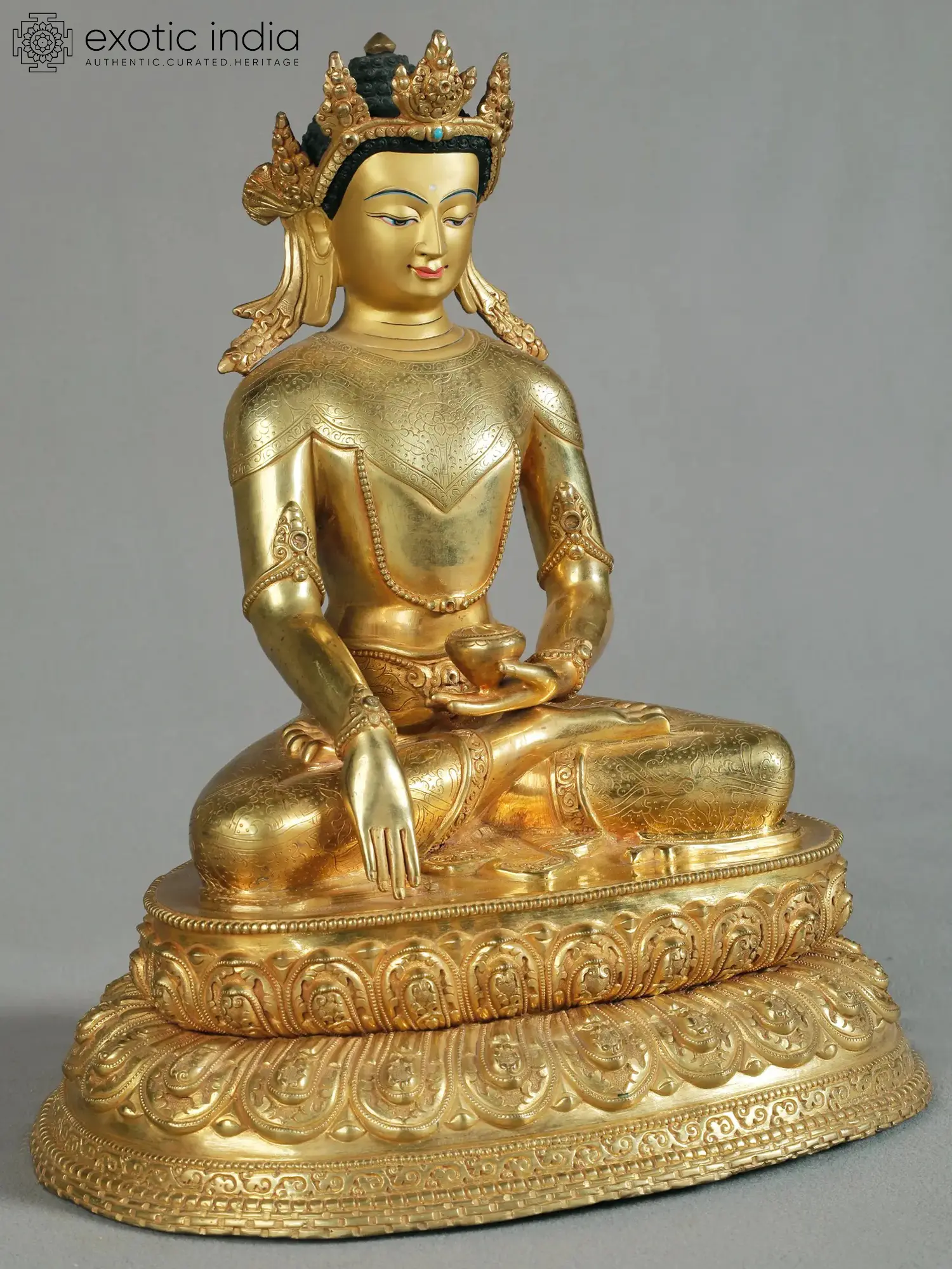 A true masterpiece from Nepal, this artwork showcases Crowned Buddha's princely demeanor and his poignant connection to wisdom. The statue of Crowned Buddha is intricately detailed carving on a copper body, and gold gliding provides an excellent sheen. He is depicted seated atop a moon disc lotus with serenity and tranquility. He holds an alms bowl in his right hand over his lap while doing “Bhumiprasa mudra” an intricate of Buddha’s attainment of enlightenment.