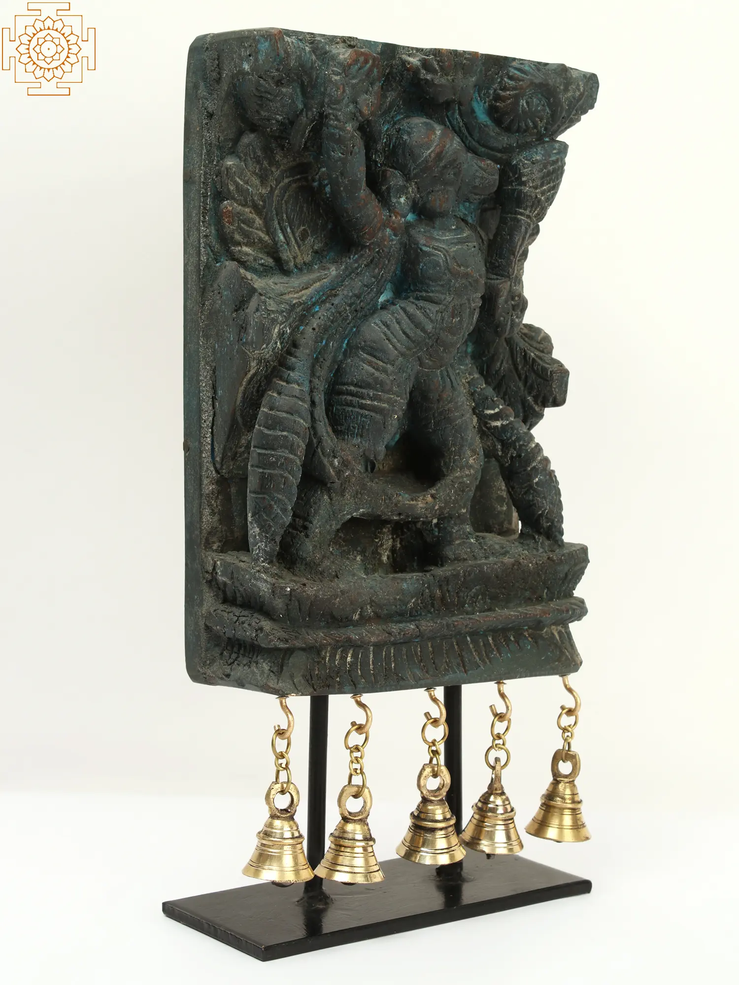 Lord Hanuman, the divine embodiment of unwavering devotion and boundless strength, captures hearts with his mesmerising essence. Handcrafted from rich, polished wood, every contour exudes artistry and devotion. The intricately carved deity stands as a testament to timeless craftsmanship, bearing the weight of tradition on its sturdy shoulders. Adorned with dangling brass bells, each melodious chime resonates like a celestial hymn, beckoning the soul to reverence. As sunlight dances upon the wood, it reveals the deity’s benevolent countenance, suffused with grace and compassion. In its silent eloquence, this artwork whispers tales of faith and serenity, casting a spell of spirituality.