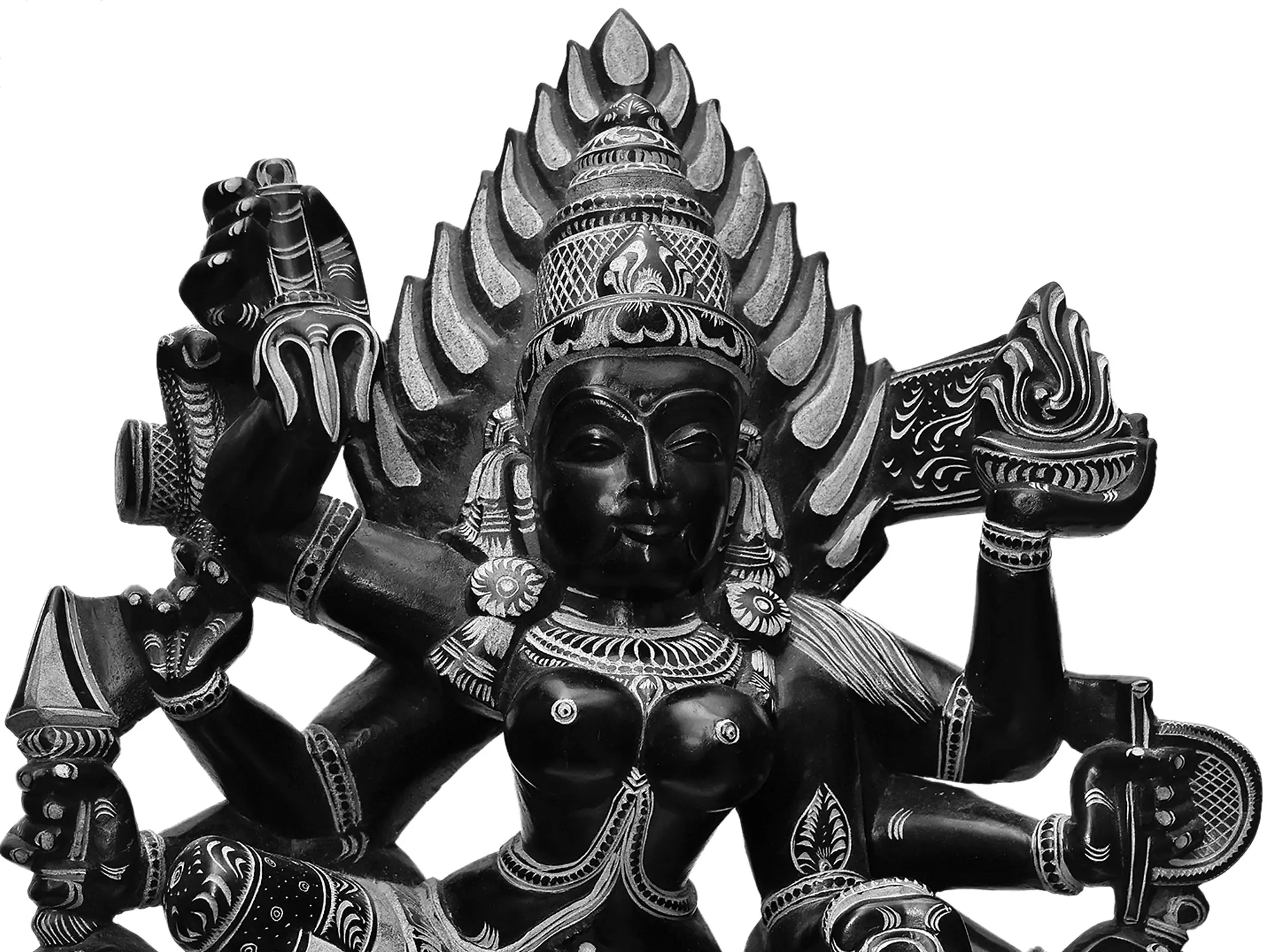 This may be a relatively calm portrayal of Kali. This is despite the skullcup and the severed head, in addition to all the weaponry. The limestone medium allows for considerable detailing of anatomy and adornment, bringing out the personal beauty of Devi Kali.