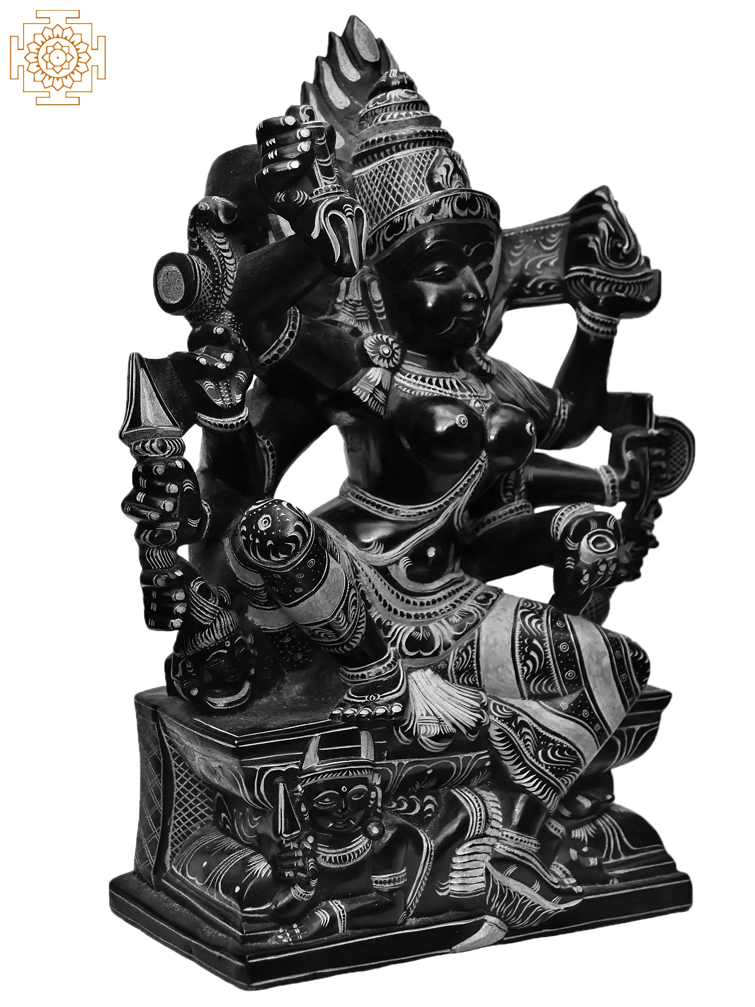 As such, the Kali that you see on this page, by virtue of being carved from the naturally jet black Kadappa stone, is a beautifully accurate iconography. She is the ashtabhujadharini and is seated in lalitasana, with a wrathful demi-deity at Her feet.